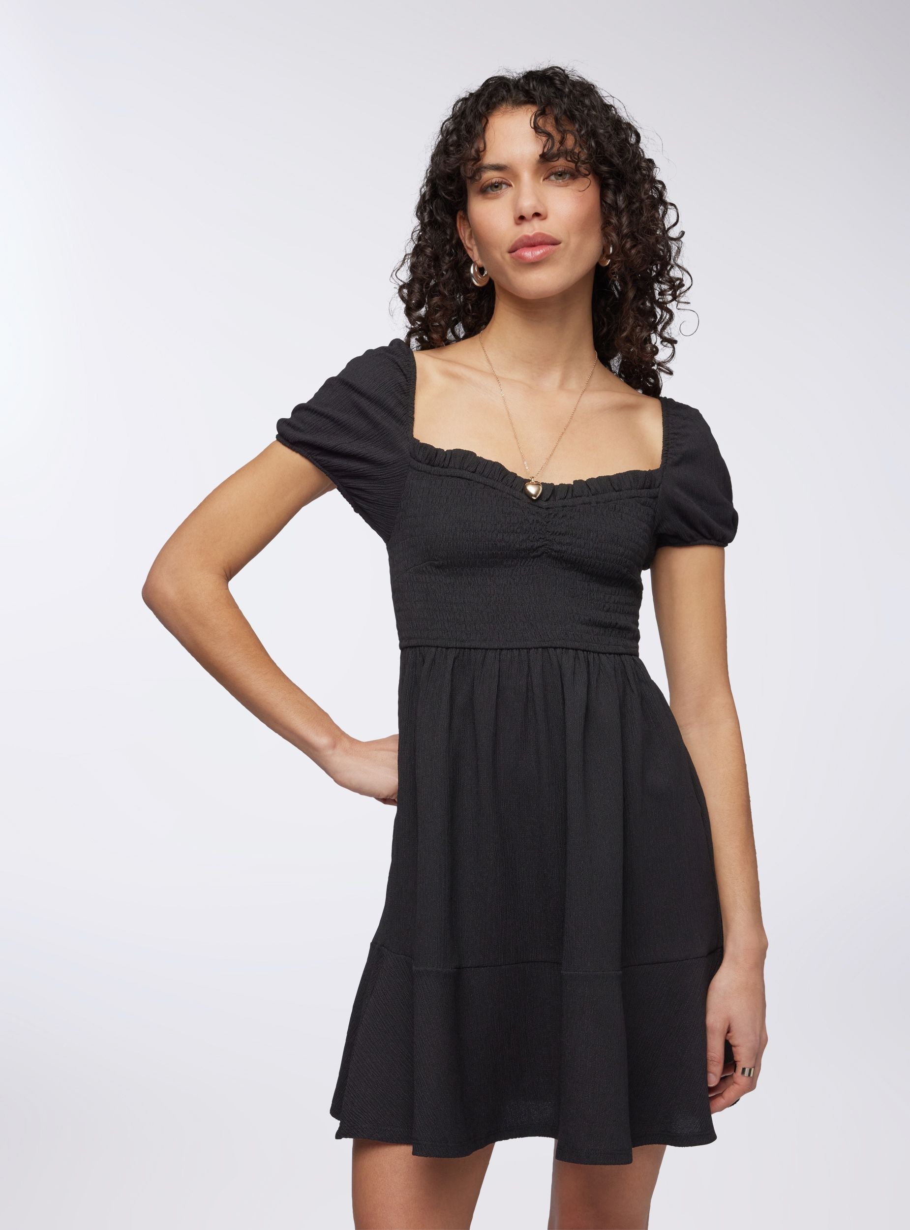 Abito da donna corto a tinta unita, caratterizzato da un elegante punto smock che avvolge il busto, garantendo aderenza e comfort. Le maniche corte aggiungono un tocco femminile e romantico al design, donando un effetto leggermente voluminoso che valorizza la figura. Il fondo dell'abito presenta una gonna morbida e svasata, ideale per creare movimento e leggerezza. Perfetto per un look casual e fresco, questo abito unisce semplicità e stile, risultando adatto per diverse occasioni estive grazie alla sua versatilità e al comfort che offre.Detalji