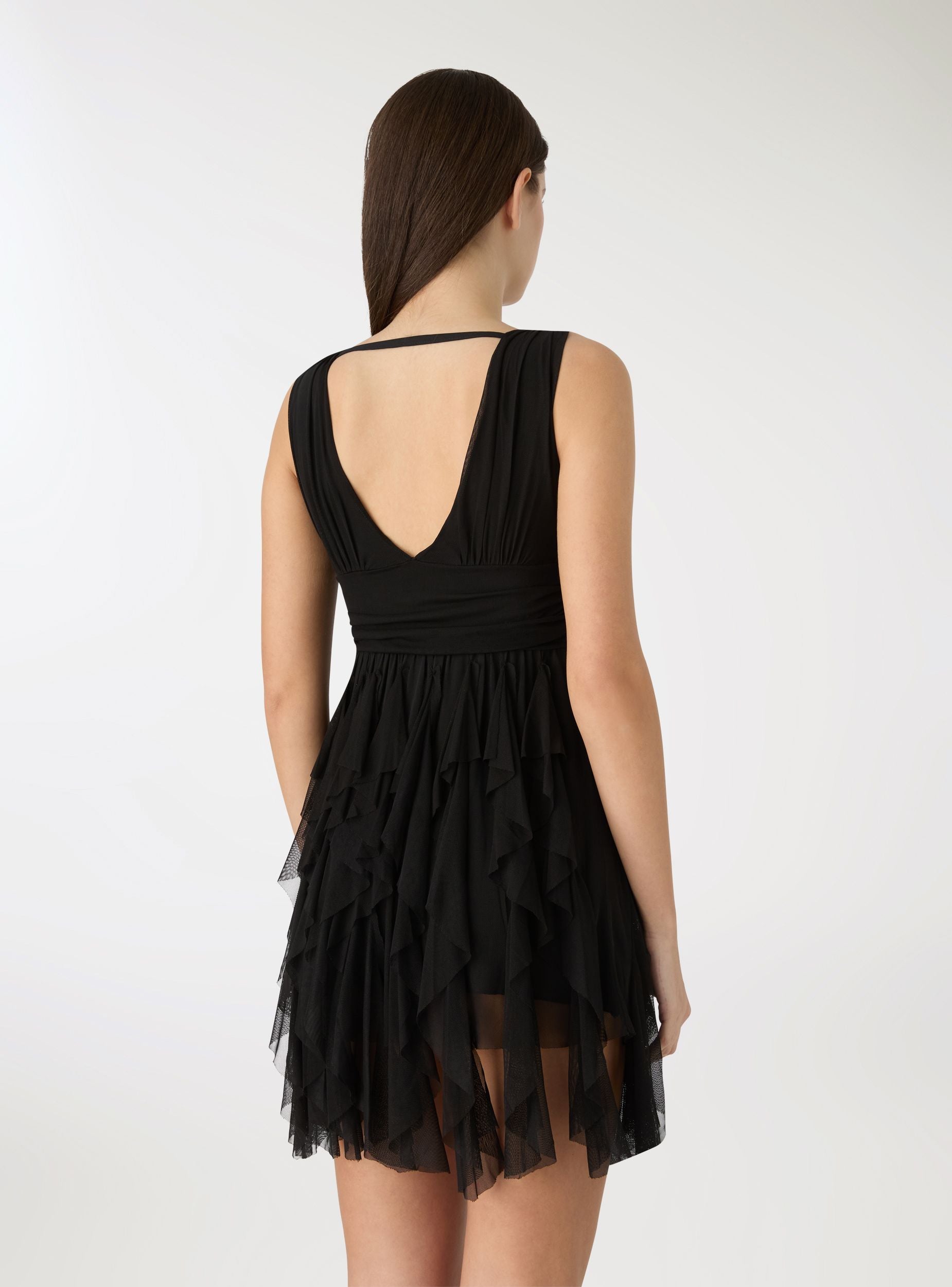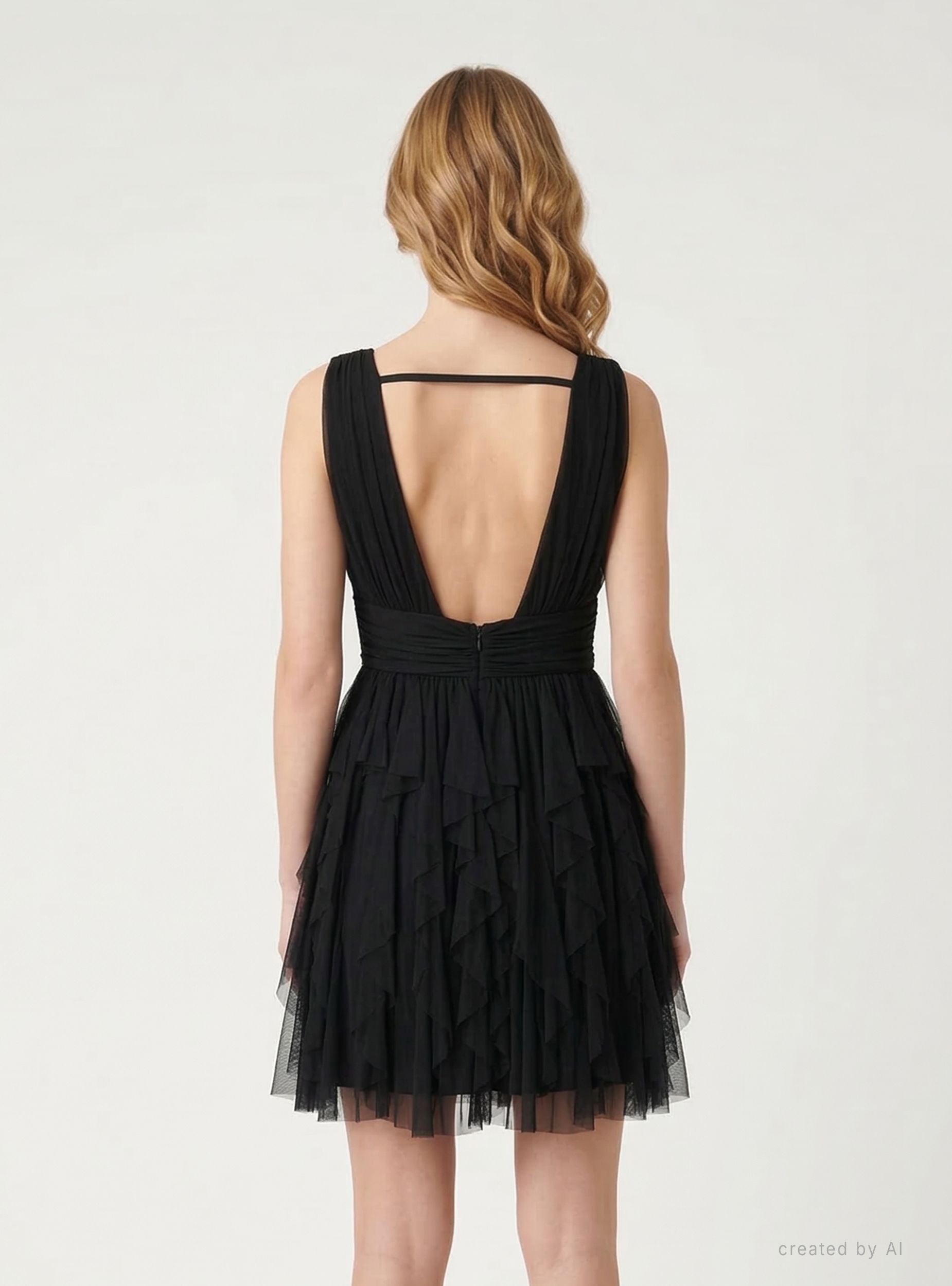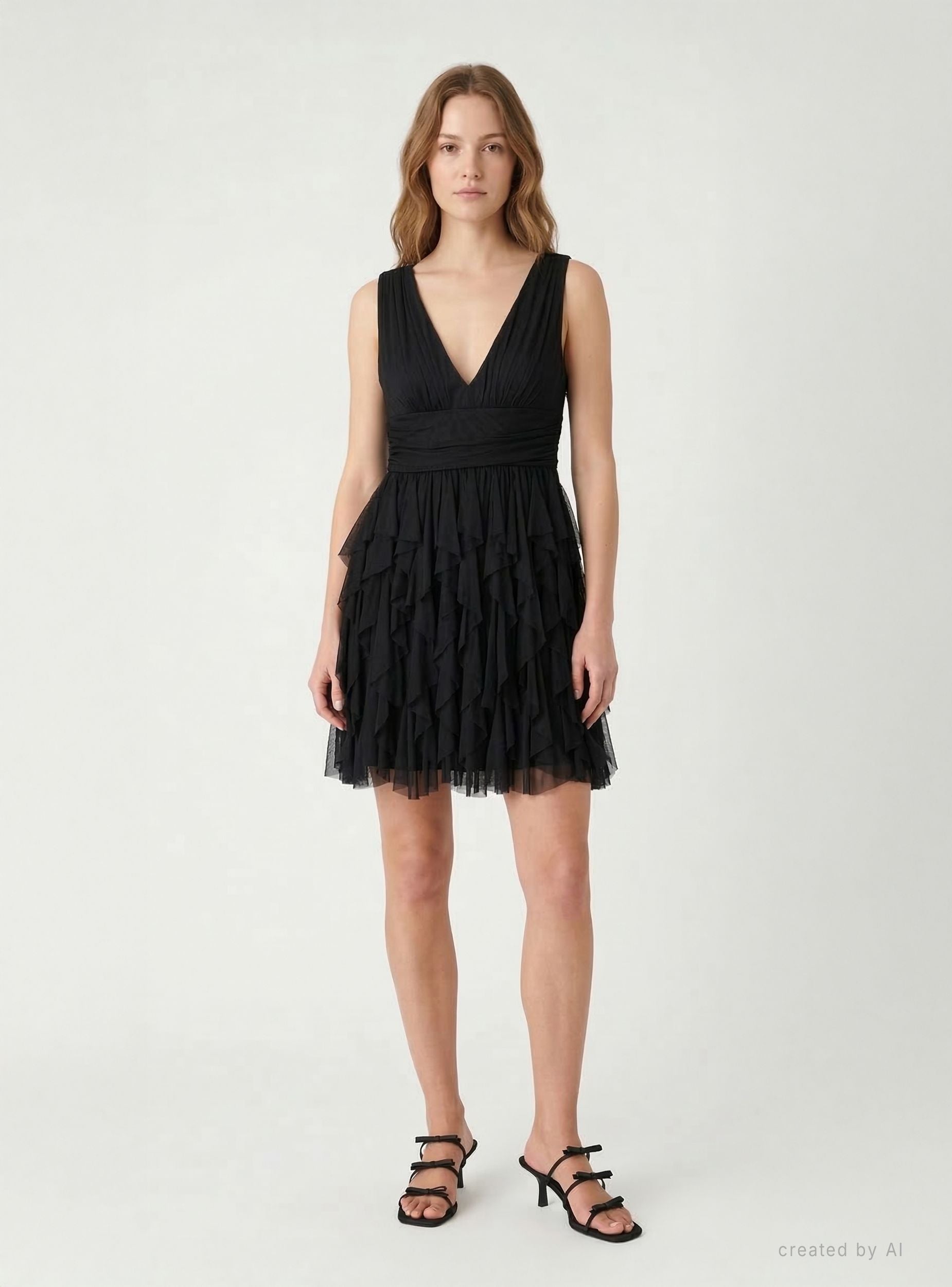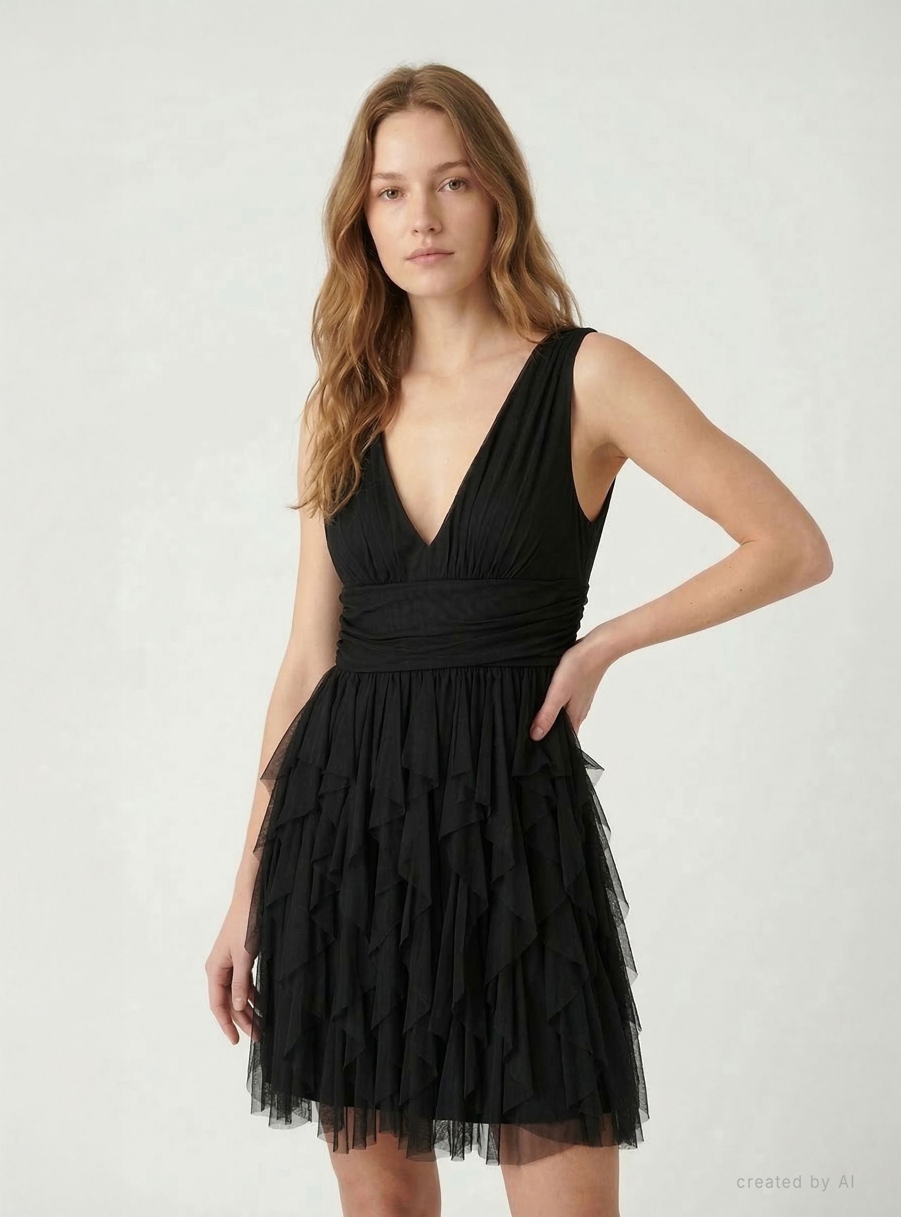 Ženska haljina u jednobojnoj varijanti sa V-izrezom i širokim bretelema, ukrašena pojasom u struku koji ističe siluetu. Mini suknja bogata je karnerima od tila koji stvaraju pokret, savršena za večernje izlaske, zabave ili posebne prilike. Može se kombinovati sa sandalama na štiklu i malom torbicom za elegantan izgled, ili sa blejzerom za sofisticirani dodir. Bočno zatvaranje sa skrivenim rajsferšlusom.Detalji