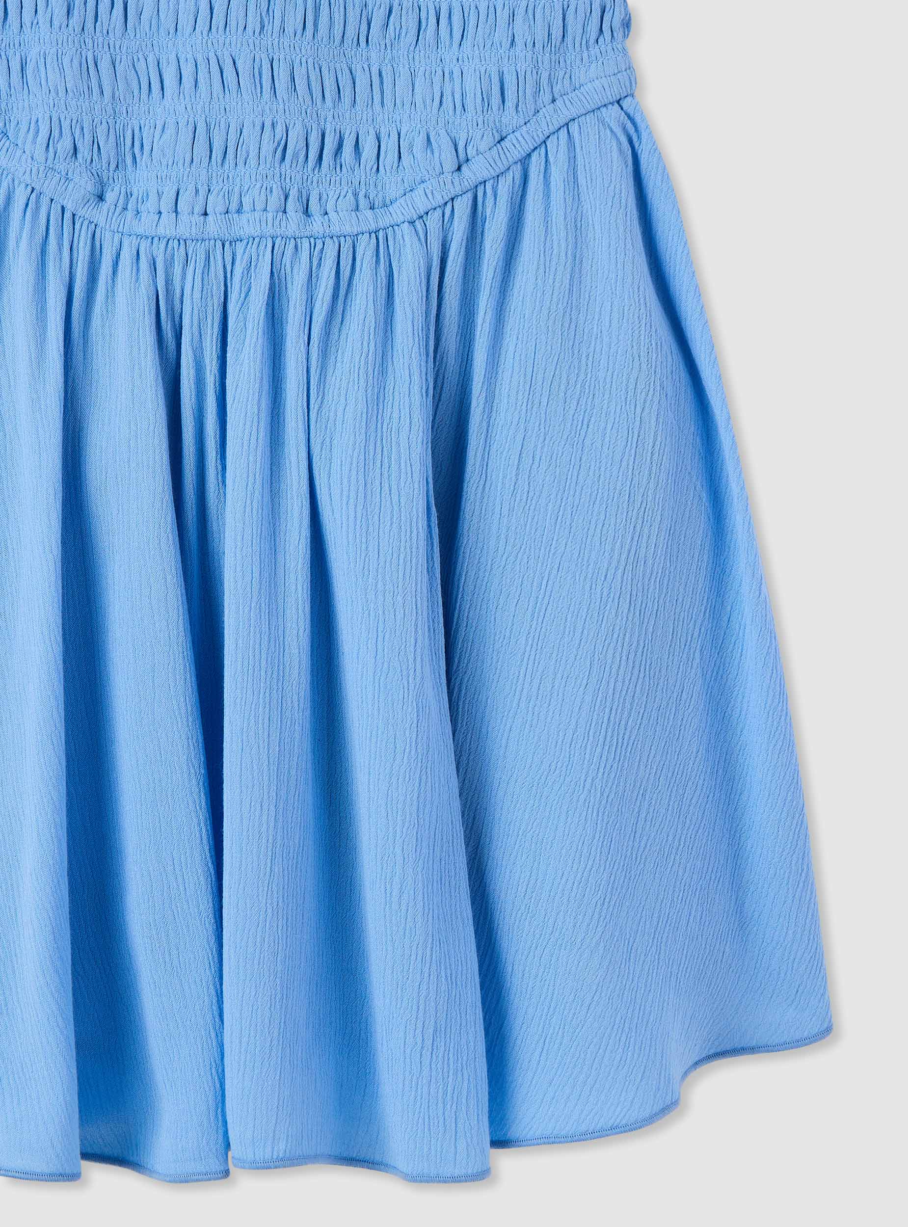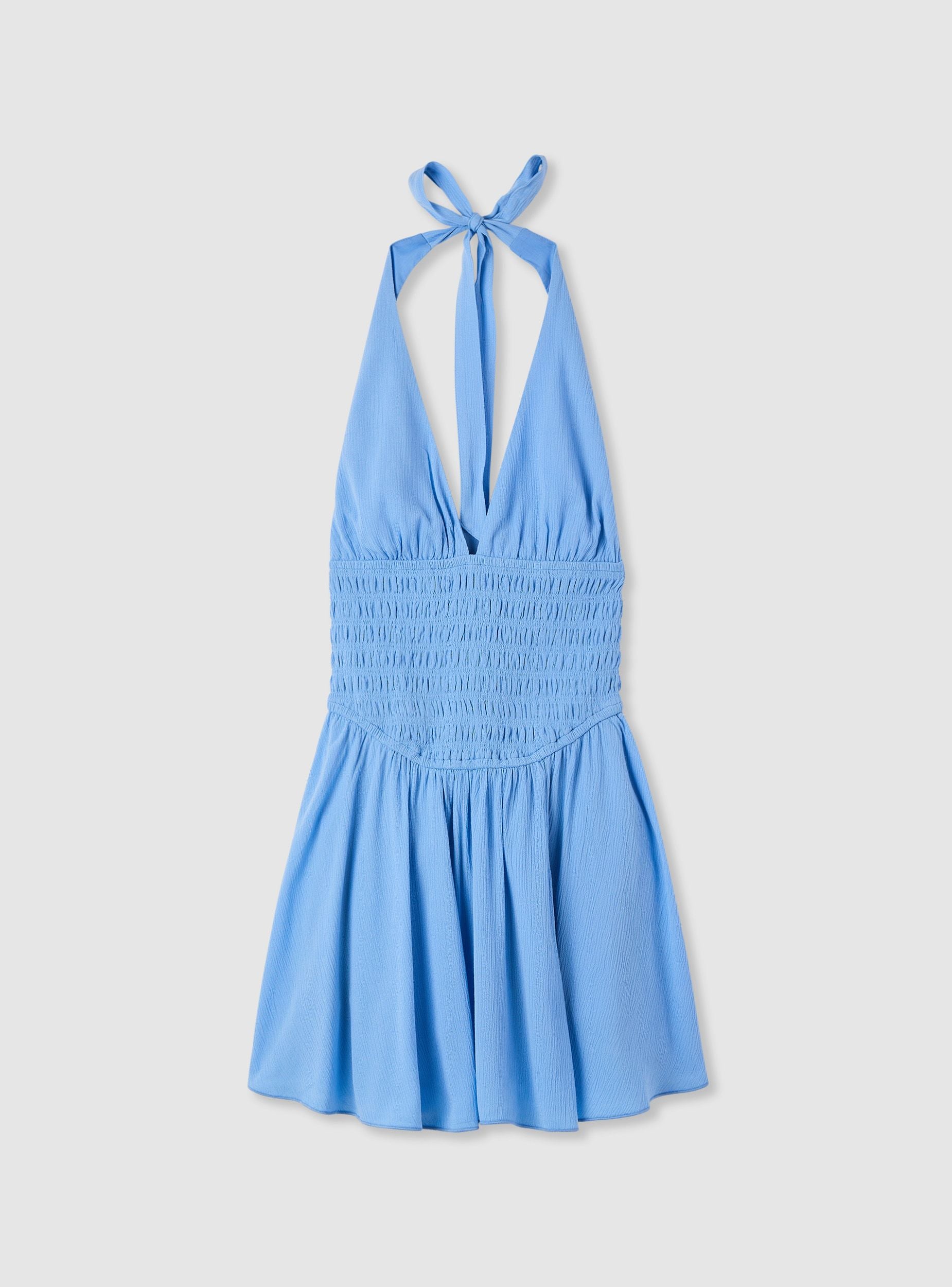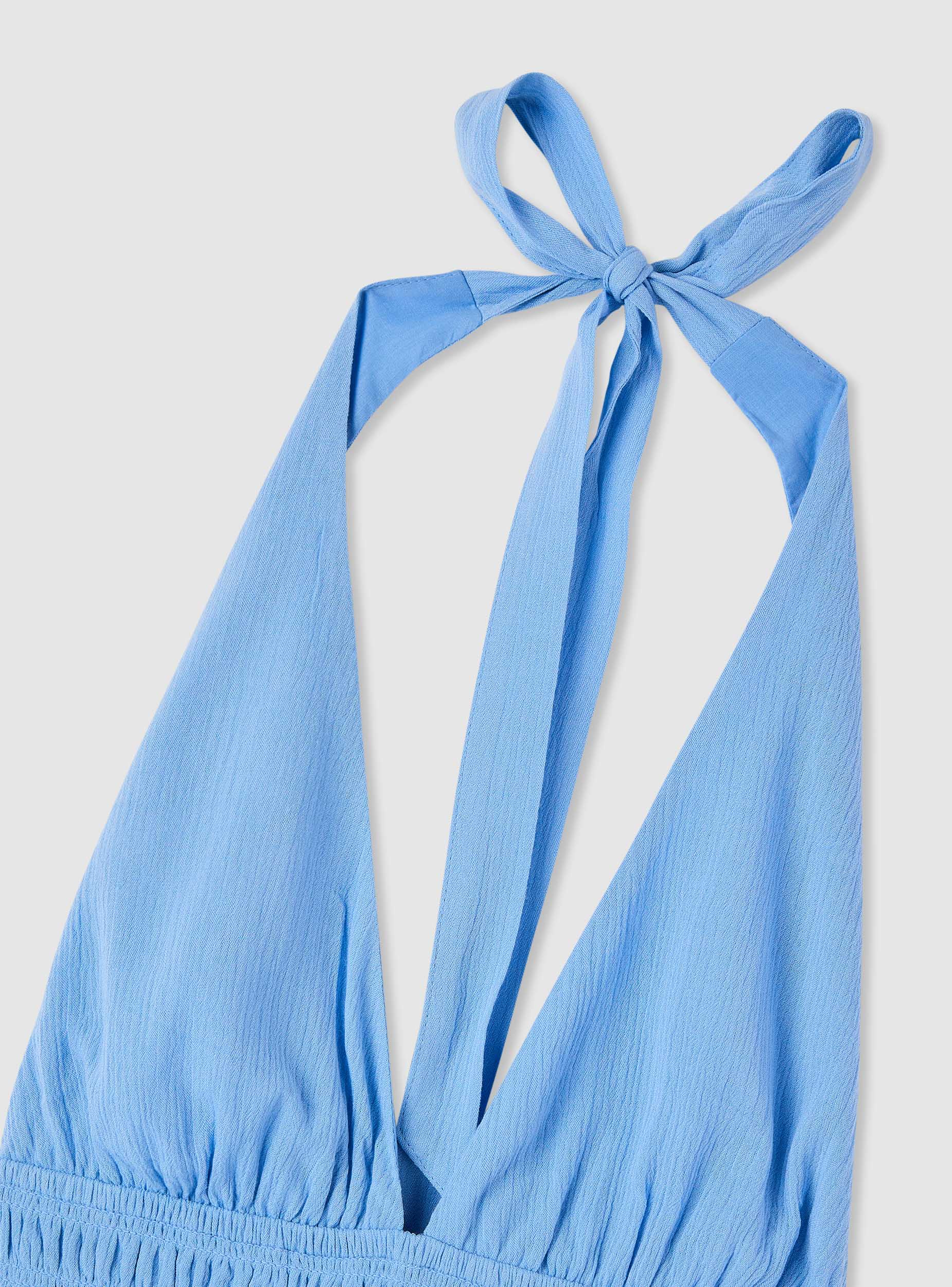 Ženska jednobojna kombinezonka sa letnjim duhom, sa halter izrezom i vezivanjem oko vrata koje ostavlja leđa otkrivenim. Naborani korset sa elastikom ističe liniju i obezbeđuje udobnost, dok široka suknja stvara pokret. Idealna uz sandale i torbu na rame za dan ili sa sofisticiranijim dodacima za veče.Detalji