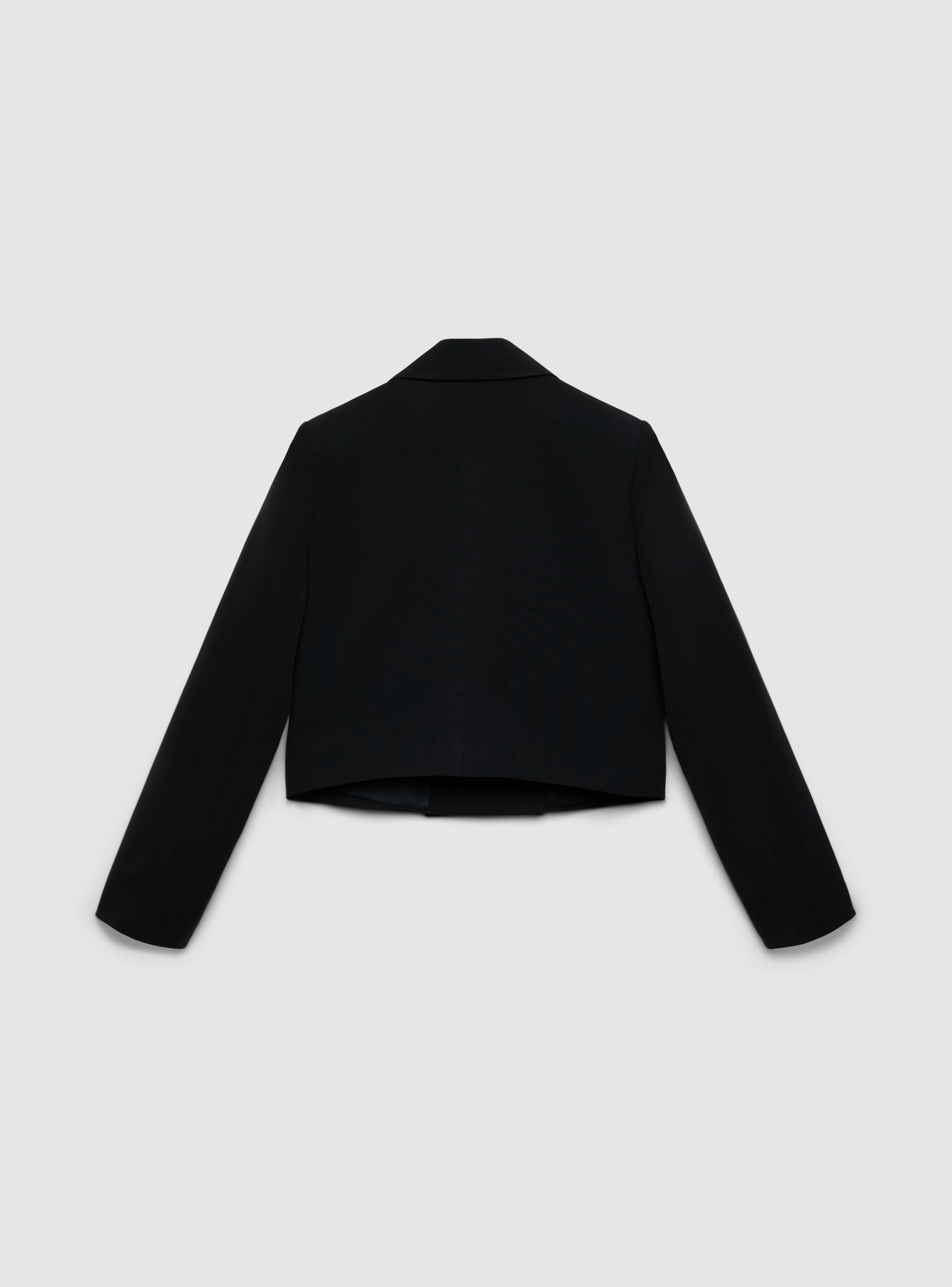 Ženska crop jakna u jednobojnoj varijanti sa reverima u obliku koplja i dvorednim kopčanjem. Kratki kroj ističe struk. Idealna od jutra do večeri, uz farmerke sa visokim strukom za urbani izgled ili sa krojenim pantalonama i salonkama za kancelariju i događaje. Dugi rukavi, postava iznutra i uredna konstrukcija. Dva prednja dugmeta i blago zaobljen zadnji deo za moderan i ženstven kroj.Detalji