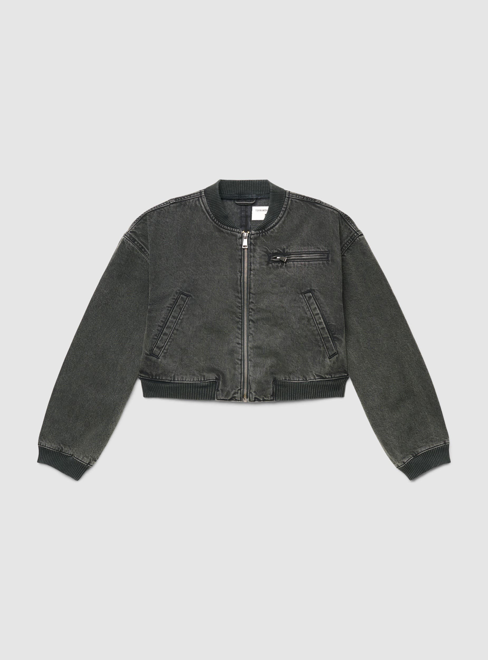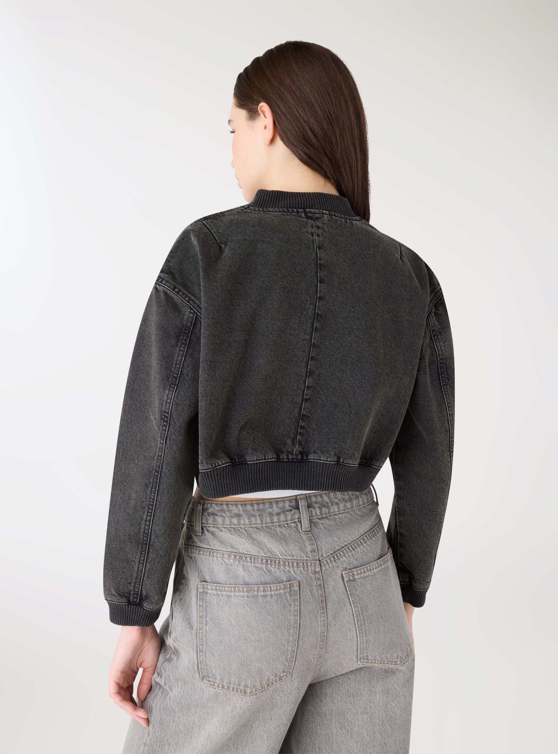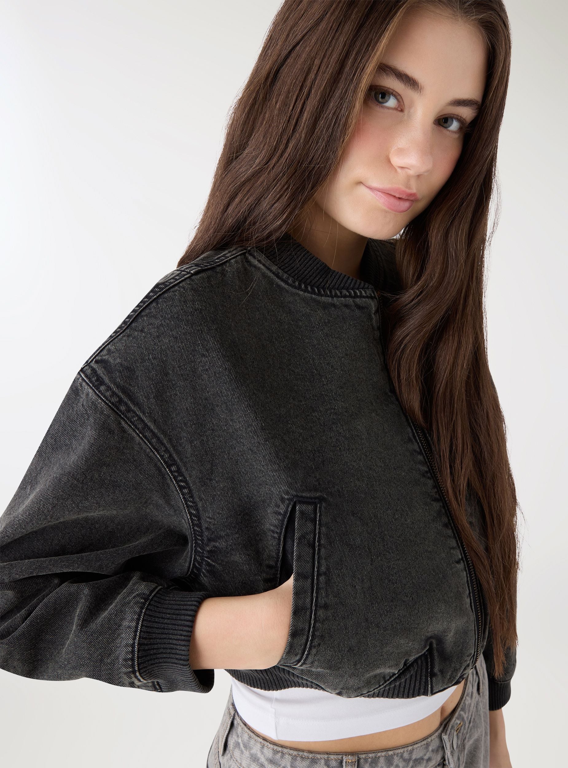 Ženski bomber od teksasa u jednoj boji, kratkog kroja i regularnog kroja. Okrugli izrez od pletenine, elastični manžeti i donji deo za udobno pristajanje. Prednje zatvaranje na rajsferšlus i bočni džepovi plus džep sa rajsferšlusom na grudima. Savršen za urbani izgled preko majice i farmerki ili za balansiranje midi haljina, idealan za prelazne sezone zahvaljujući praktičnom i svestranom dizajnu.Detalji