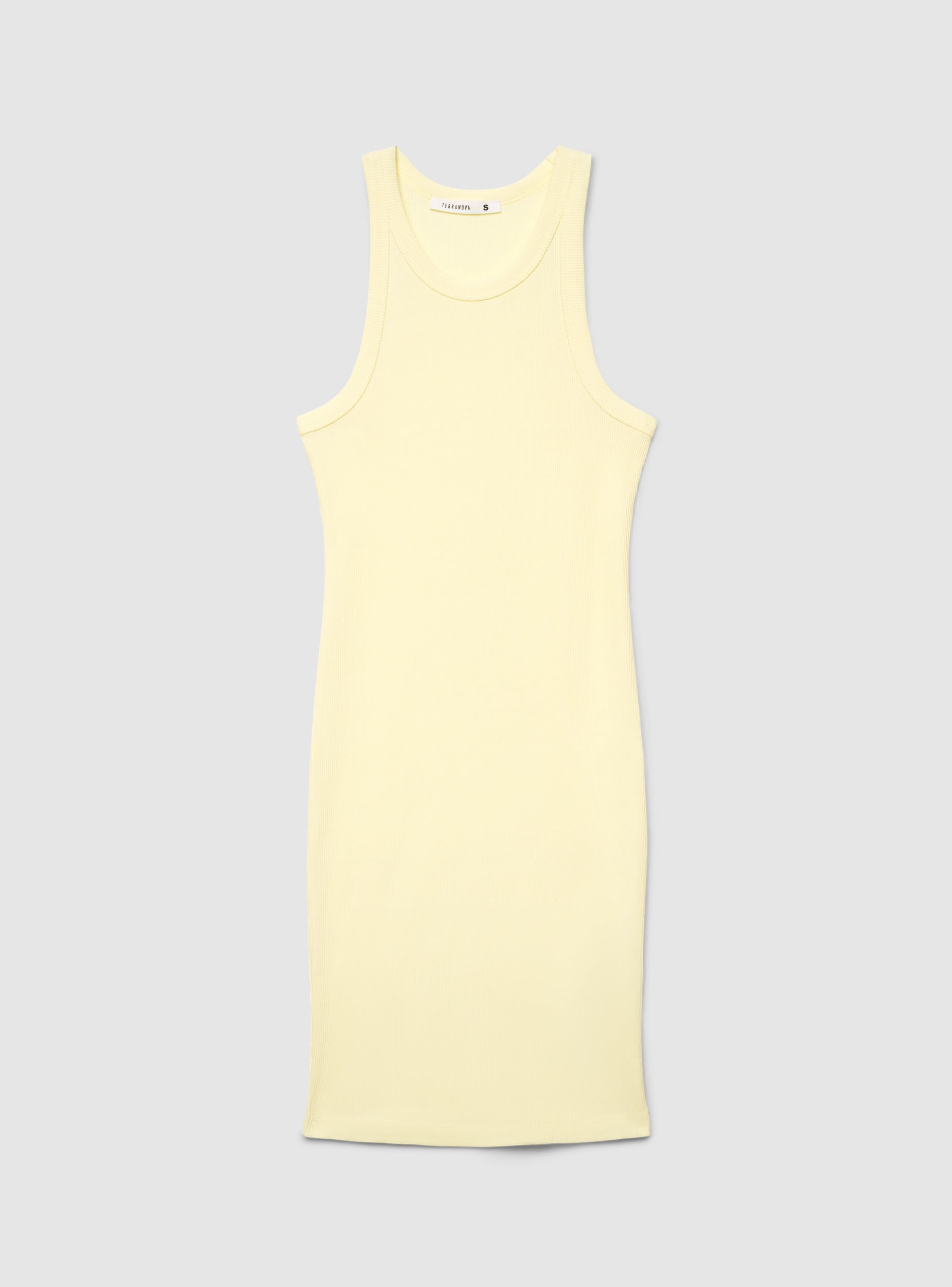 Ženska haljina model majica u jednobojnoj varijanti, uskog kroja i midi dužine. Okrugli izrez i široki otvor za ruke ističu siluetu, dok rebrasti rad daje osnovni, ali efektniji izgled. Bez kopčanja i džepova, idealna je uz patike i teksas jaknu tokom dana ili uz sandale i aksesoare za veče.Detalji