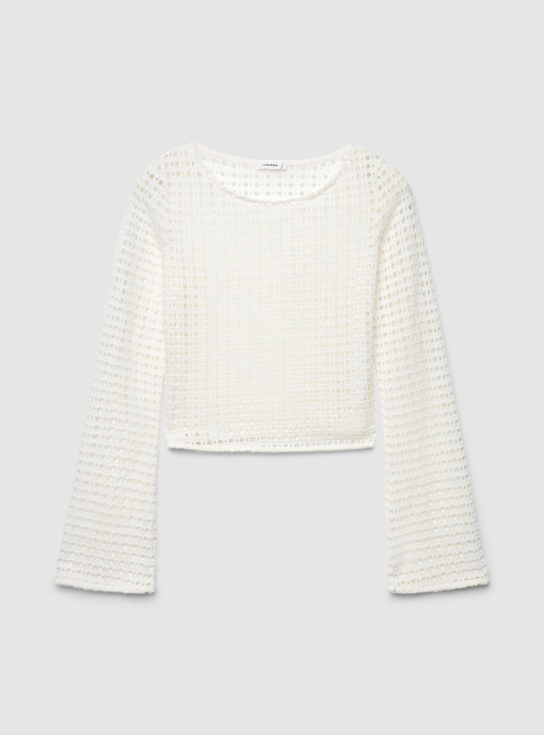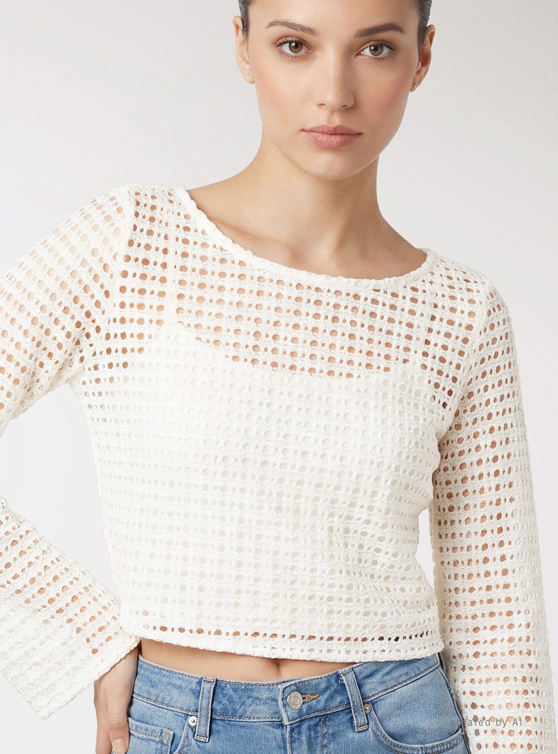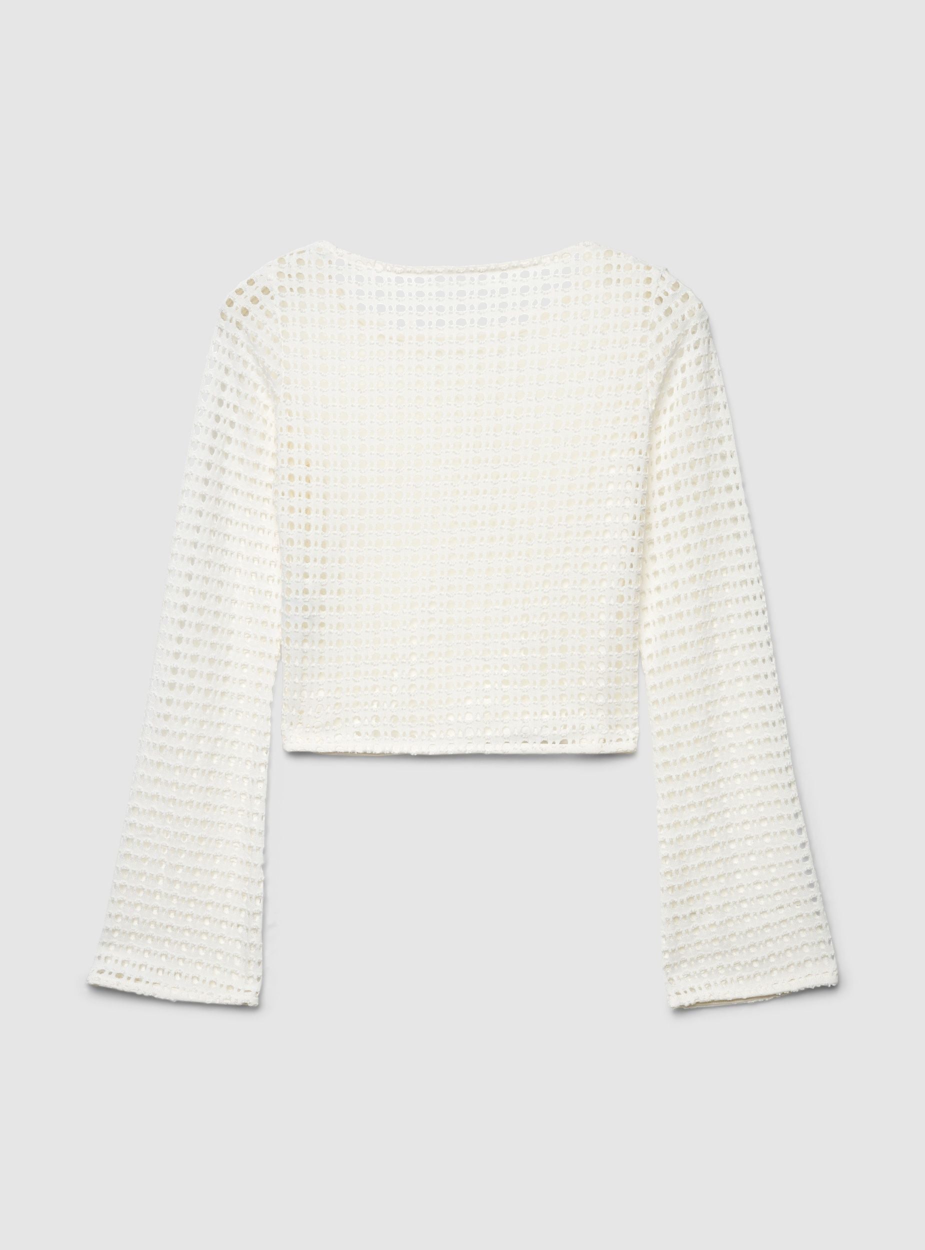 Ženska crop majica sa perforacijama u jednobojnoj varijanti, idealna za letnje kombinacije i slojevito nošenje preko topova ili braleta. Dizajn sa širokim izrezom u obliku čamca i dugim rukavima na zvono daje sofisticiran izgled i ističe siluetu. Lako se kombinuje sa farmerkama, pantalonama sa visokim strukom ili suknjama za izlaske i slobodno vreme.Detalji