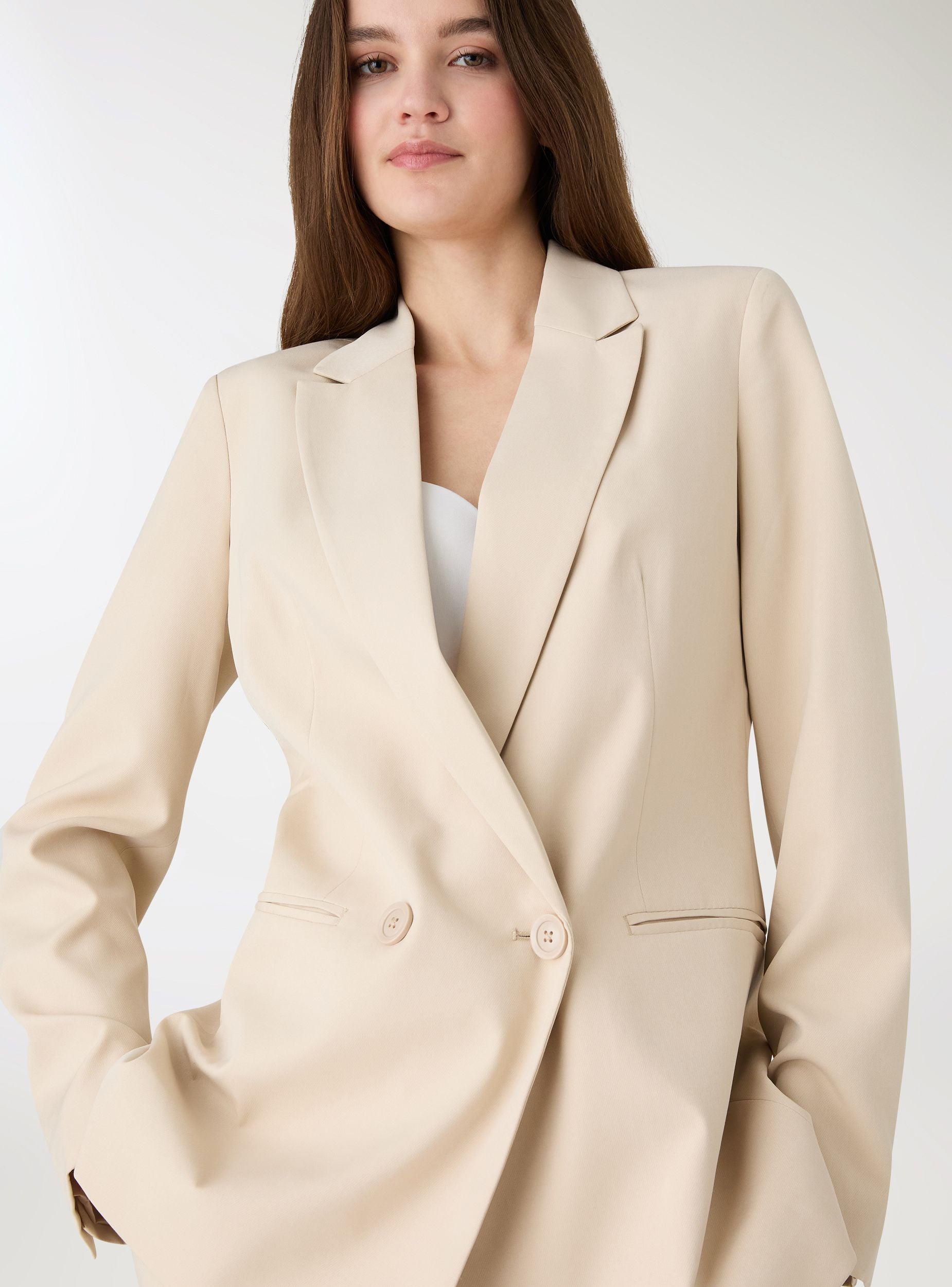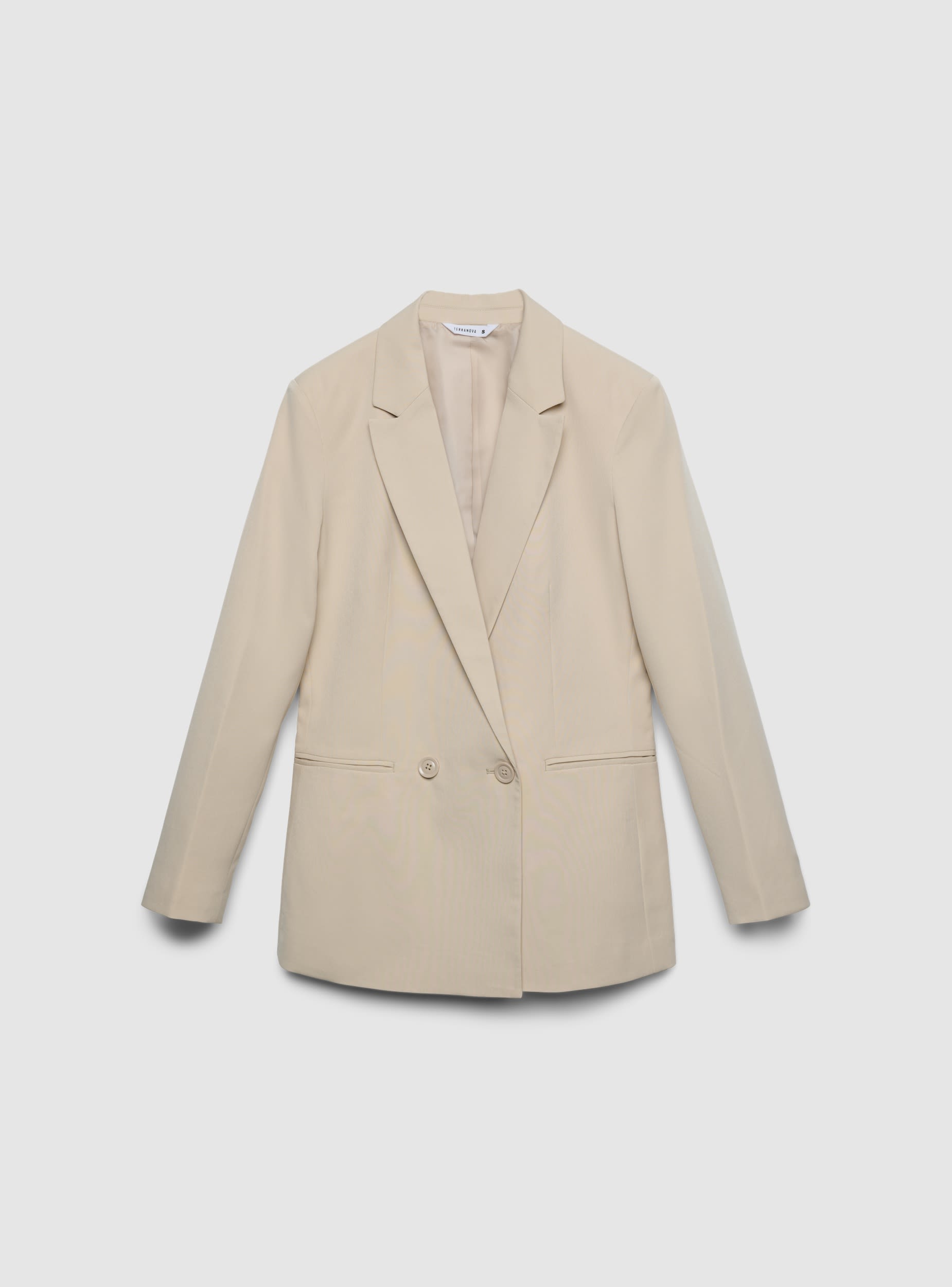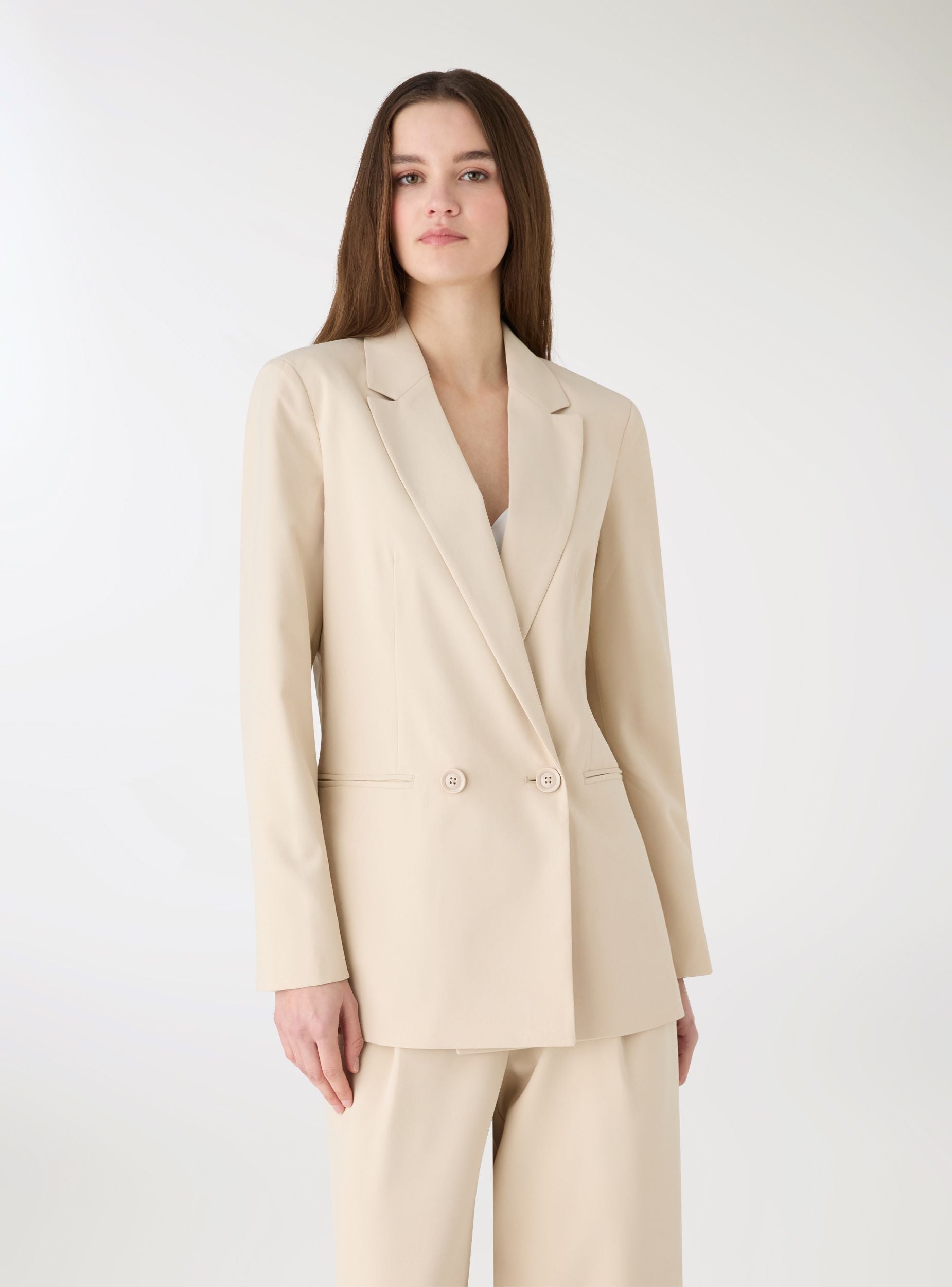 Ženski dvoredni sako u jednobojnoj varijanti, dizajniran za upečatljive kombinacije od kancelarije do koktela. Rever u obliku koplja, dugi rukavi i dvostruko kopčanje koje ističe siluetu. Prednji džepovi sa ušivenim ivicama i dužina ispod bokova za elegantan regular kroj. Postavljen, prati košulje, majice i krojene pantalone ili džins, podižući dnevne i večernje autfite sofisticiranim detaljem.Detalji