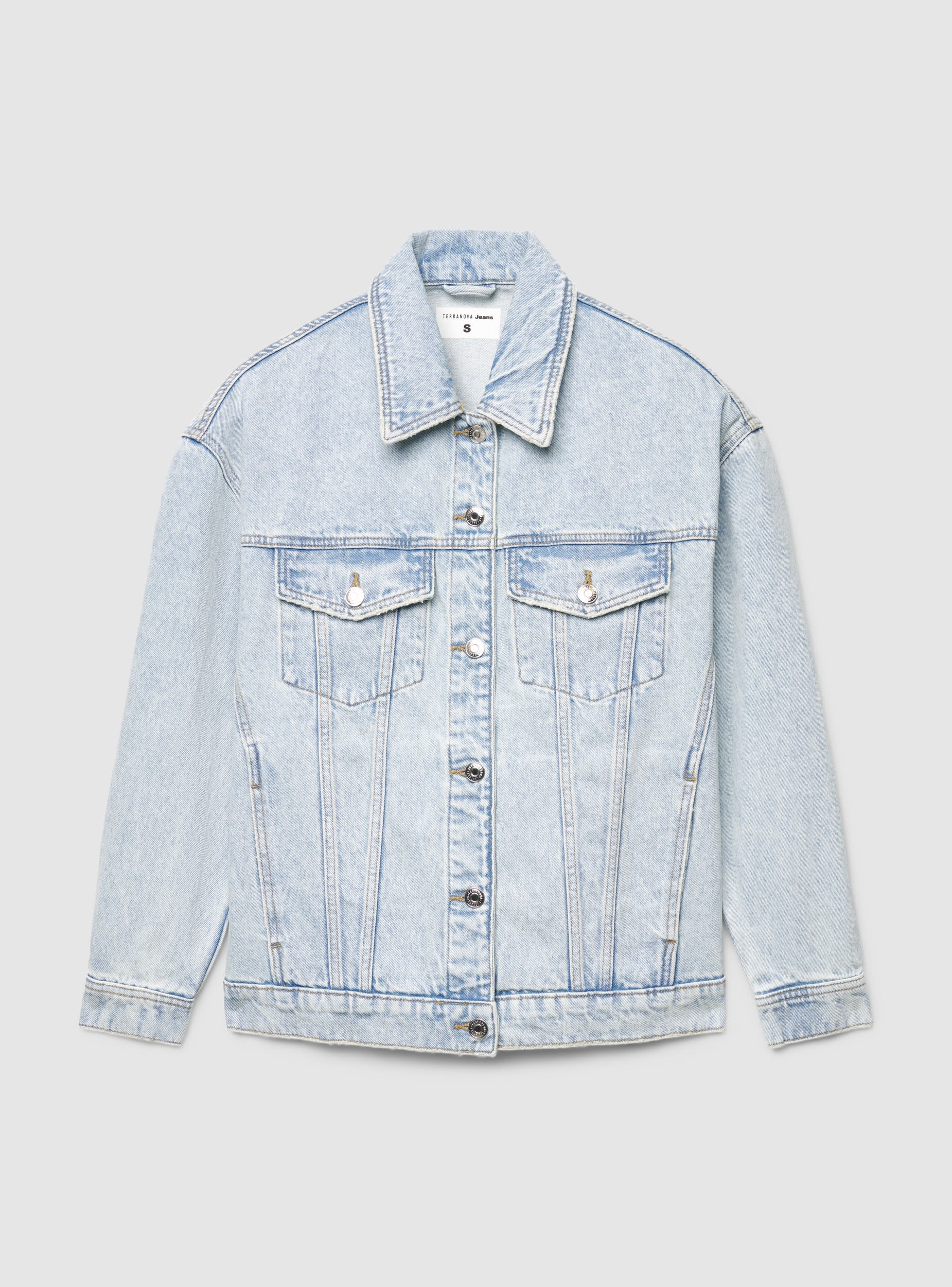 Ženski teksas jakna u jednobojnoj varijanti, oversized kroja i standardne dužine. Ovratnik kao kod košulje, dugi rukavi i prednje zatvaranje sa metalnim dugmadima. Ima džepove na grudima sa preklopom i bočne džepove uz šav. Savršena za casual i urbane kombinacije, može se nositi sa majicom i farmerkama ili midi haljinama za opušten stil. Idealna za prelazni period i dinamično slojevito oblačenje.Detalji