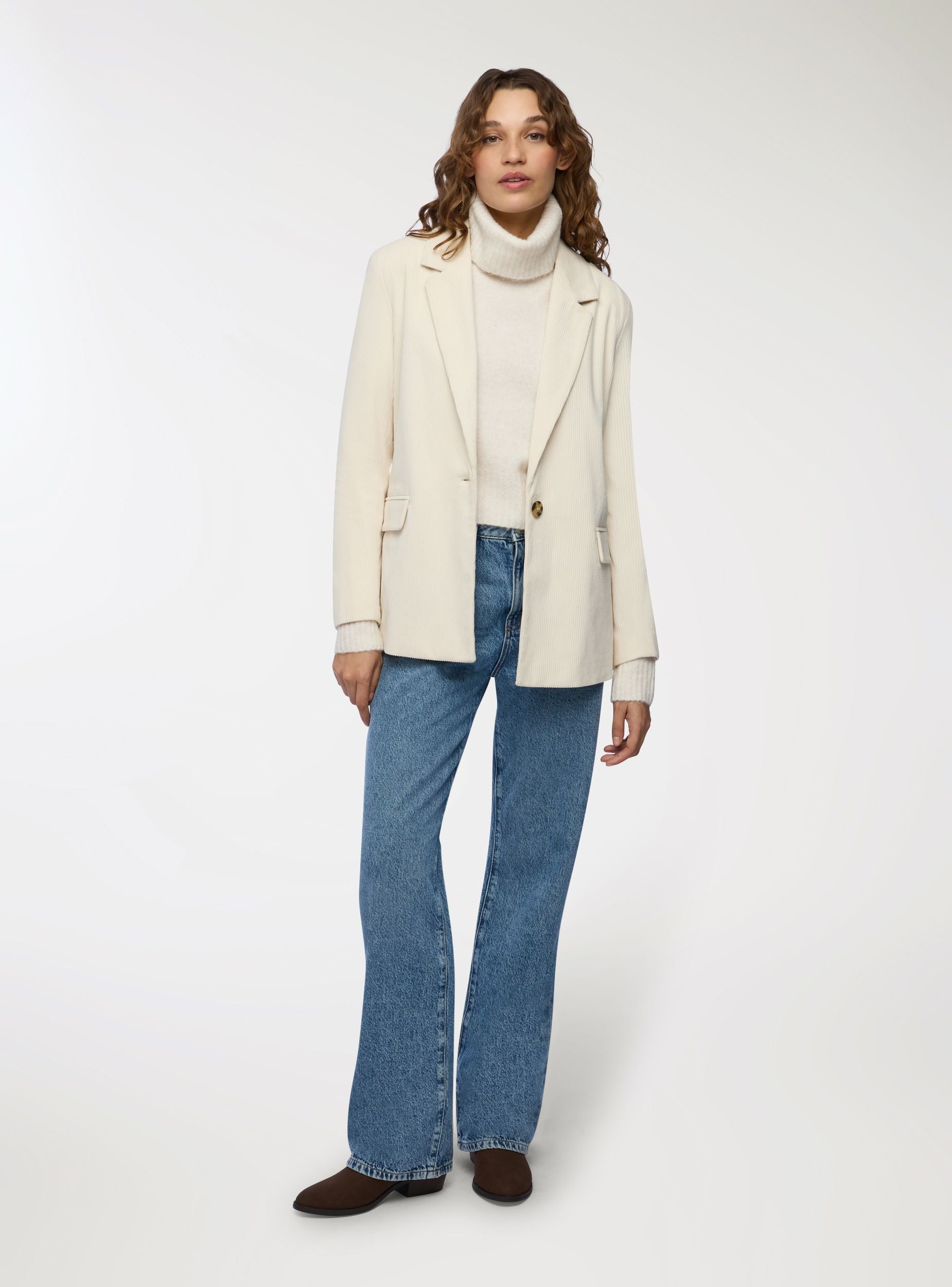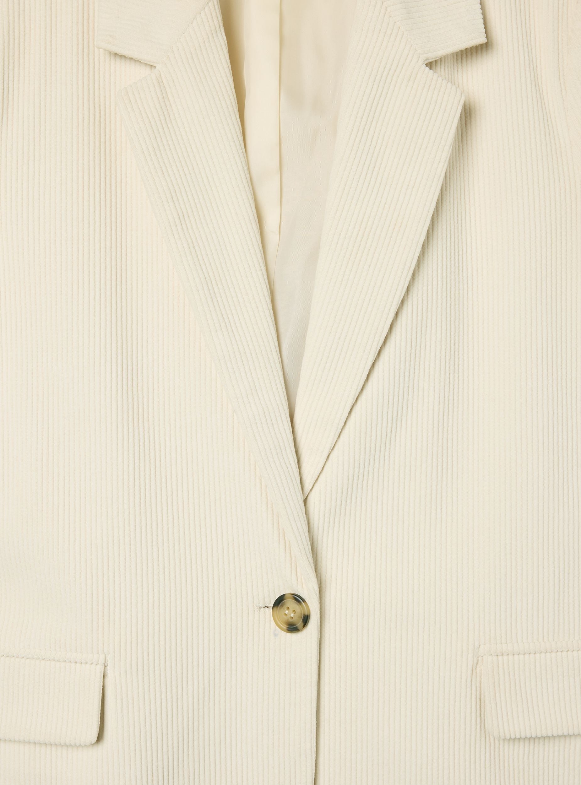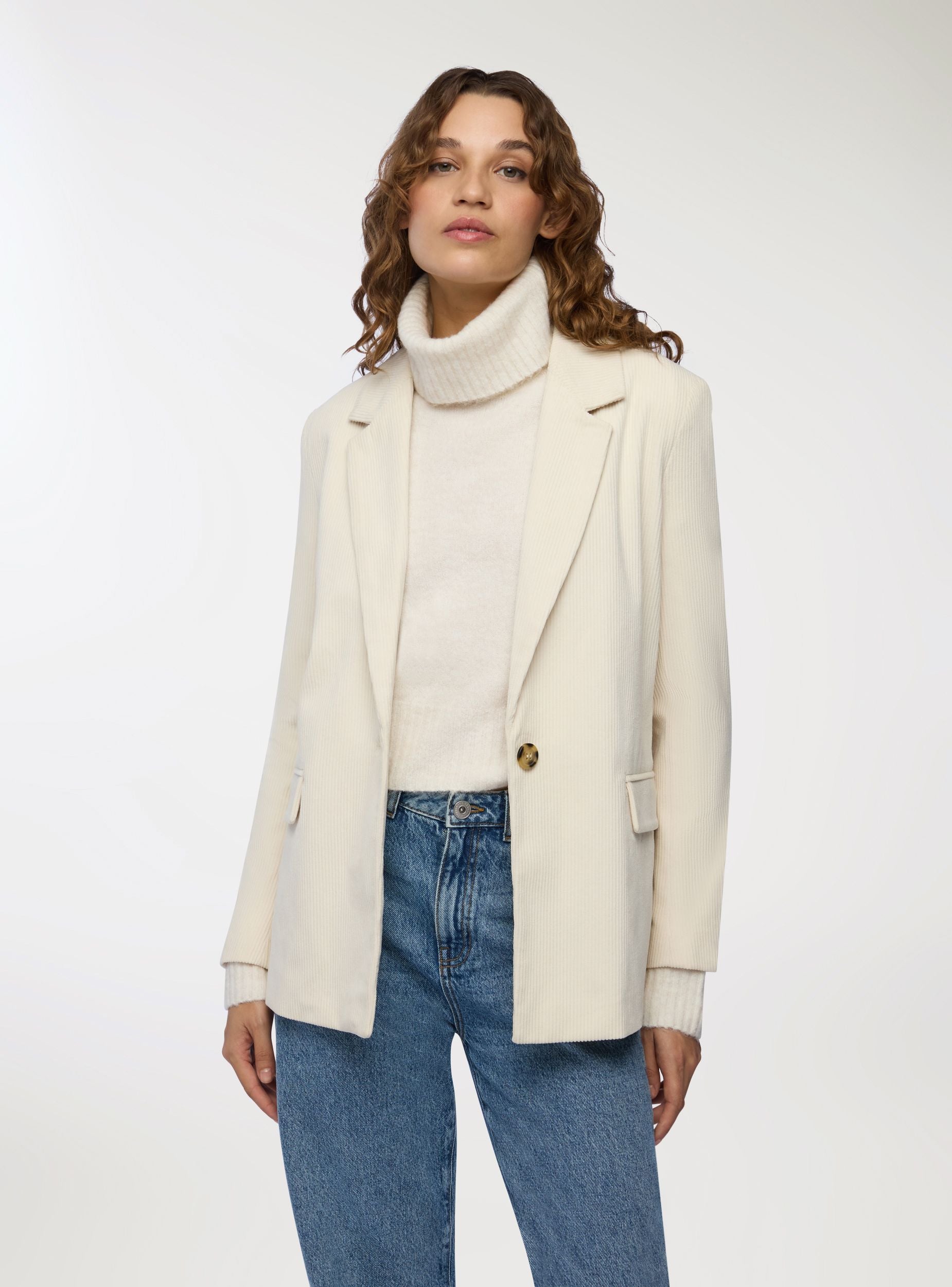 Ženska jakna sa jednorednim dizajnom i kopčanjem na dugme. Ima elegantan i moderan kroj, idealan za formalne prilike ili profesionalni izgled. Opremljena je prednjim džepovima sa poklopcem, što pruža praktičnost i stil. Tkanina je prugasta u jednobojnom plišanom efektu. Regularan kroj garantuje udobnost i svestranost, savršena za kombinovanje sa pantalonama ili suknjama za sofisticirani outfit.Detalji