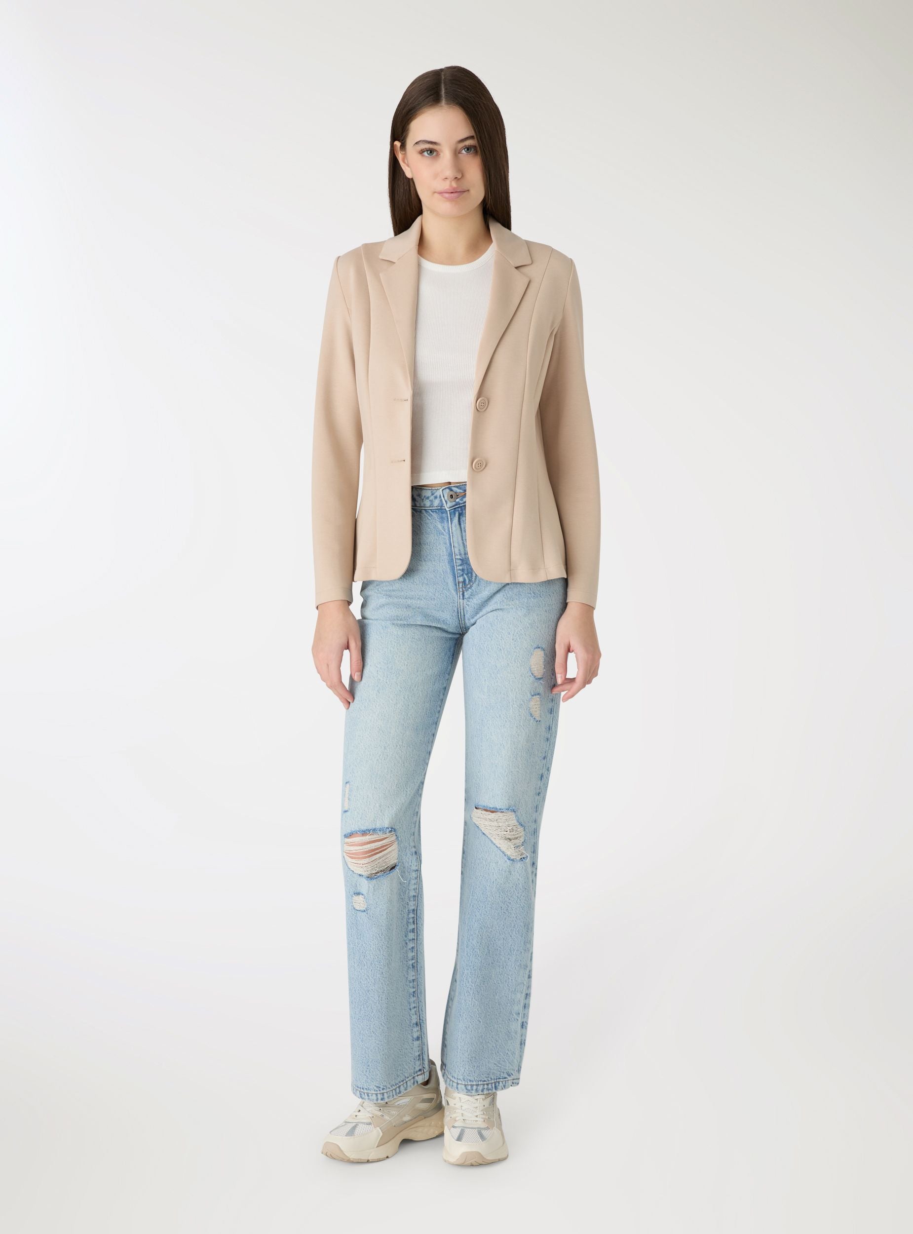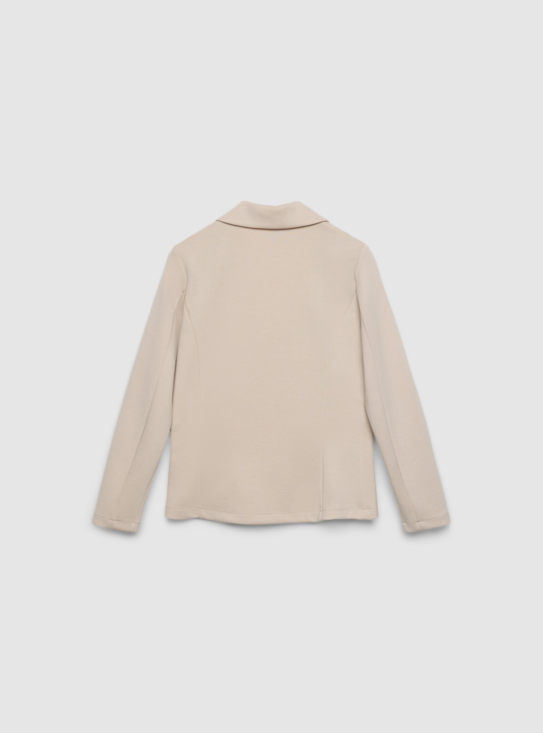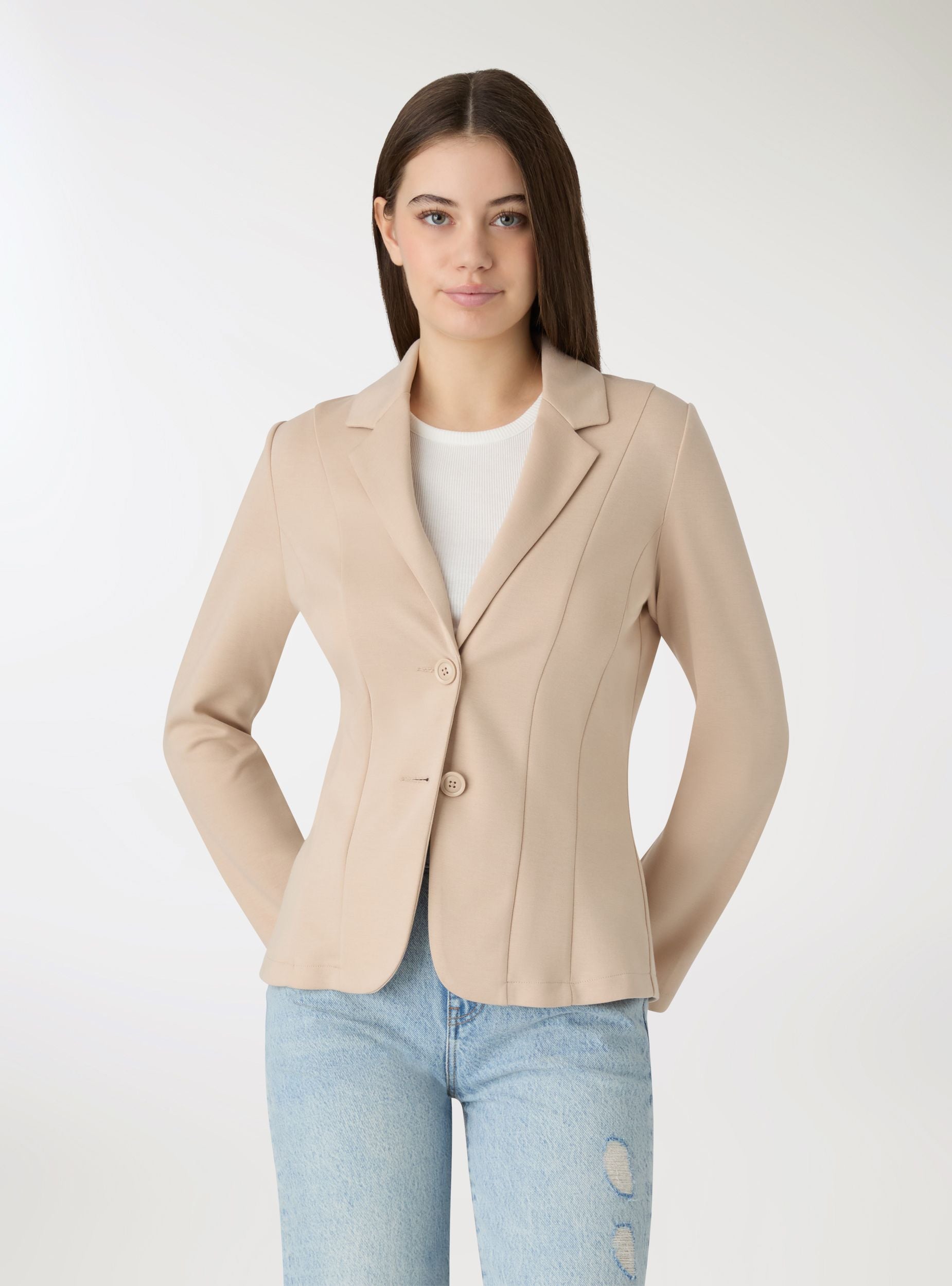 Ženska jakna u jednobojnoj varijanti, sa čistim i ženstvenim krojem. Rever u obliku koplja i jednoredno kopčanje na dva dugmeta definišu jednostavnu liniju, sa dugim rukavima i regularnom dužinom. Vertikalne šavove naglašavaju figuru pružajući udobno pristajanje. Savršena za kancelariju, sastanke i koktele, može se kombinovati sa košuljom i krojenim pantalonama ili sa majicom i farmerkama za uredan izgled. Prednji džepovi sa prorezom.Detalji