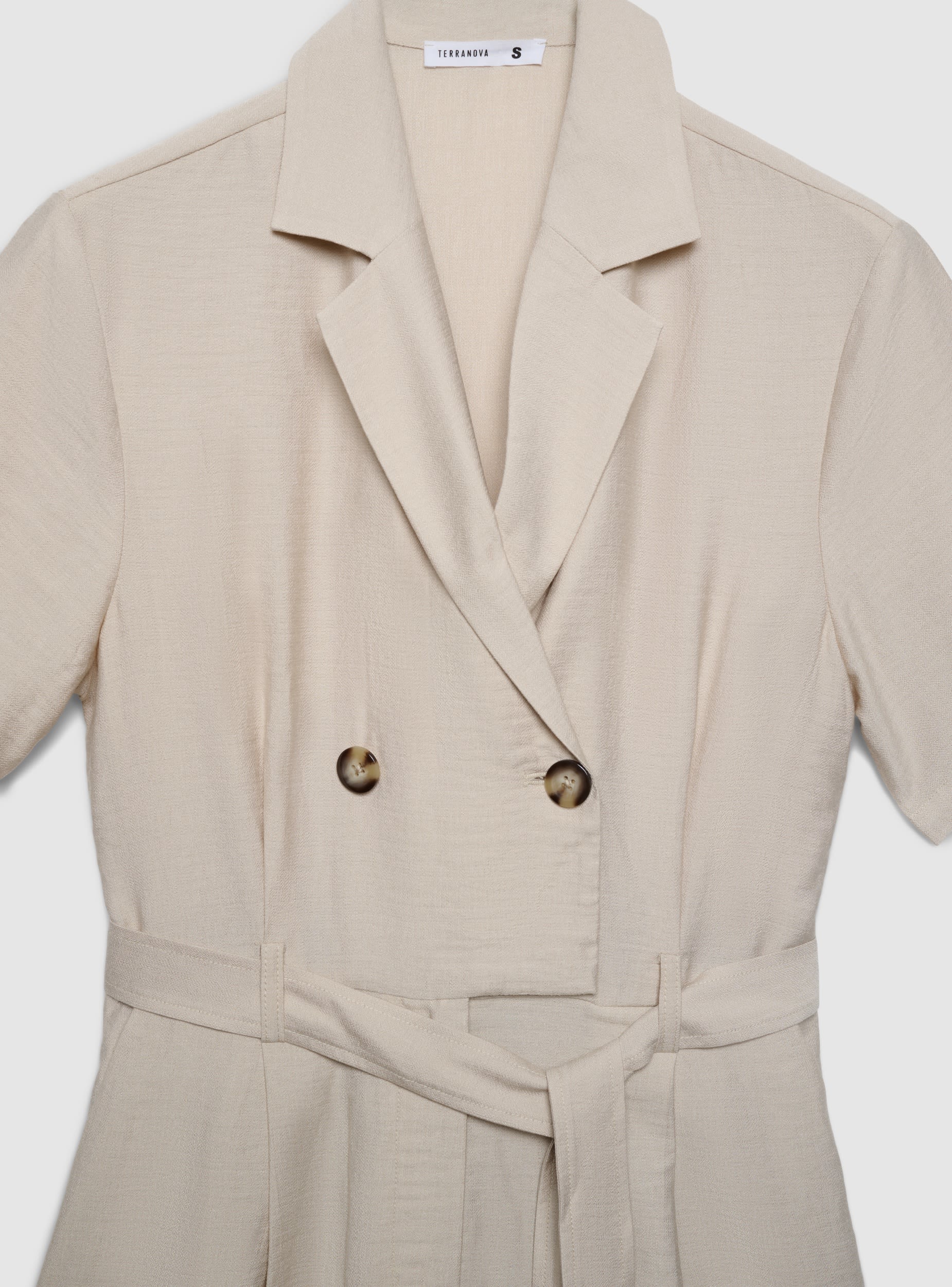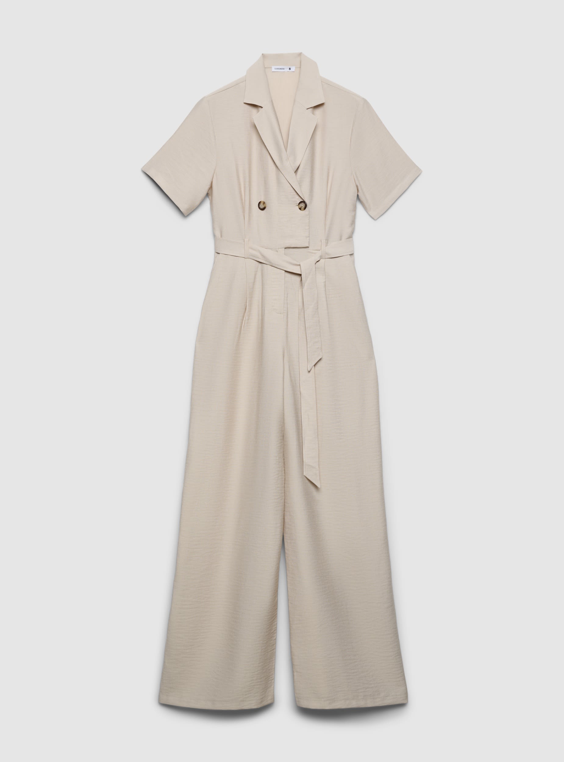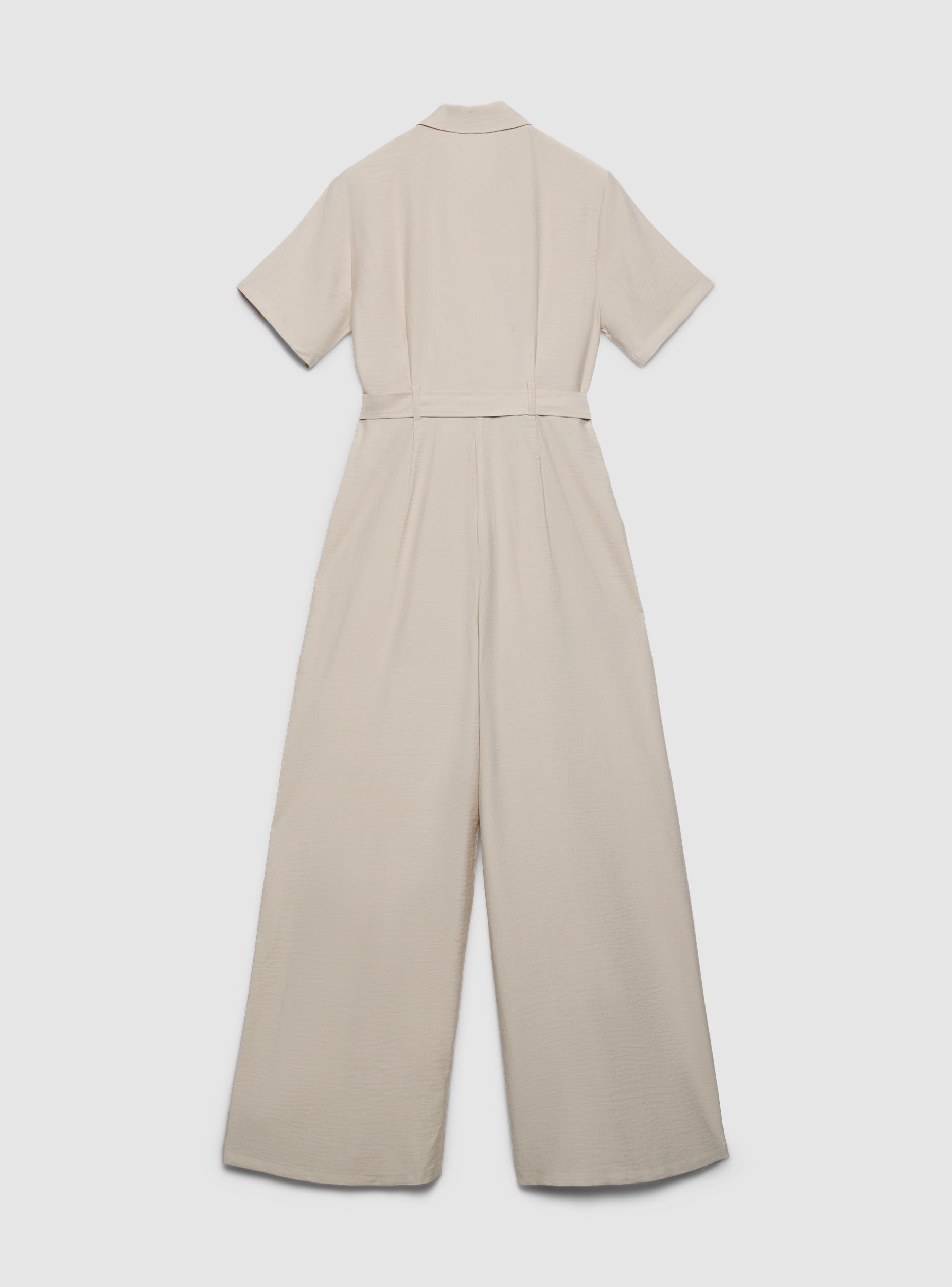 Ženski kombinezon u jednobojnoj varijanti sa dizajnom inspirisanim safari kombinezonom. Rever ovratnik i dvoredno kopčanje sa dugmadima, kratki rukavi i usklađeni kaiš koji naglašava struk. Široke i duge nogavice za udobno i svestrano nošenje. Idealan za kancelariju ili slobodno vreme, dobro se slaže sa sandalama na štiklu ili patikama za opušteniji izgled. Ugrađeni bočni džepovi i fluidan kroj.Detalji