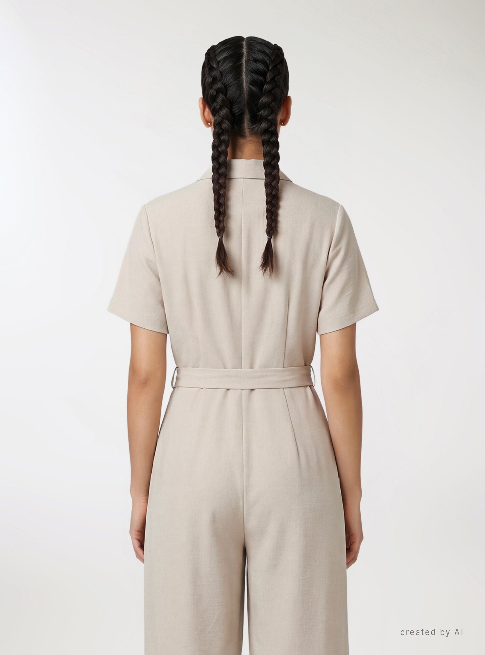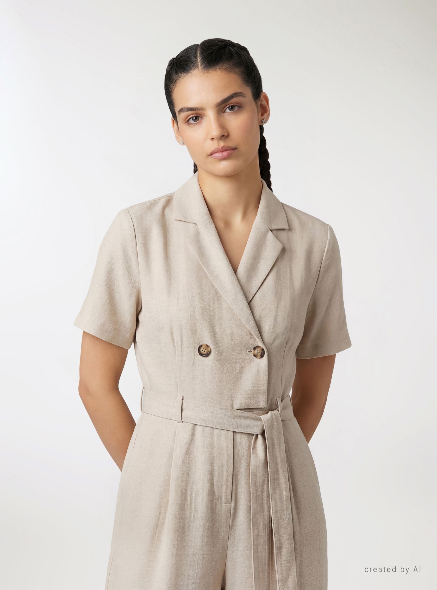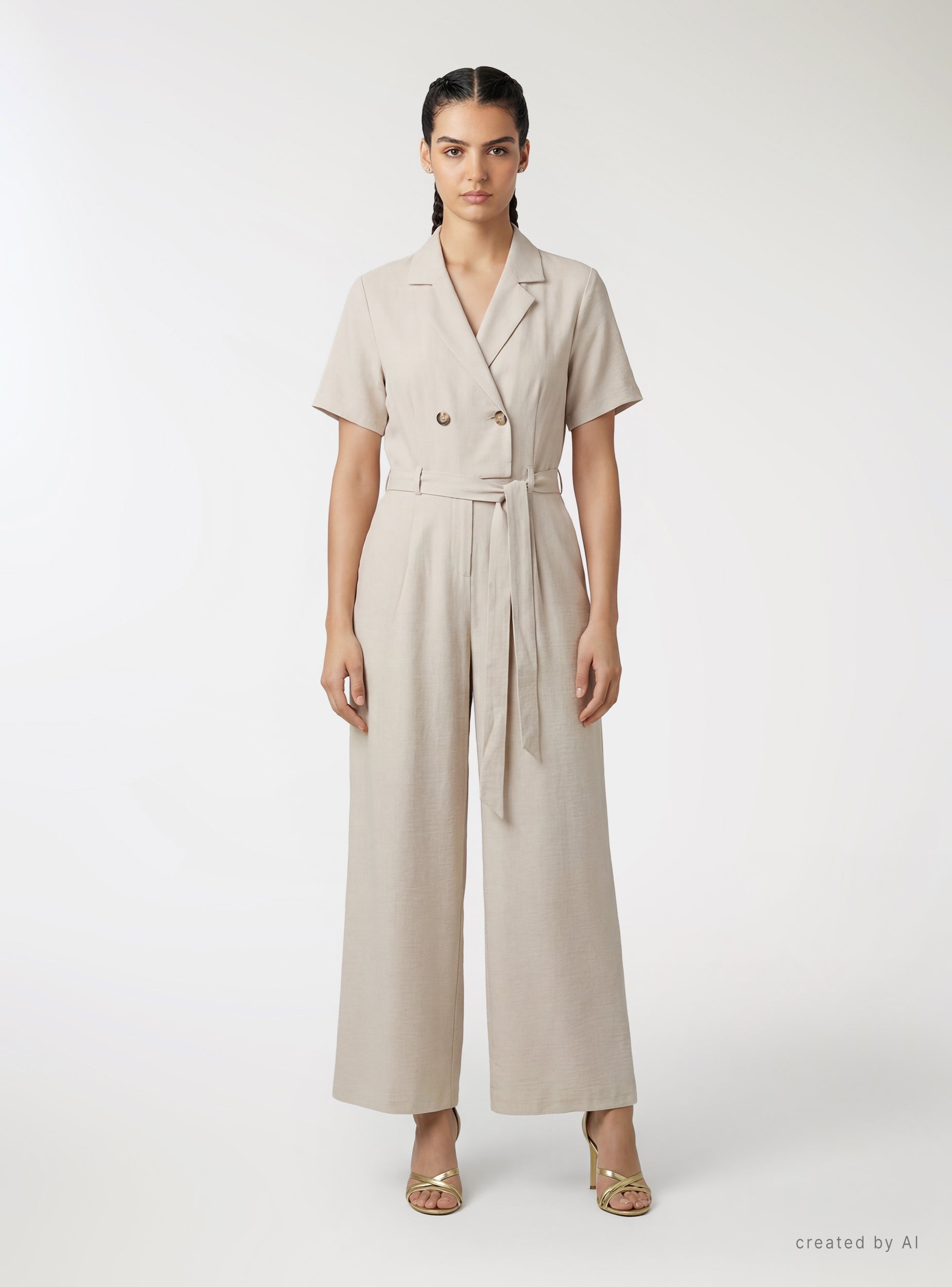 Ženski kombinezon u jednobojnoj varijanti sa dizajnom inspirisanim safari kombinezonom. Rever ovratnik i dvoredno kopčanje sa dugmadima, kratki rukavi i usklađeni kaiš koji naglašava struk. Široke i duge nogavice za udobno i svestrano nošenje. Idealan za kancelariju ili slobodno vreme, dobro se slaže sa sandalama na štiklu ili patikama za opušteniji izgled. Ugrađeni bočni džepovi i fluidan kroj.Detalji