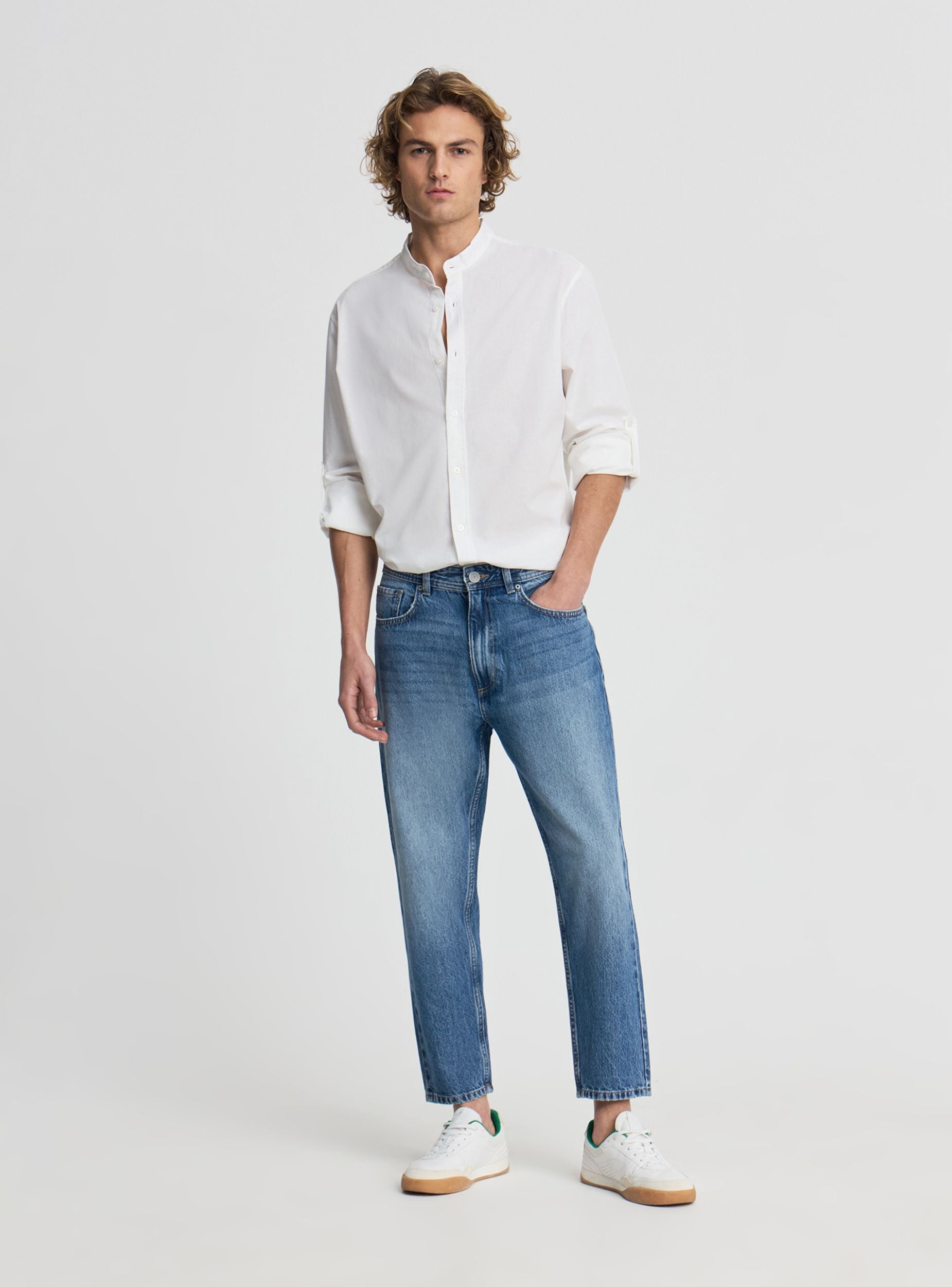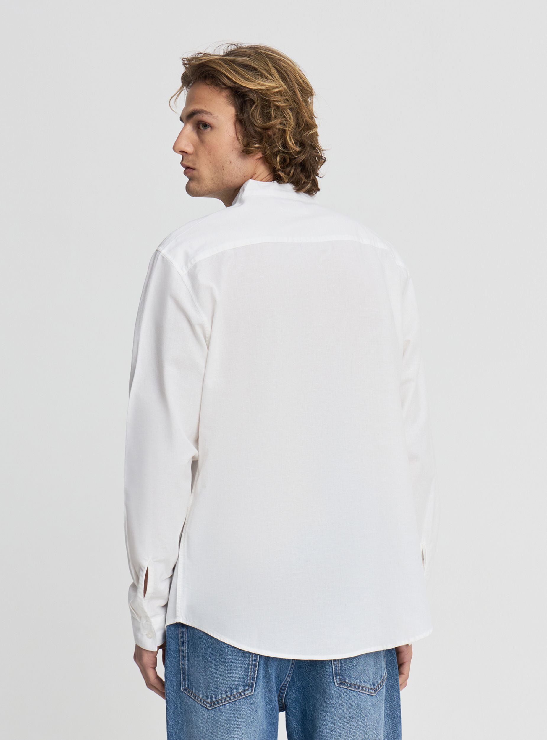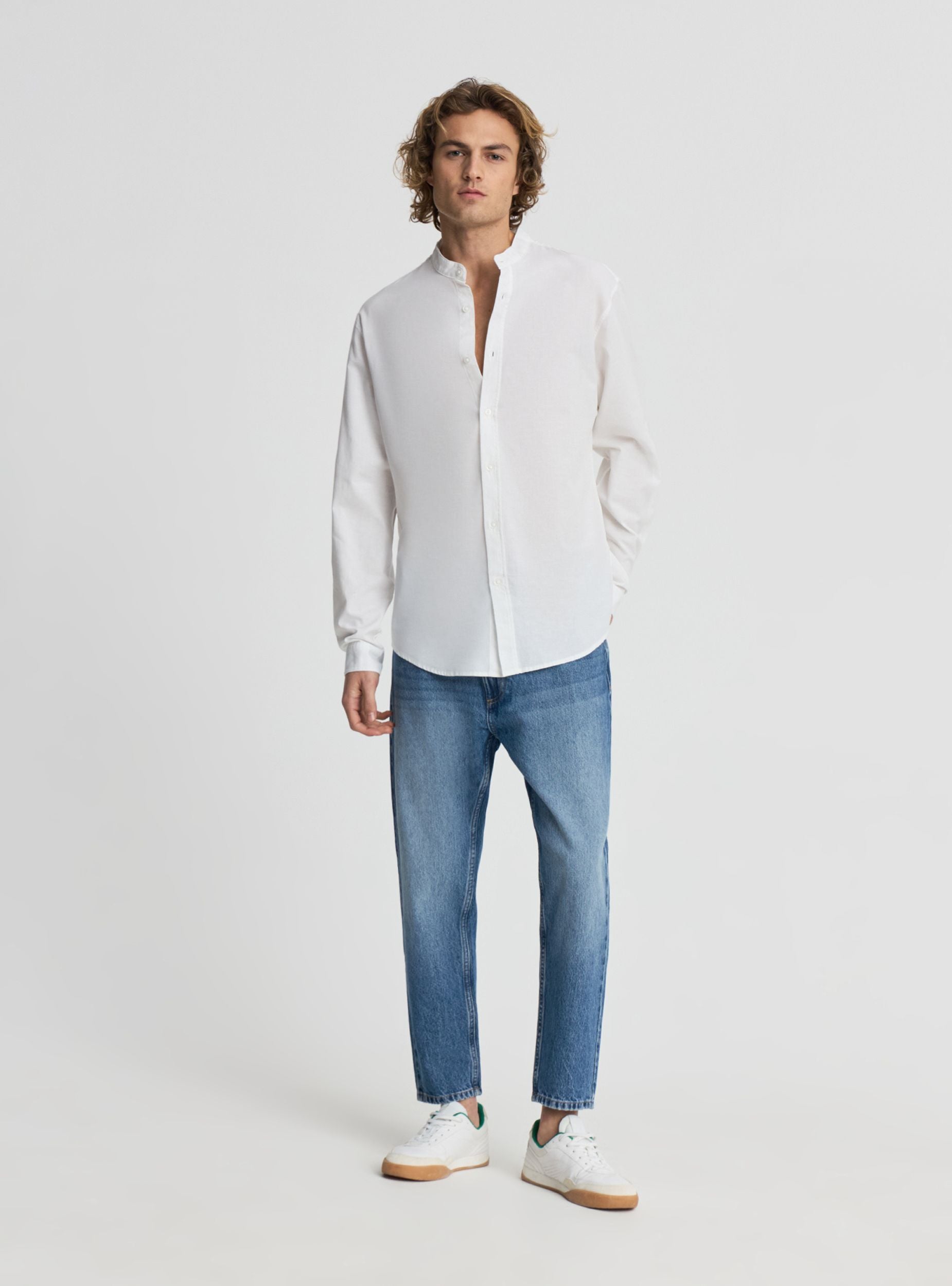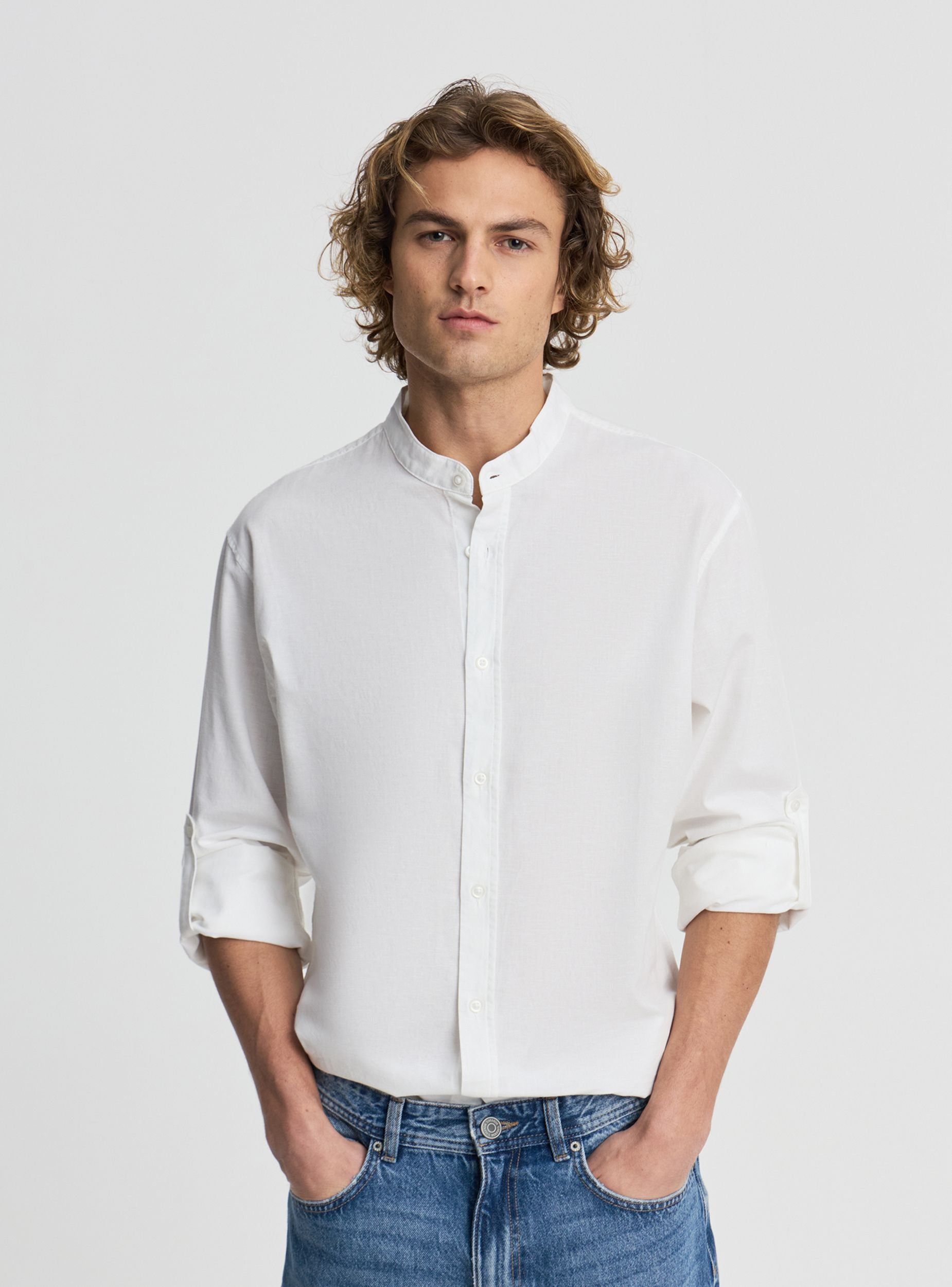 Muška košulja u jednobojnoj varijanti sa korejskim kragnom i dugim rukavima, savršena za ležerne ili poluformalno elegantne izglede. Prednje kopčanje na dugmad i manžetne sa dugmetom, čist i udoban kroj idealan za nošenje sa farmerkama, činom ili krojenim pantalonama. Minimalistički dizajn ističe regularan kroj i pogodna je kako za kancelariju tako i za slobodno vreme, može se nositi i ispod laganih blejzera.Detalji