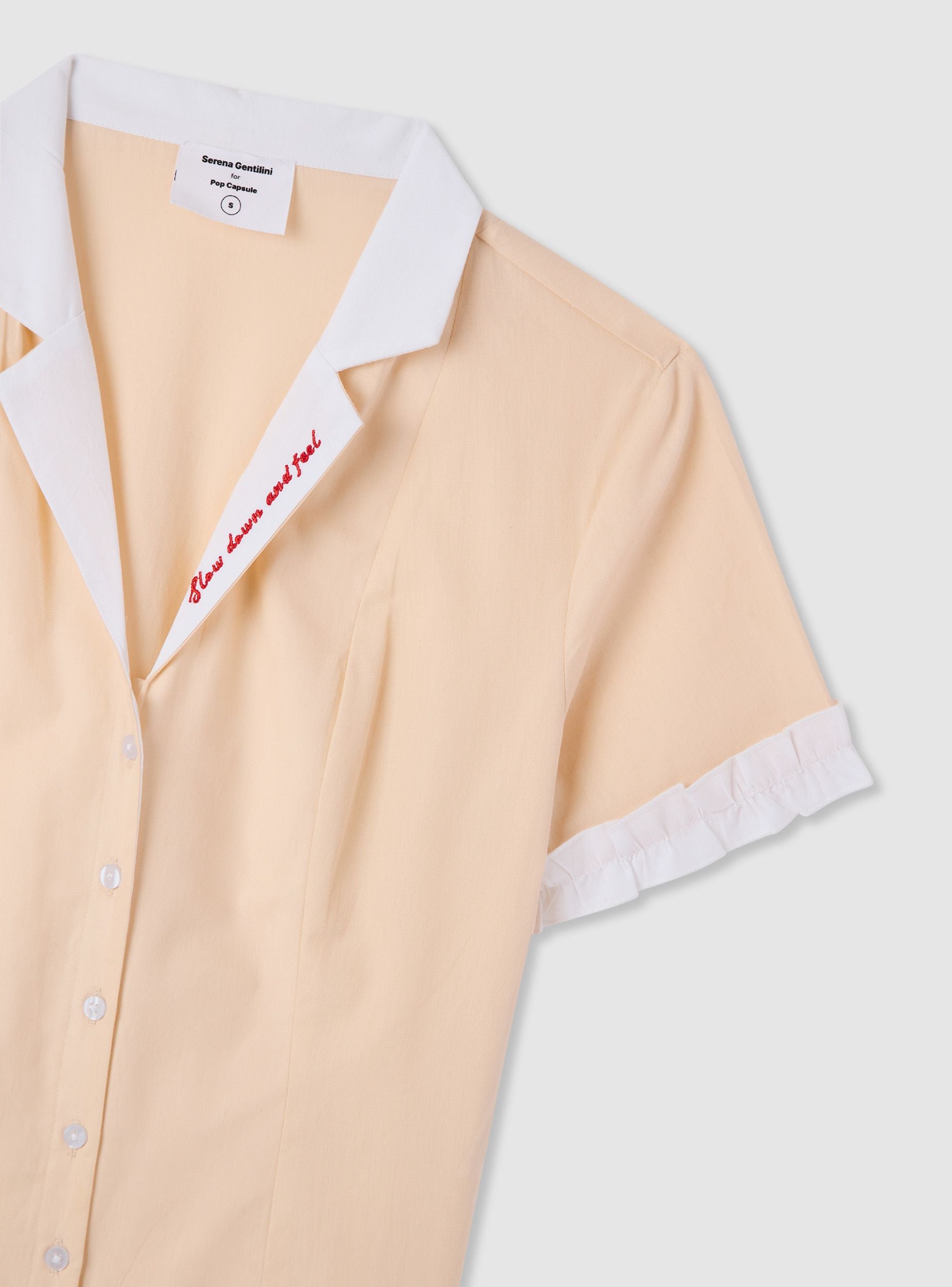 Ženska košulja u jednobojnoj regular kroju, idealna za kancelariju i slobodno vreme. Model sa kratkim rukavima ima prednje kopčanje na dugmad i ovratnik sa reverom u kontrastnoj boji sa vezom natpisa, za sofisticirani detalj. Manžetne sa volanima naglašavaju outfit sa džinsom, krojenim pantalonama ili suknjama.Detalji