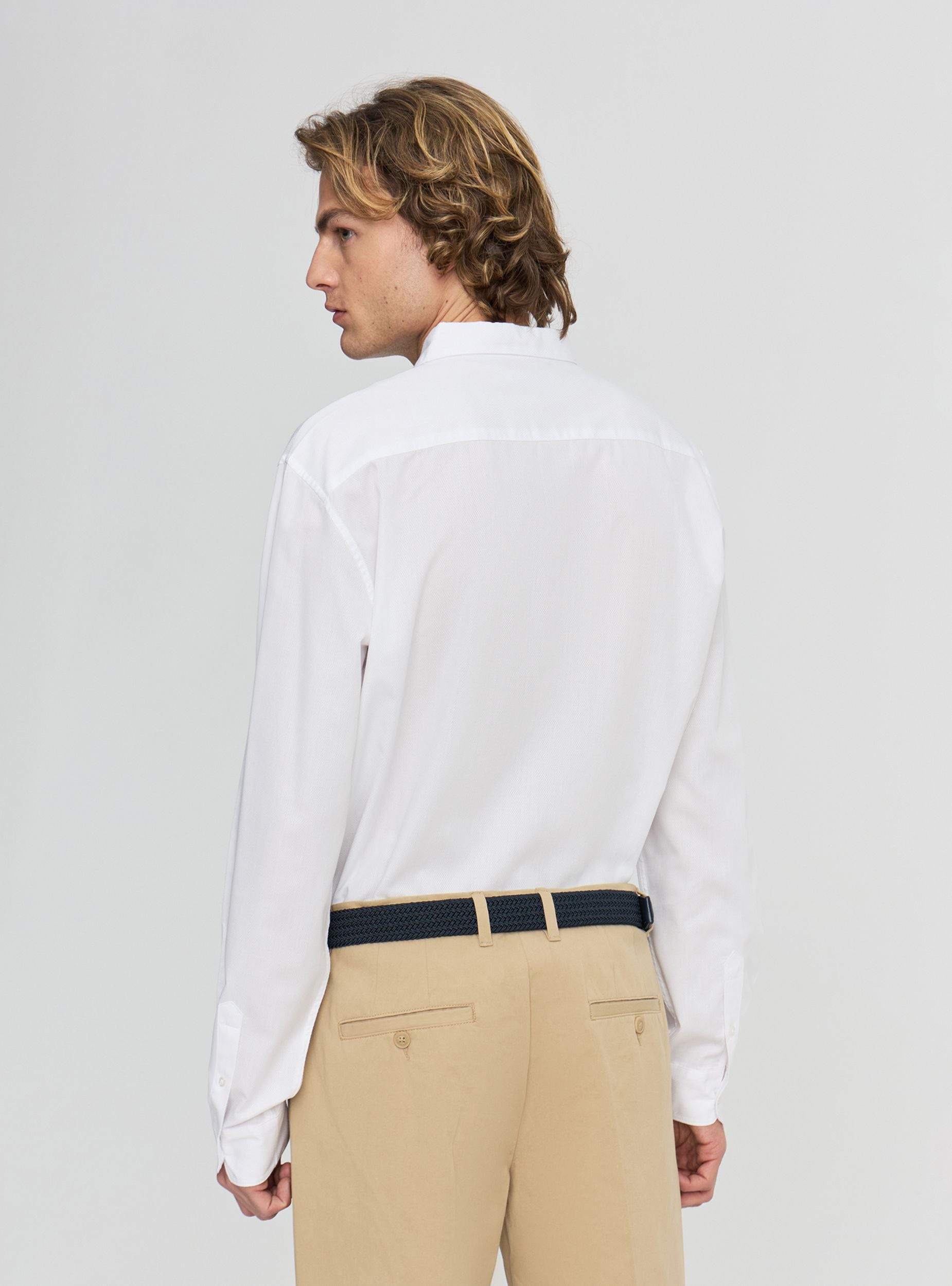 Muška košulja u jednobojnoj varijanti, dizajnirana za kancelarijski izgled i uredne prilike. Dizajn sa oštrim kragnama i prednjim kopčanjem ističe čist stil, dok zaobljeni donji deo omogućava nošenje košulje i u pantalonama i preko njih. Dugi rukavi sa kopčanim manžetnama i kroj bez džepova, idealna uz chino pantalone ili farmerke za uredan outfit.Detalji