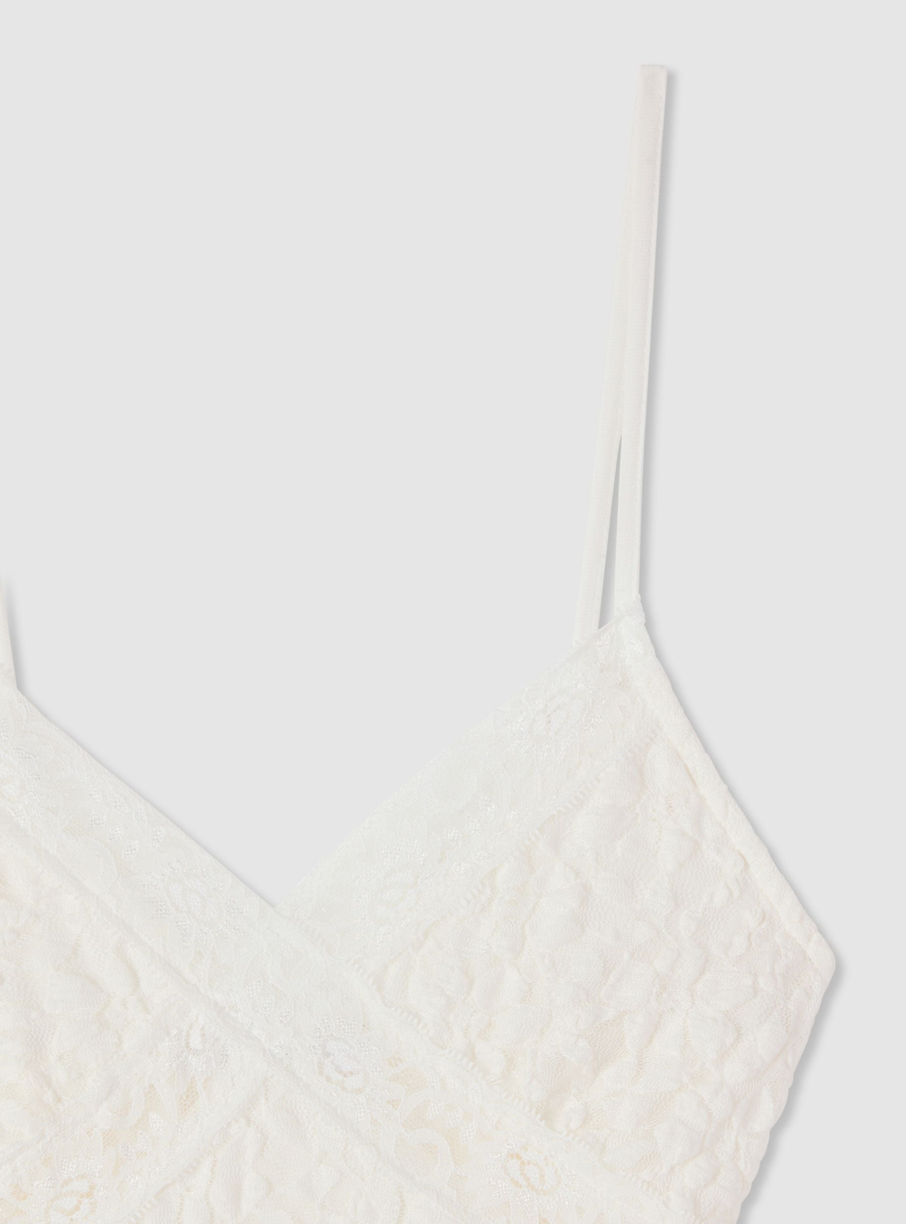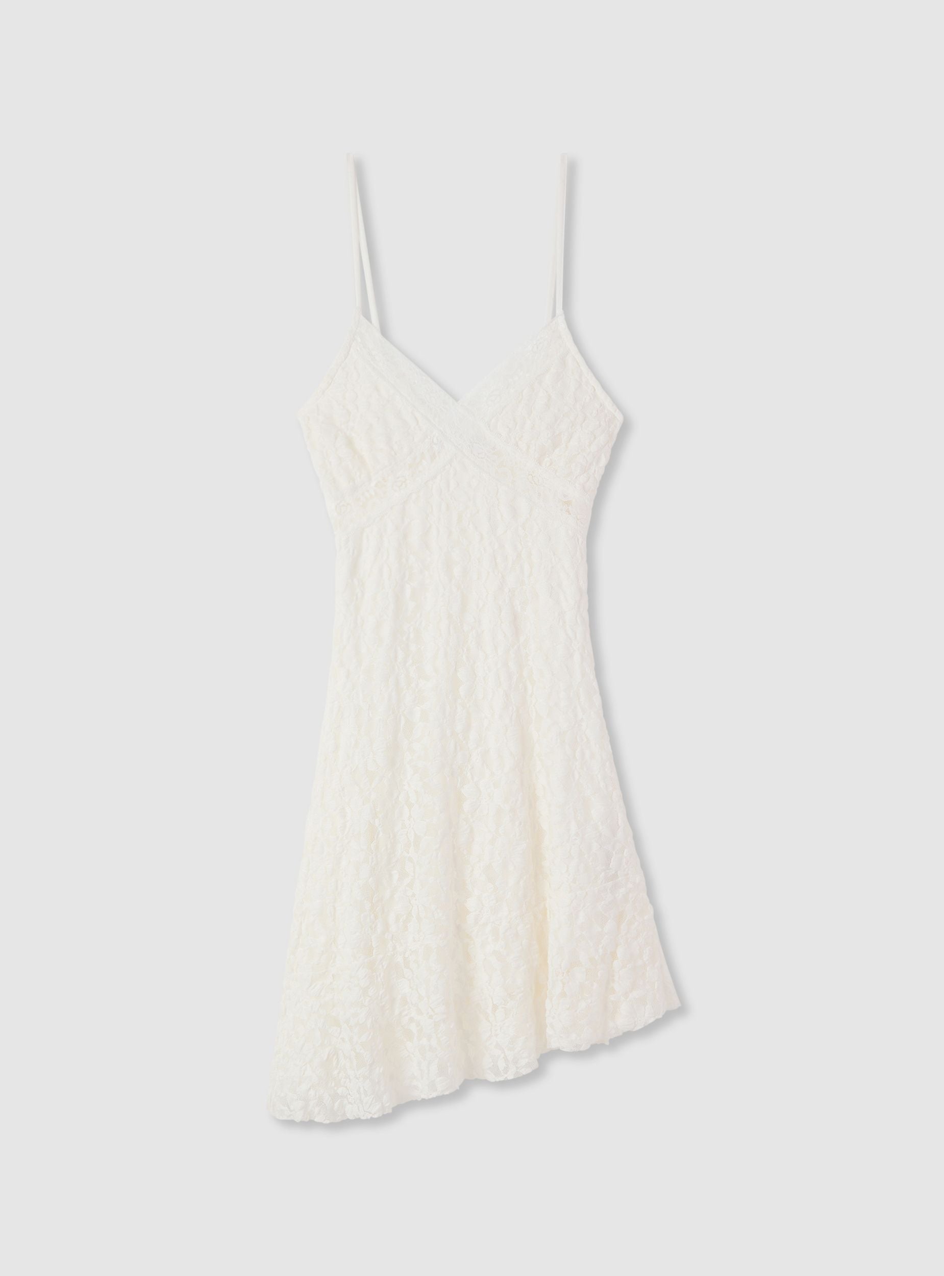 Kratka ženska haljina u jednobojnoj varijanti sa tankim bretelema i V-izrezom ukrašenim čipkom. Blago prošireni kroj ističe figuru i stvara pokret na rubu haljine. Idealna za aperitive i večernje izlaske, može se kombinovati sa sandalama i malom torbicom ili sa laganim blejzerom za sofisticiraniji izgled.Detalji