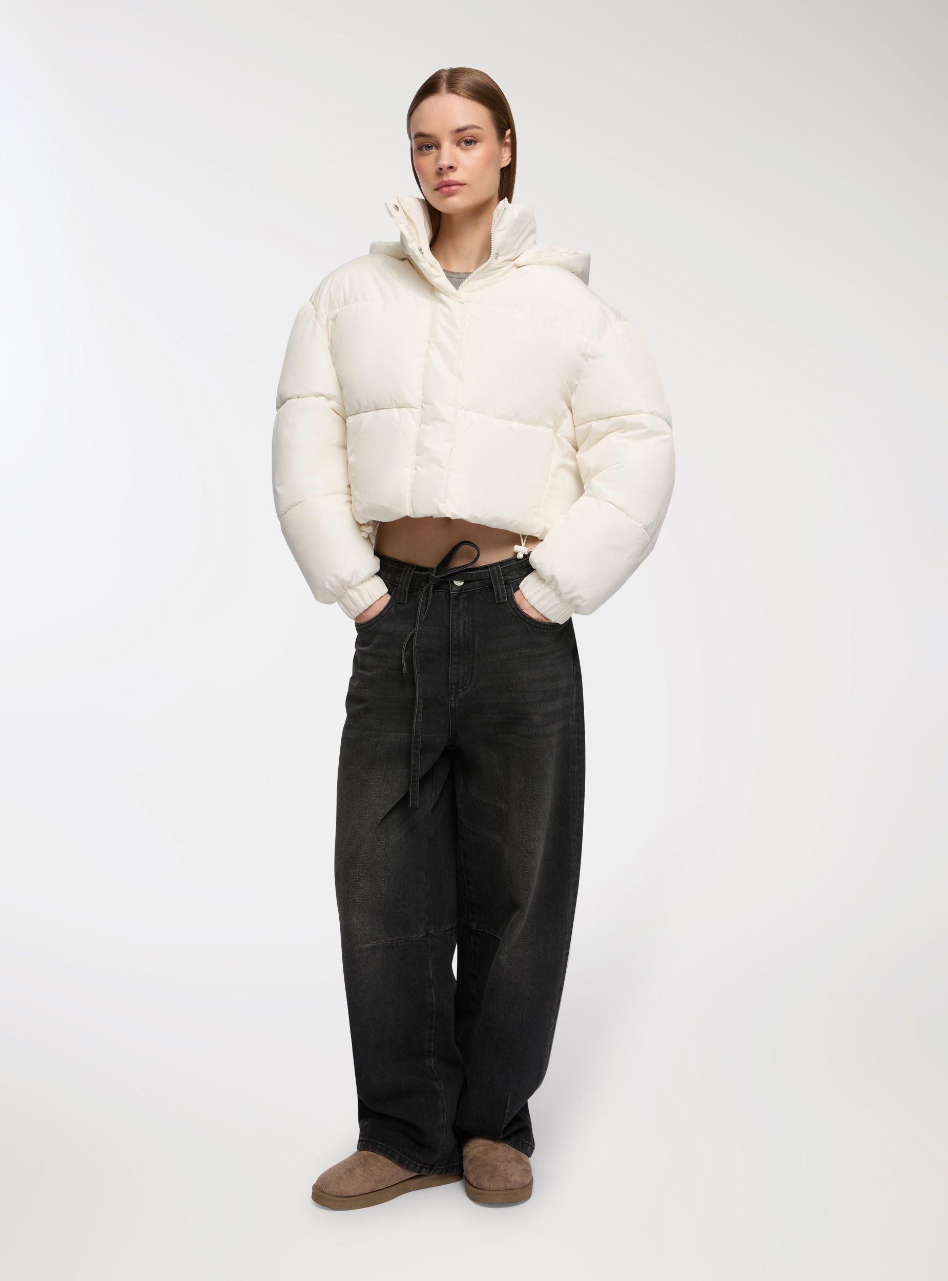 Ženski punjeni prsluk sa kapuljačom, idealan za ležeran i moderan izgled. Ovaj crop komad ima skriveni rajsferšlus i kopče na pritisak, sa jednobojnim prošivenim dizajnom koji garantuje udobnost i stil. Opremljen je nevidljivim džepovima sa rajsferšlusom. Savršen za sveže dane, lako se kombinuje sa farmerkama ili sportskim pantalonama za svestran i moderan outfit. Duge rukave, visok ovratnik, kapuljača i stopperi dodaju praktičnost i zaštitu.Detalji