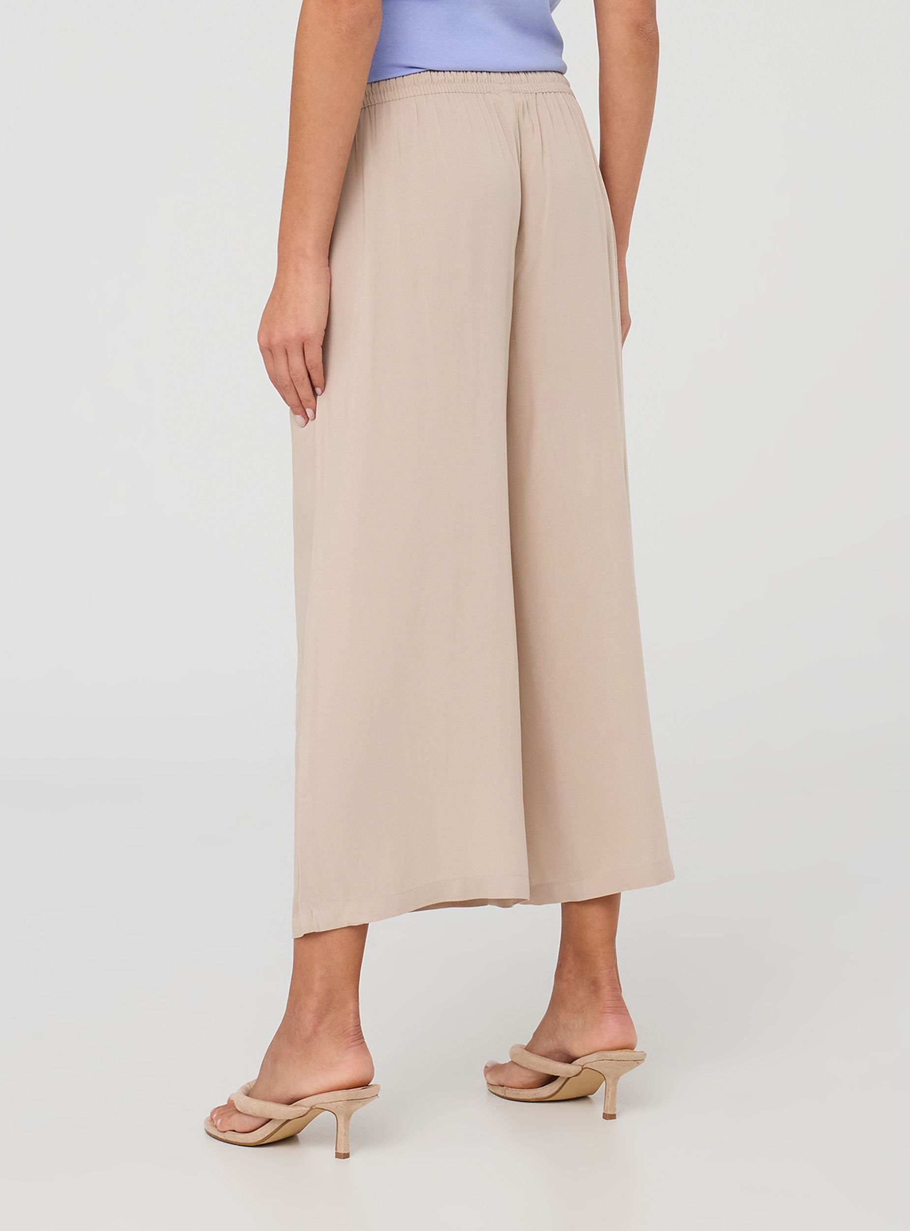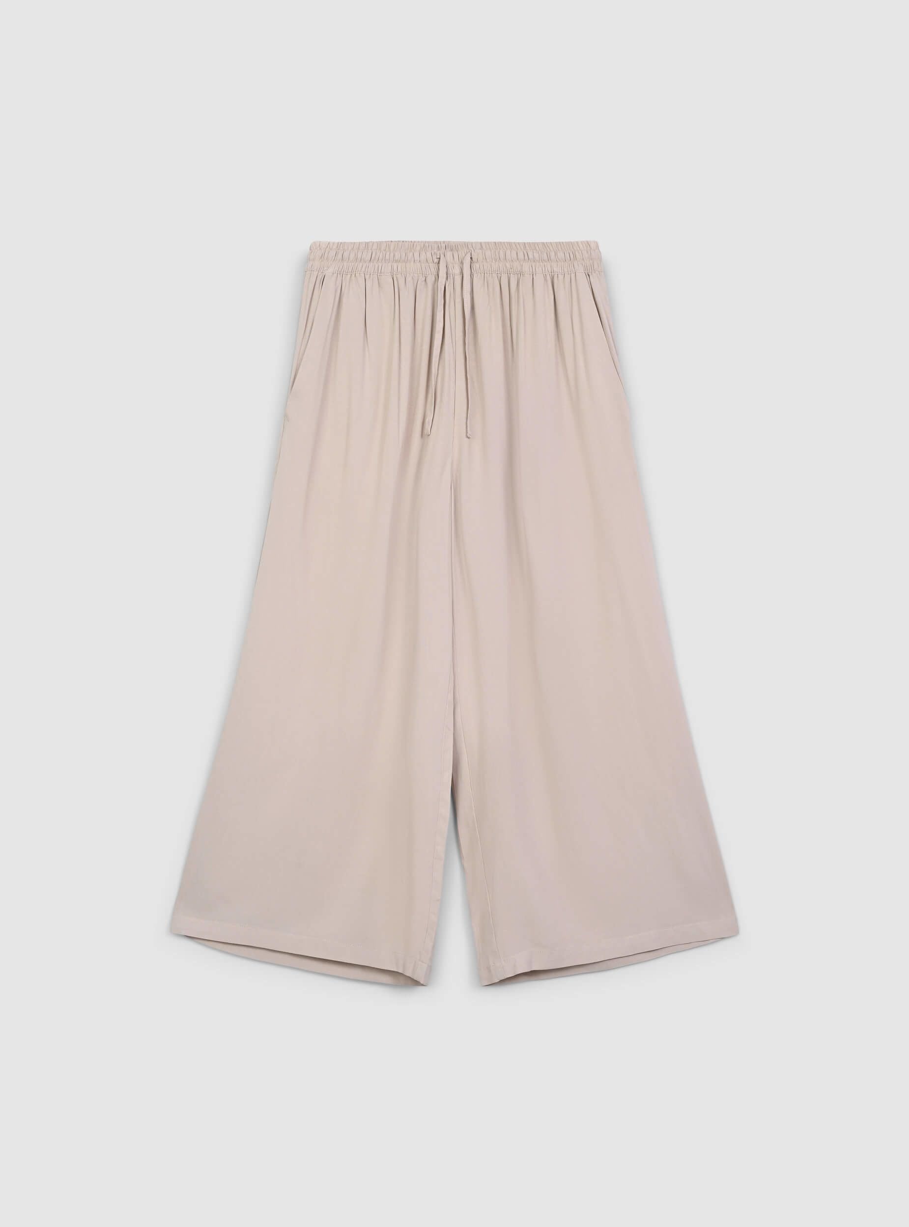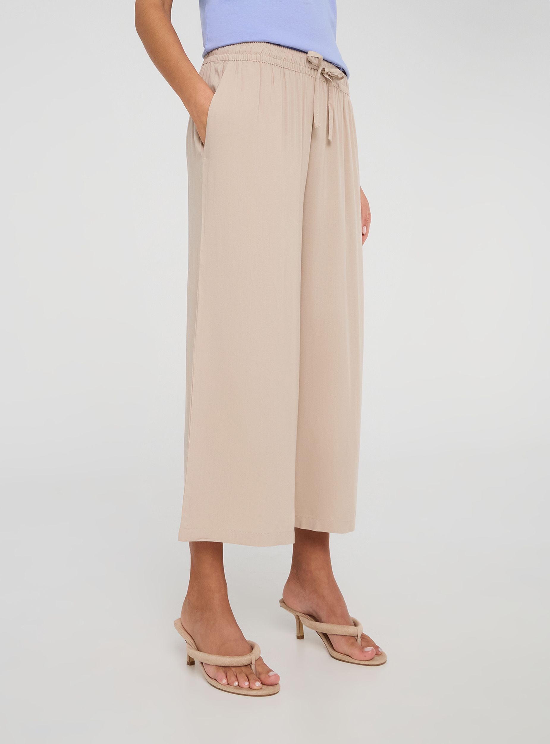 Pantaloni da donna caratterizzati da un design tinta unita con linea ampia a palazzo. La lunghezza crop dona un tocco moderno e versatile, perfetto per abbinamenti casual o eleganti. Sono dotati di tasche laterali pratiche e funzionali, oltre a una comoda coulisse in vita che permette di regolare la vestibilità in modo ottimale. L'elastico in vita assicura comfort e flessibilità durante l'uso, rendendo questi pantaloni ideali per chi cerca uno stile sofisticato senza rinunciare alla comodità.Detalji