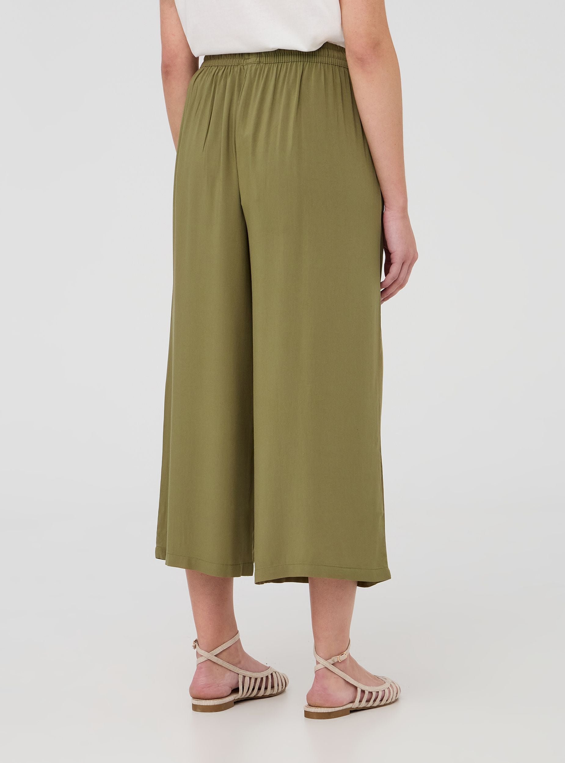 Pantaloni da donna caratterizzati da un design tinta unita con linea ampia a palazzo. La lunghezza crop dona un tocco moderno e versatile, perfetto per abbinamenti casual o eleganti. Sono dotati di tasche laterali pratiche e funzionali, oltre a una comoda coulisse in vita che permette di regolare la vestibilità in modo ottimale. L'elastico in vita assicura comfort e flessibilità durante l'uso, rendendo questi pantaloni ideali per chi cerca uno stile sofisticato senza rinunciare alla comodità.Detalji