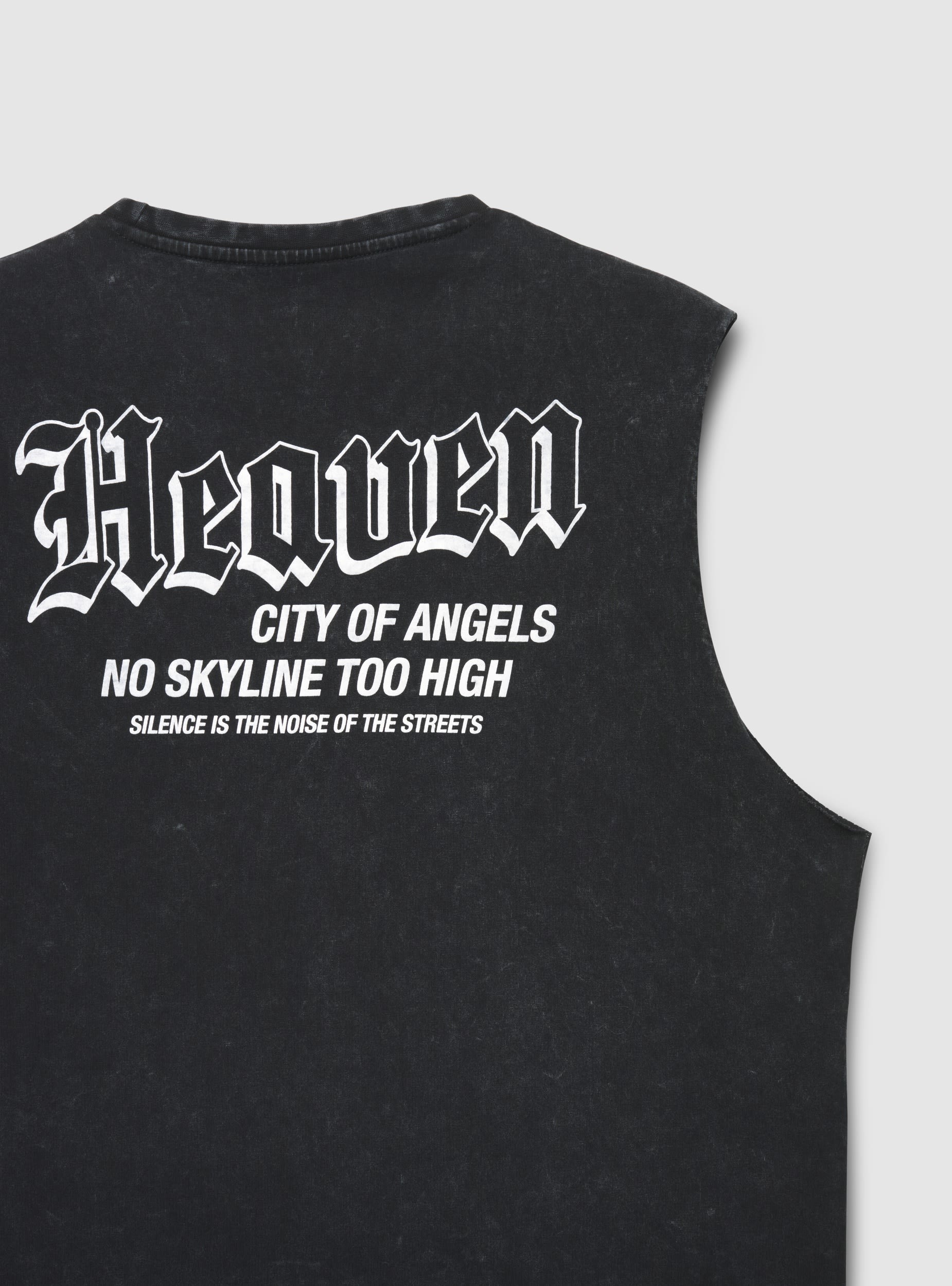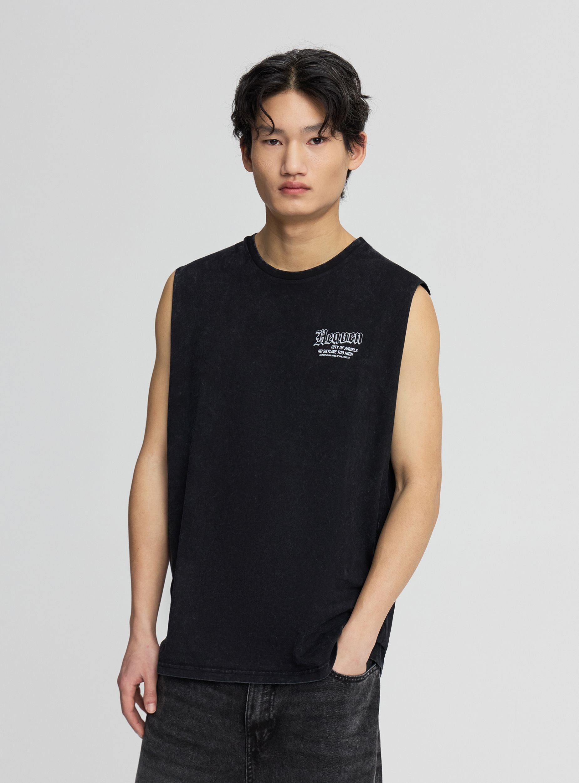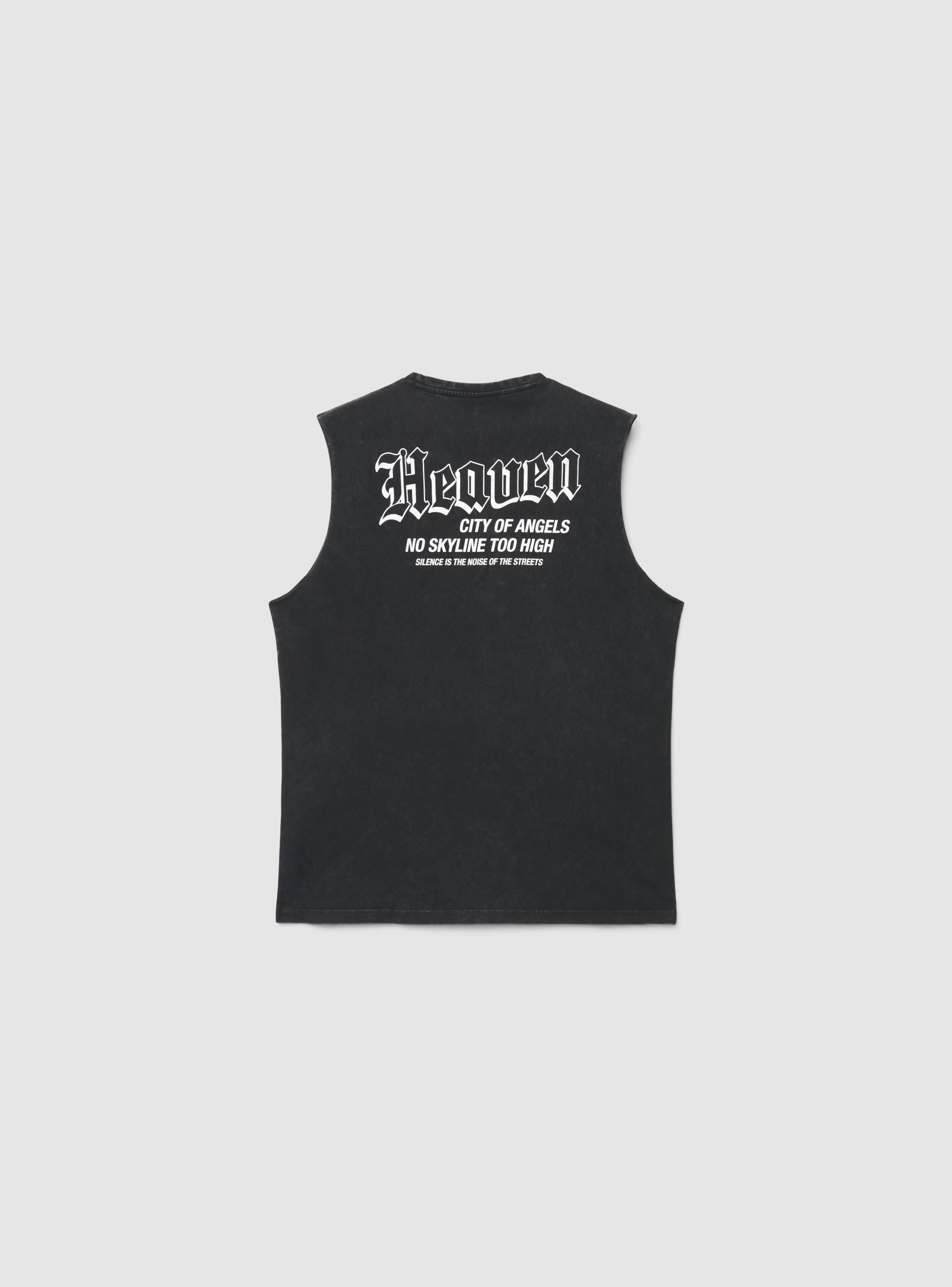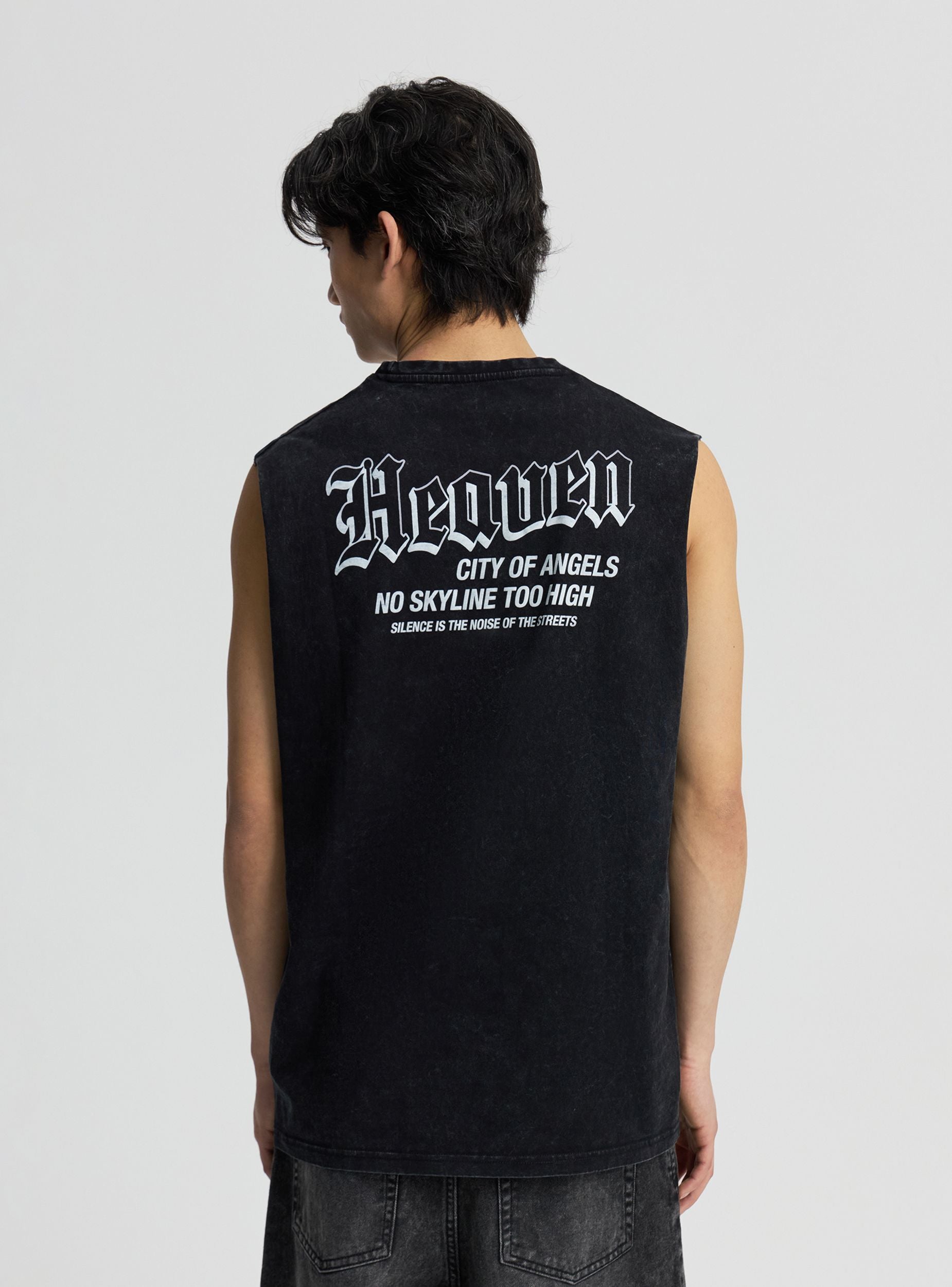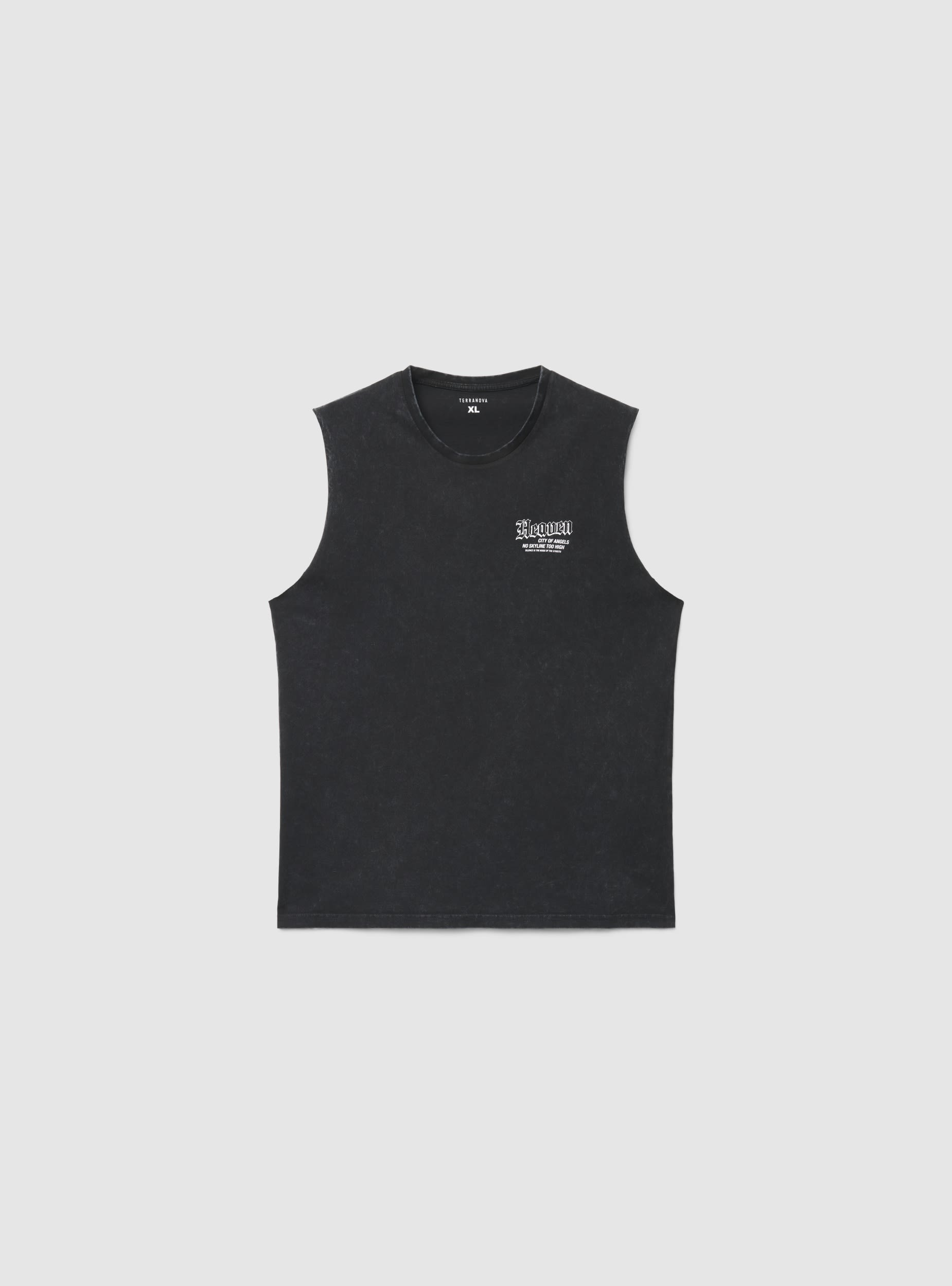 Muška majica bez rukava sa okruglim izrezom i natpisom u gotičkom stilu, dizajnirana za urban i street izgled. Pravi kroj pruža udobno nošenje uz farmerke, bermude ili cargo pantalone. Savršena za slobodno vreme i koncerte, lako se kombinuje sa otvorenim košuljama ili laganim jaknama za slojevite outfite.