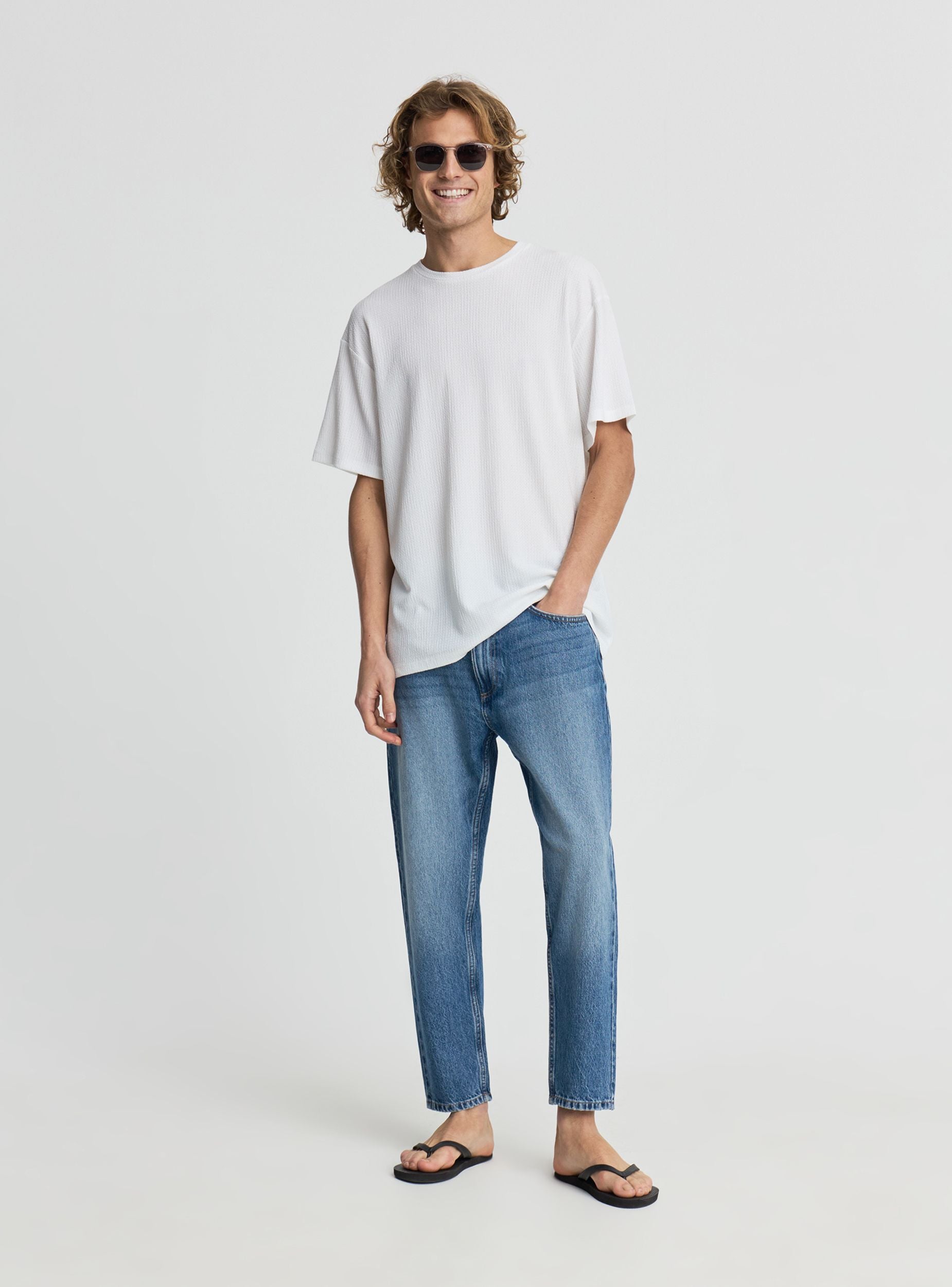 Muška jednobojna majica sa okruglim izrezom i kratkim rukavima, izrađena od tkanog materijala koji dodaje teksturu izgledu. Krojenje je regularno, idealno za ležerne i urbane kombinacije. Savršena uz farmerke i patike ili ispod lagane otvorene košulje. Svestrana za svaki dan i lako se uklapa u bilo koje godišnje doba.Detalji