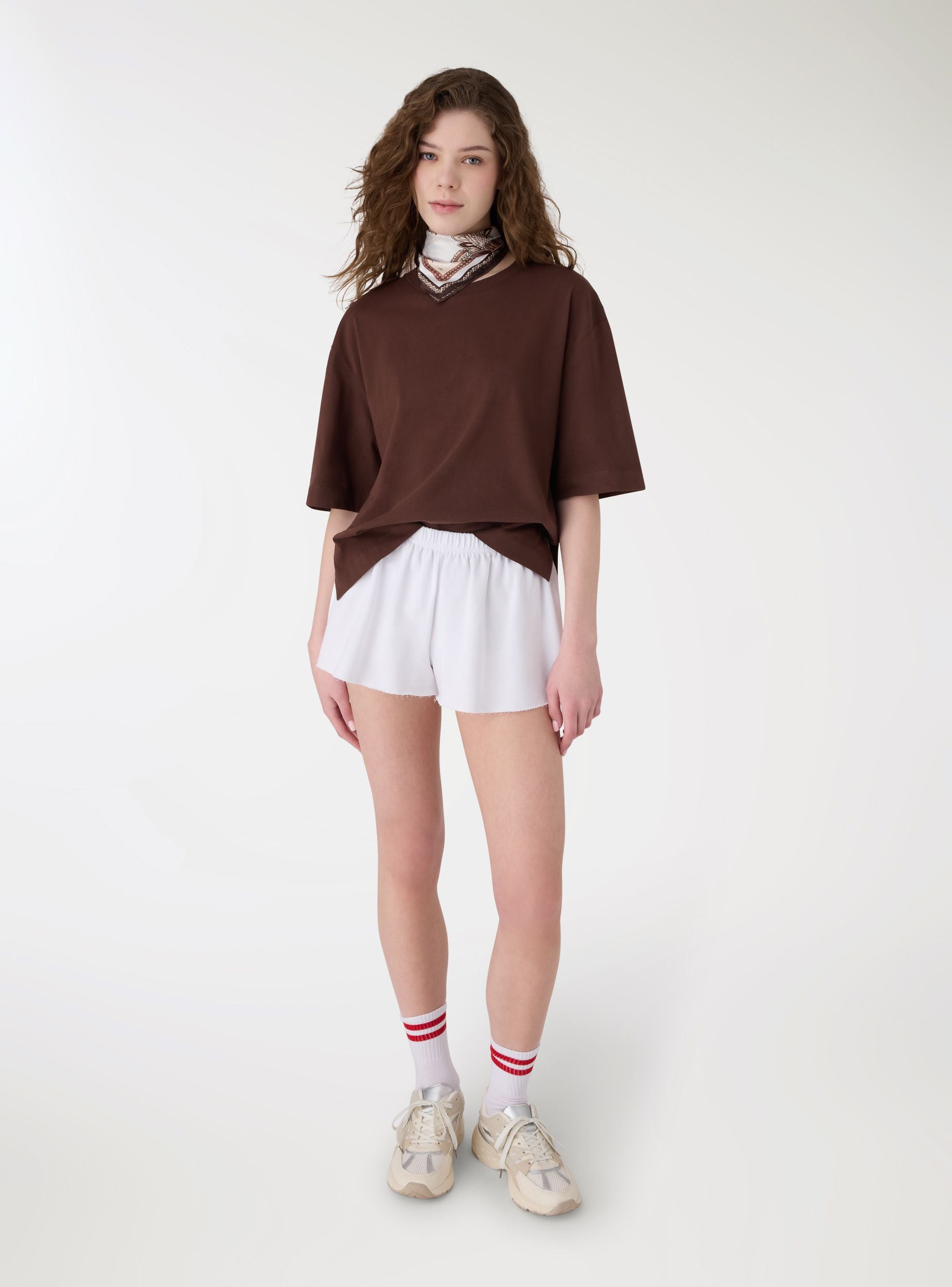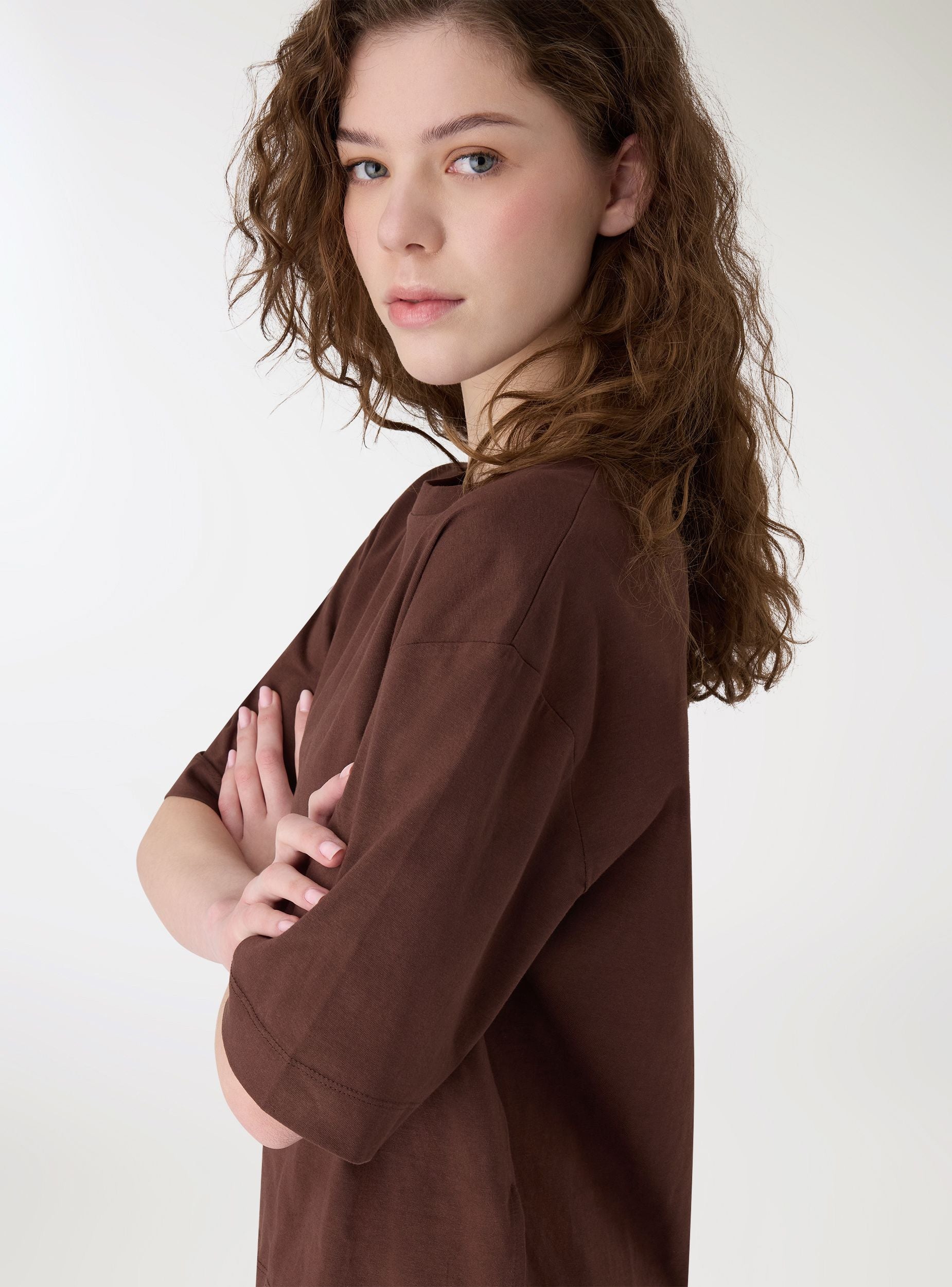 Ženska oversize majica u jednobojnoj varijanti, sa spuštenim ramenima i kratkim rukavima. Okrugli izrez i blago skraćeni kroj, idealna za casual i urbani stil. Savršena uz farmerke sa visokim strukom, cargo pantalone ili midi suknje za svestrani outfit. Mekani i udoban materijal, lako se kombinuje. Idealna za svakodnevno nošenje, može se slojevito nositi sa otvorenim košuljama ili laganim jaknama.Detalji