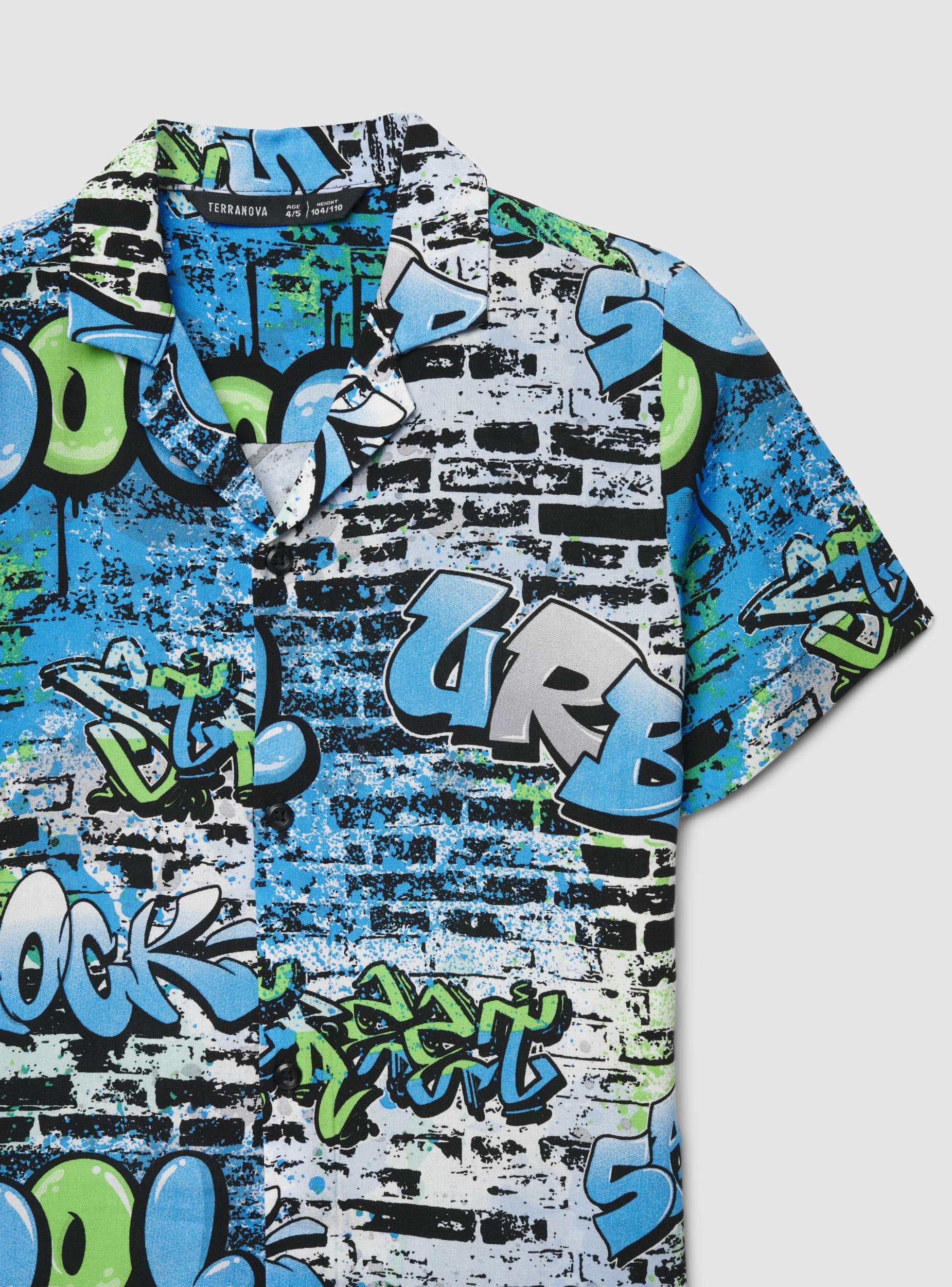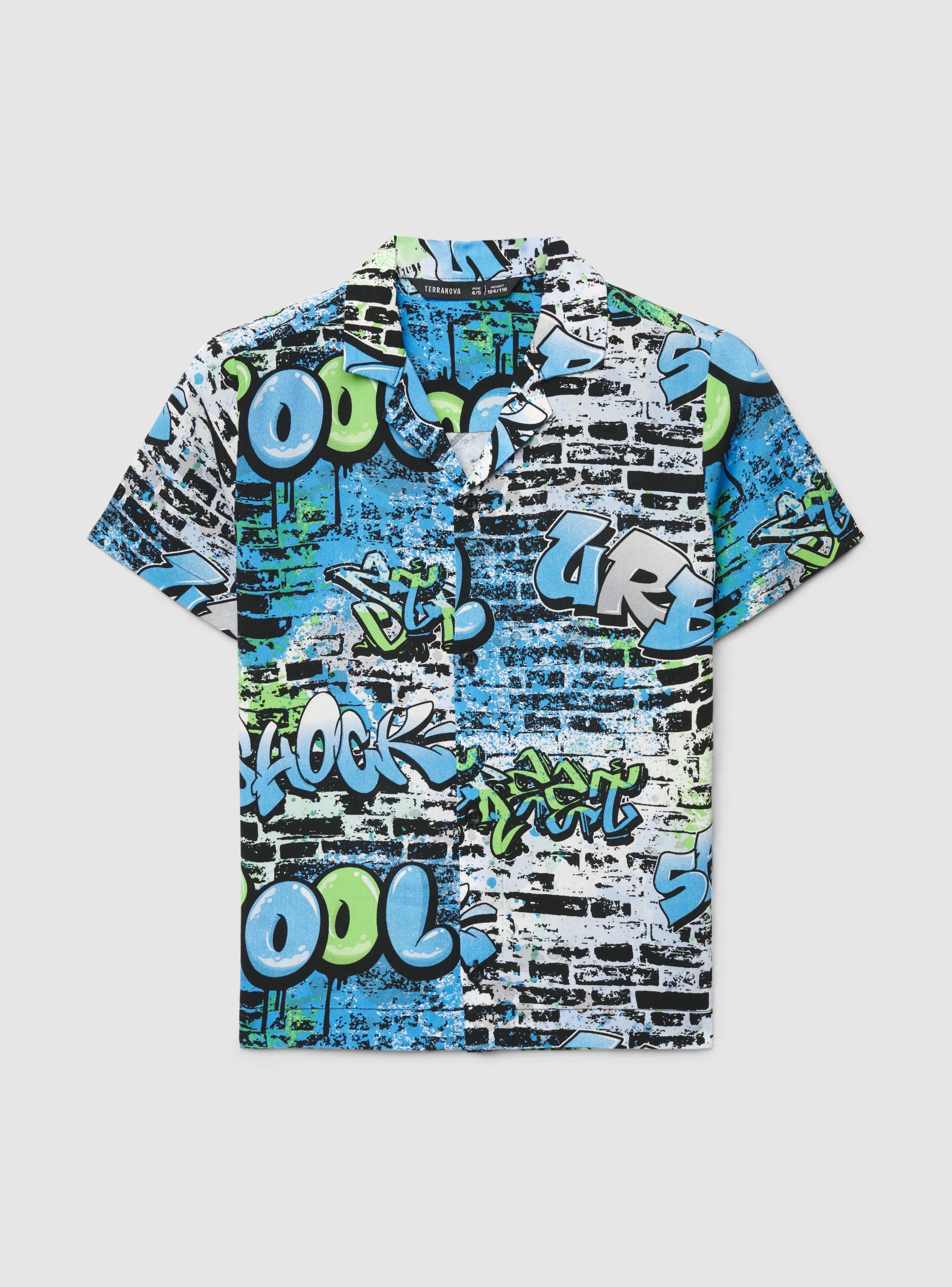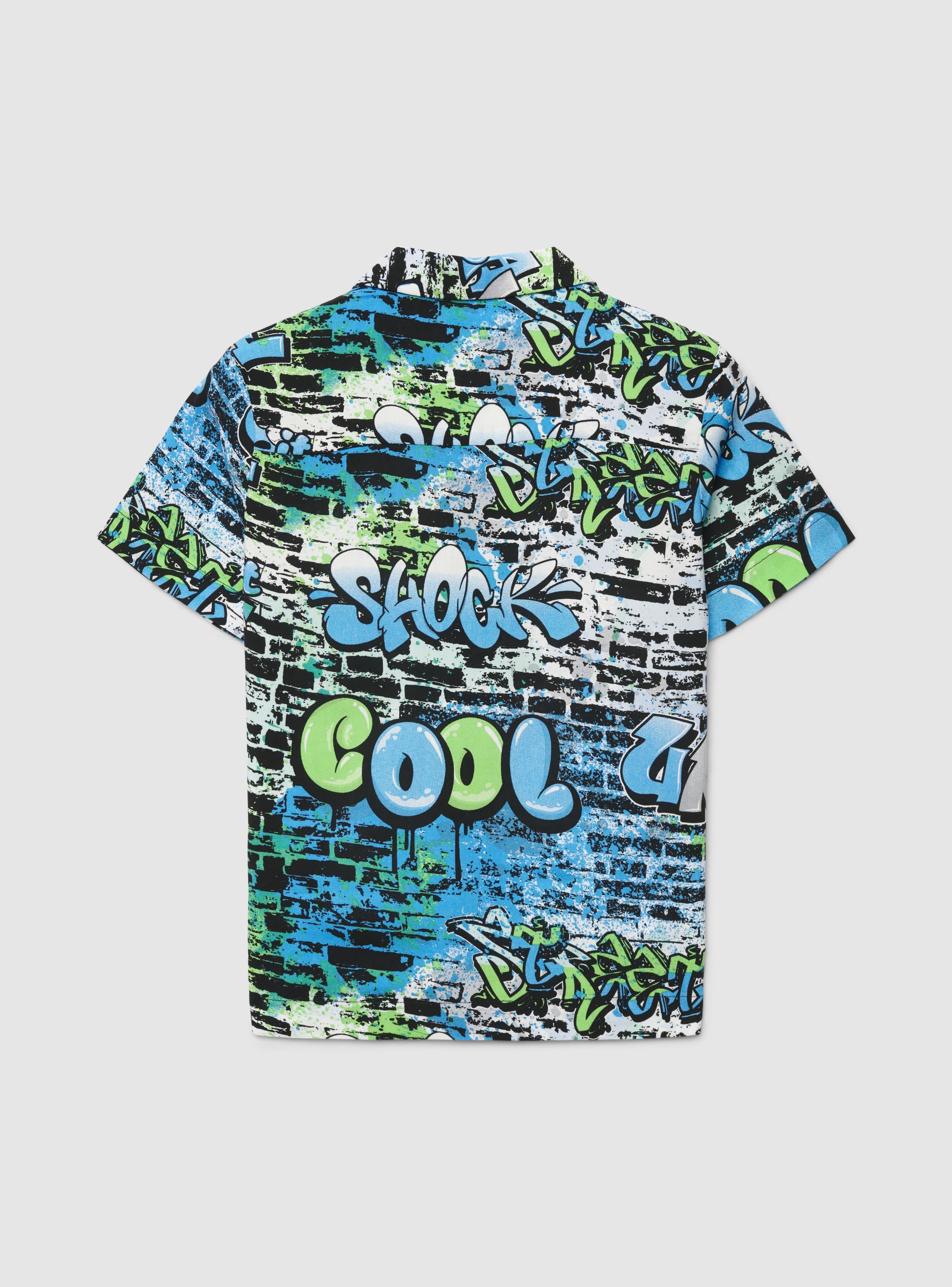 Dečija košulja kratkih rukava sa grafiti printom i natpisima po celoj površini, idealna za urbani stil i dane odmora. Otvoreni havajski kragnu i prednje kopčanje na dugmad za udobno pristajanje. Lako se kombinuje sa bermudama ili farmerkama i patikama, savršena za školu ili slobodno vreme zahvaljujući upečatljivom dizajnu i ravnom kroju.Detalji