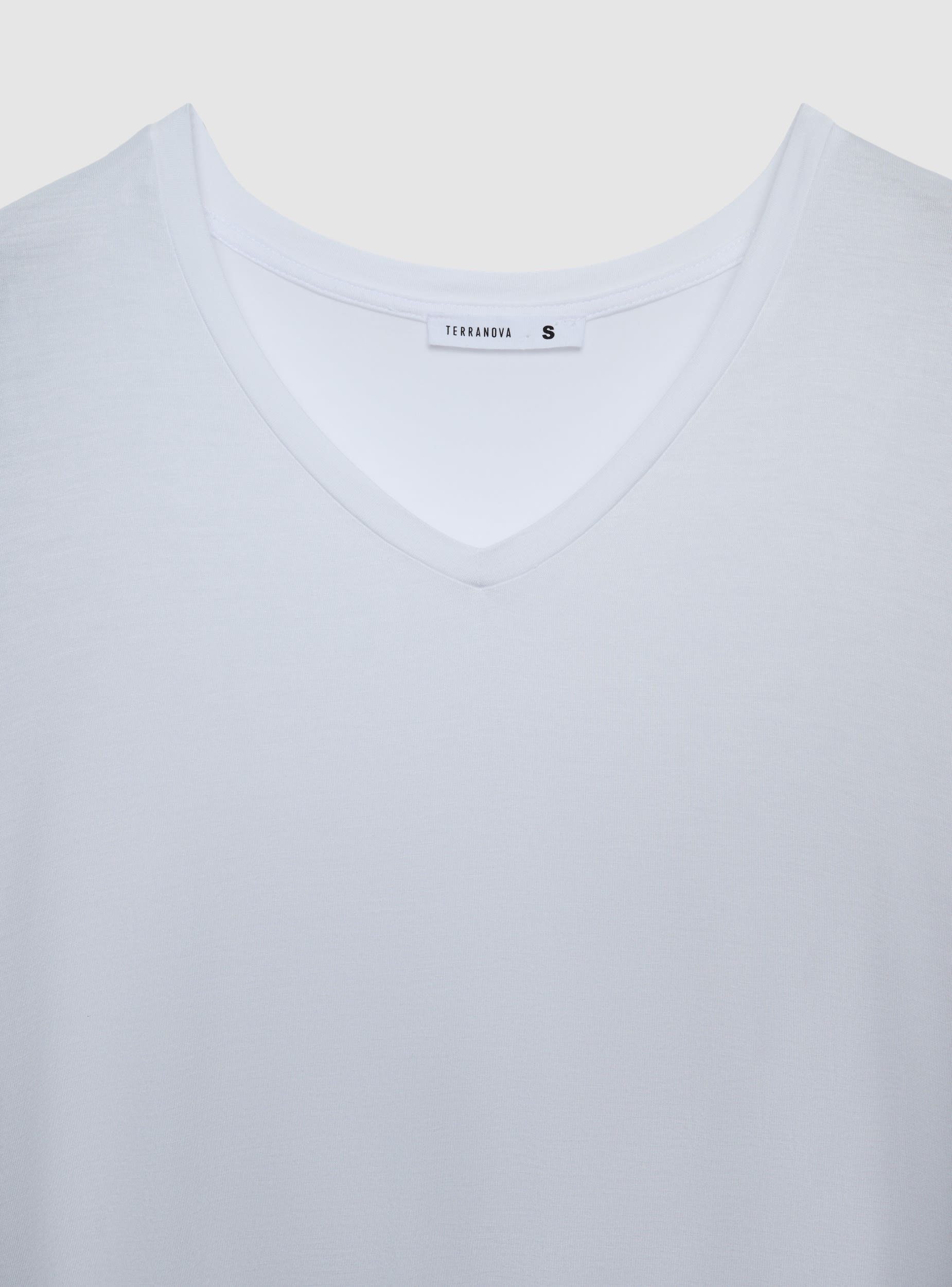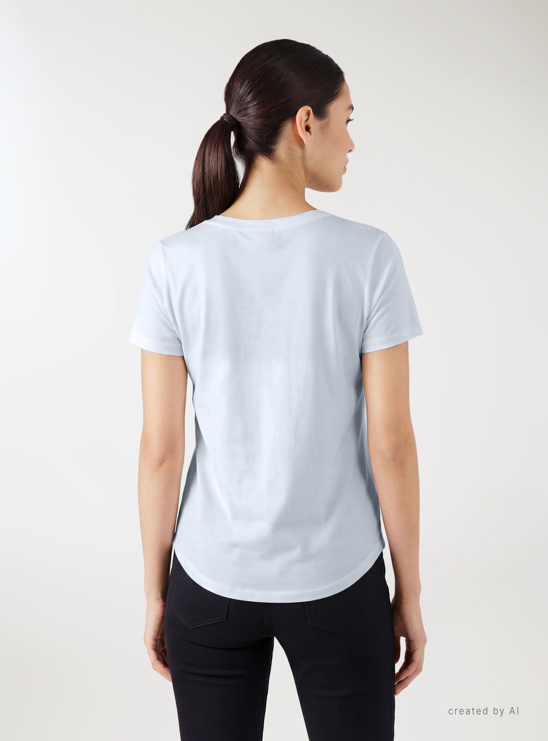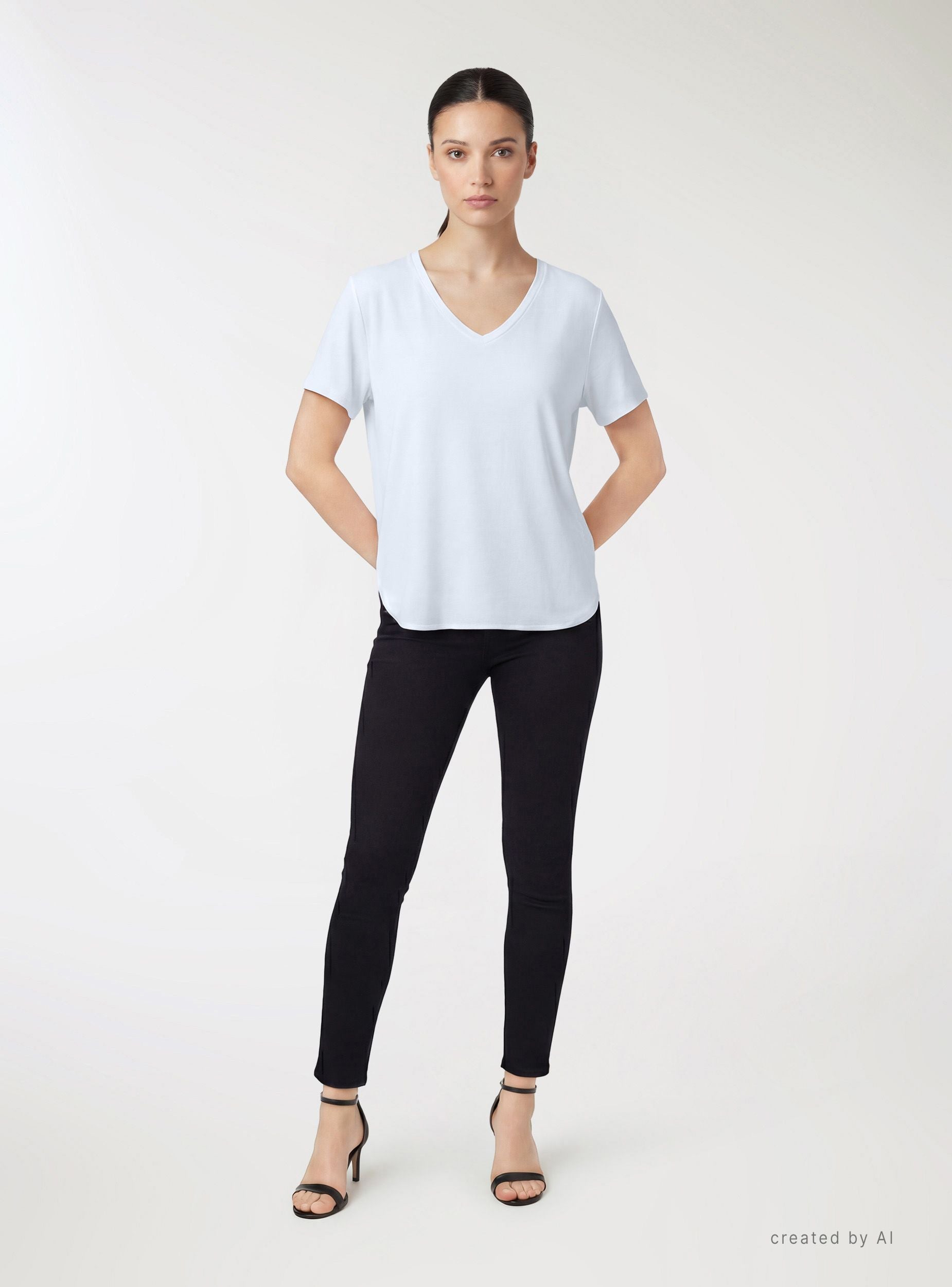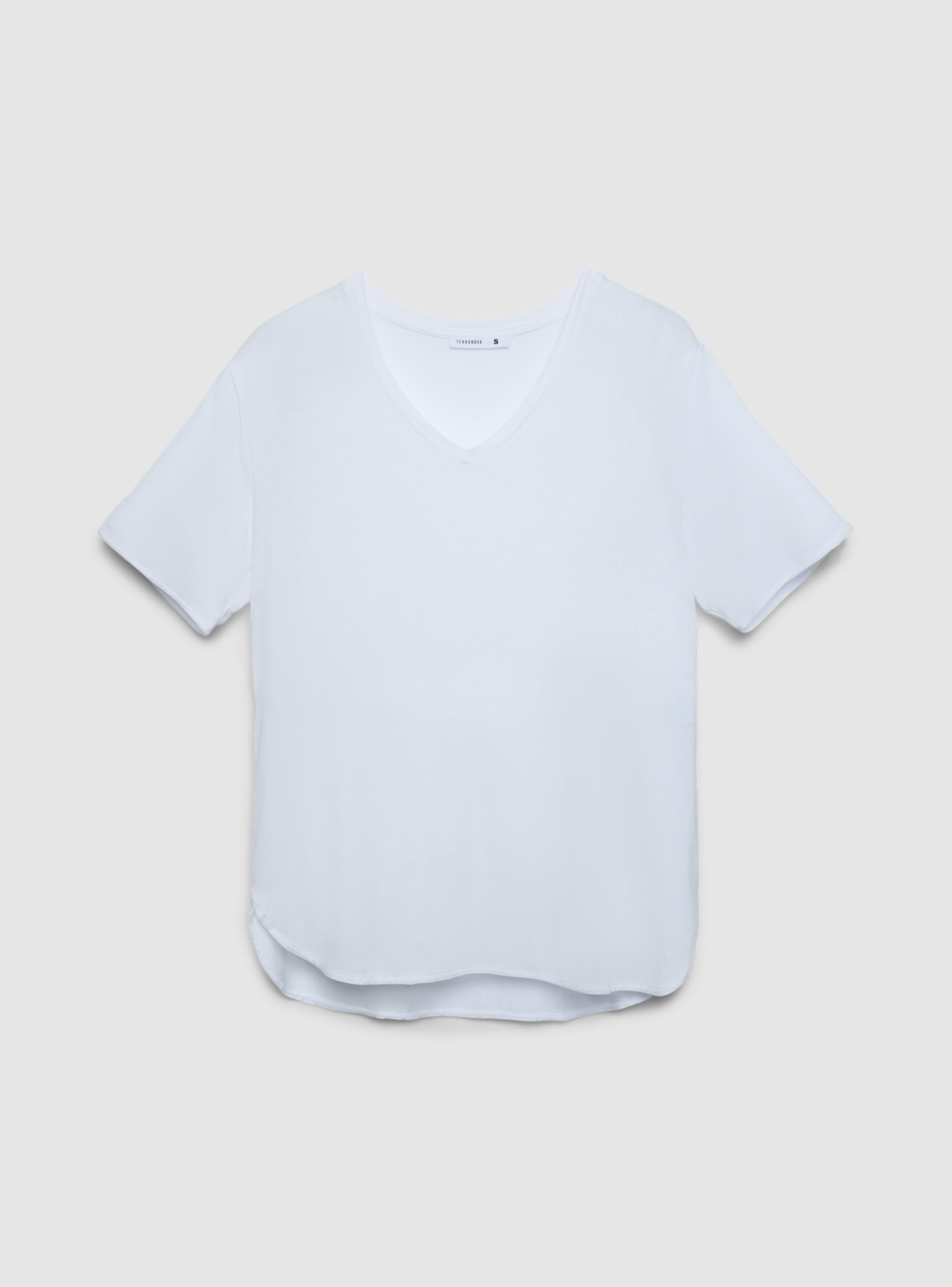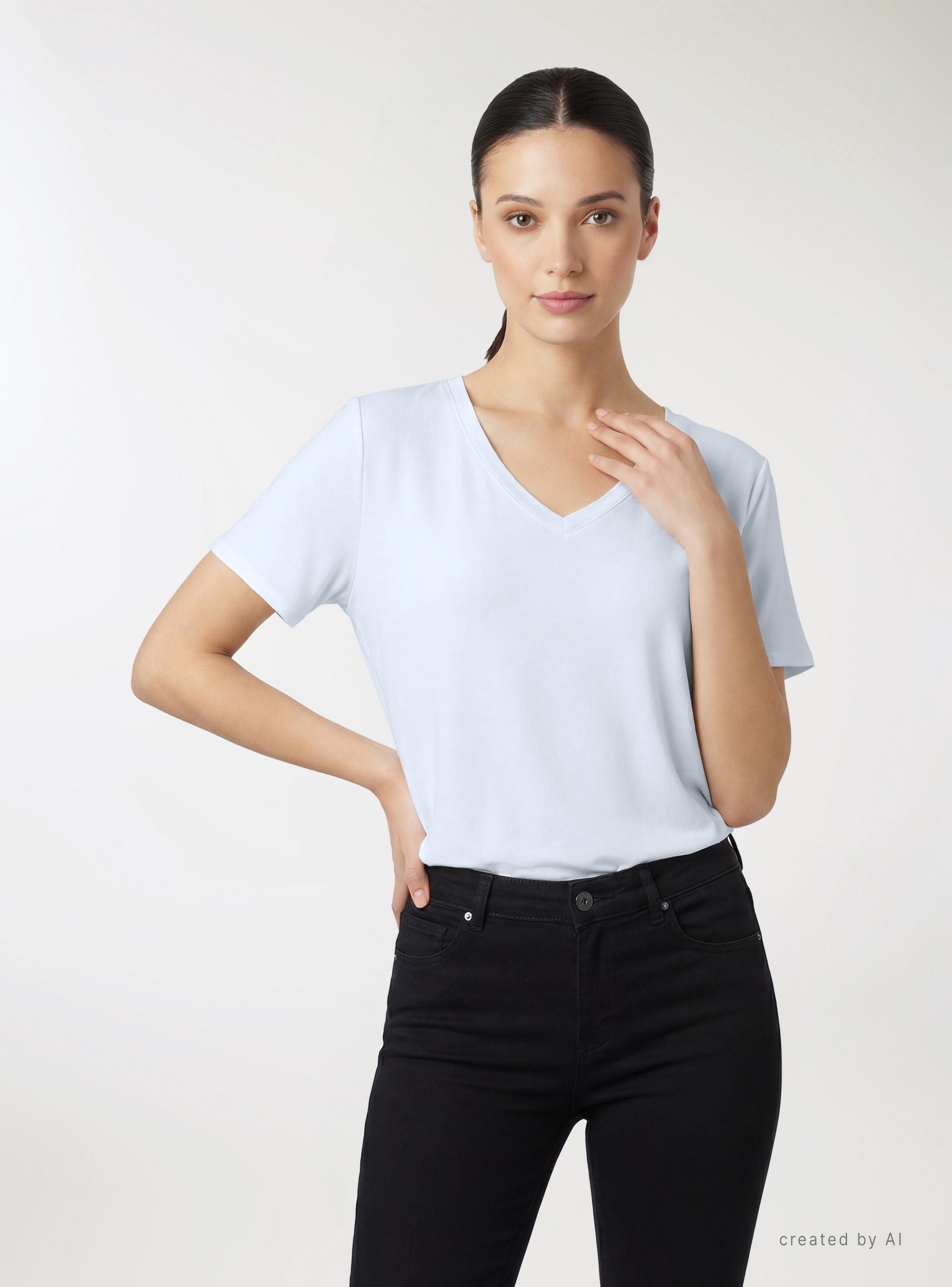 Ženska majica sa V-izrezom, kratkim rukavima i jednobojnim završetkom. Krojenje je mekano i lepršavo, sa zaobljenim donjim delom. Idealna za svakodnevne ležerne kombinacije, lako se slaže sa farmerkama, suknjama ili šortsevima. Savršena i ispod laganih blejzera. Jednostavan i udoban dizajn, osmišljen da istakne minimalističke i svestrane outfite.Detalji