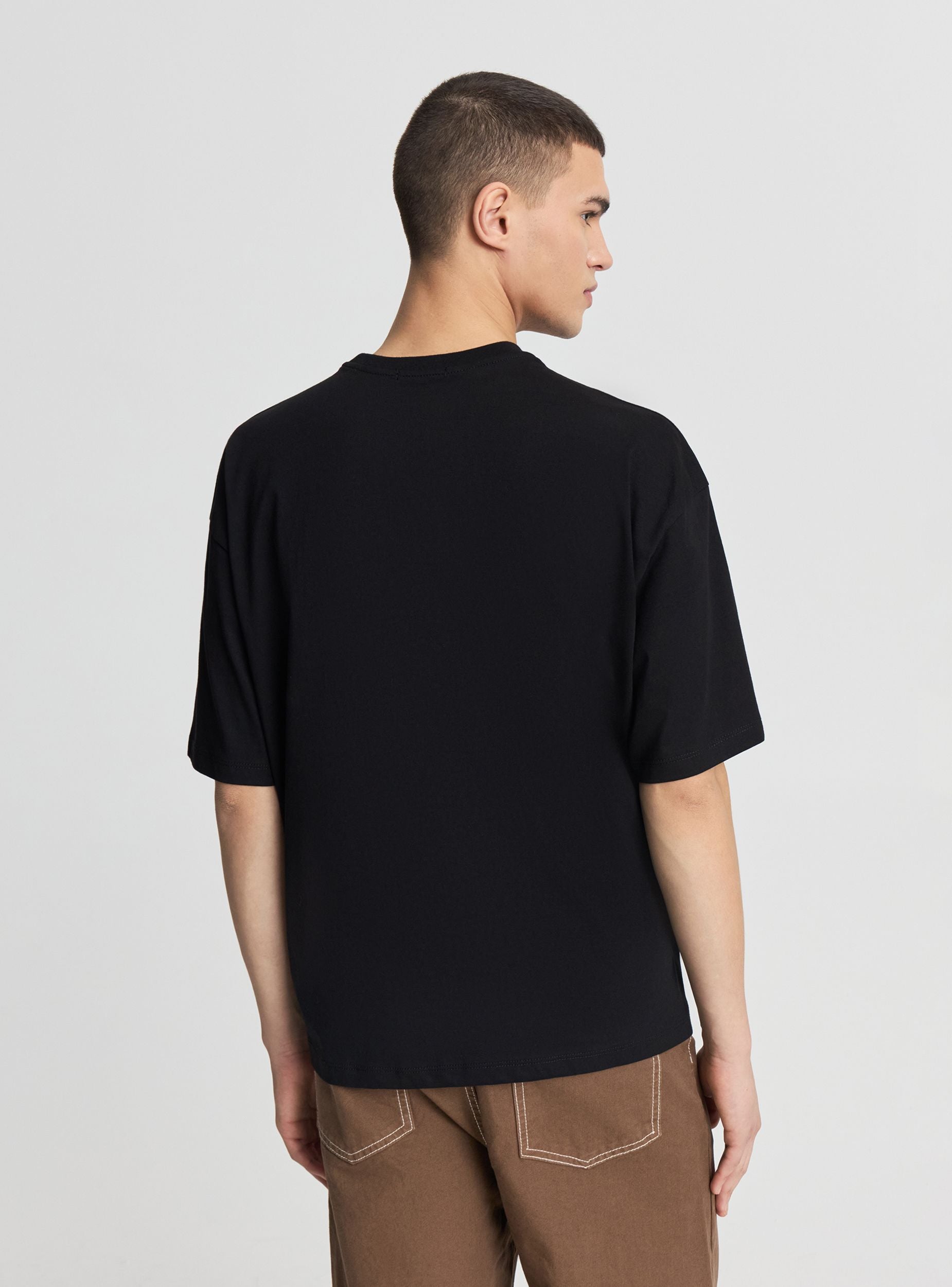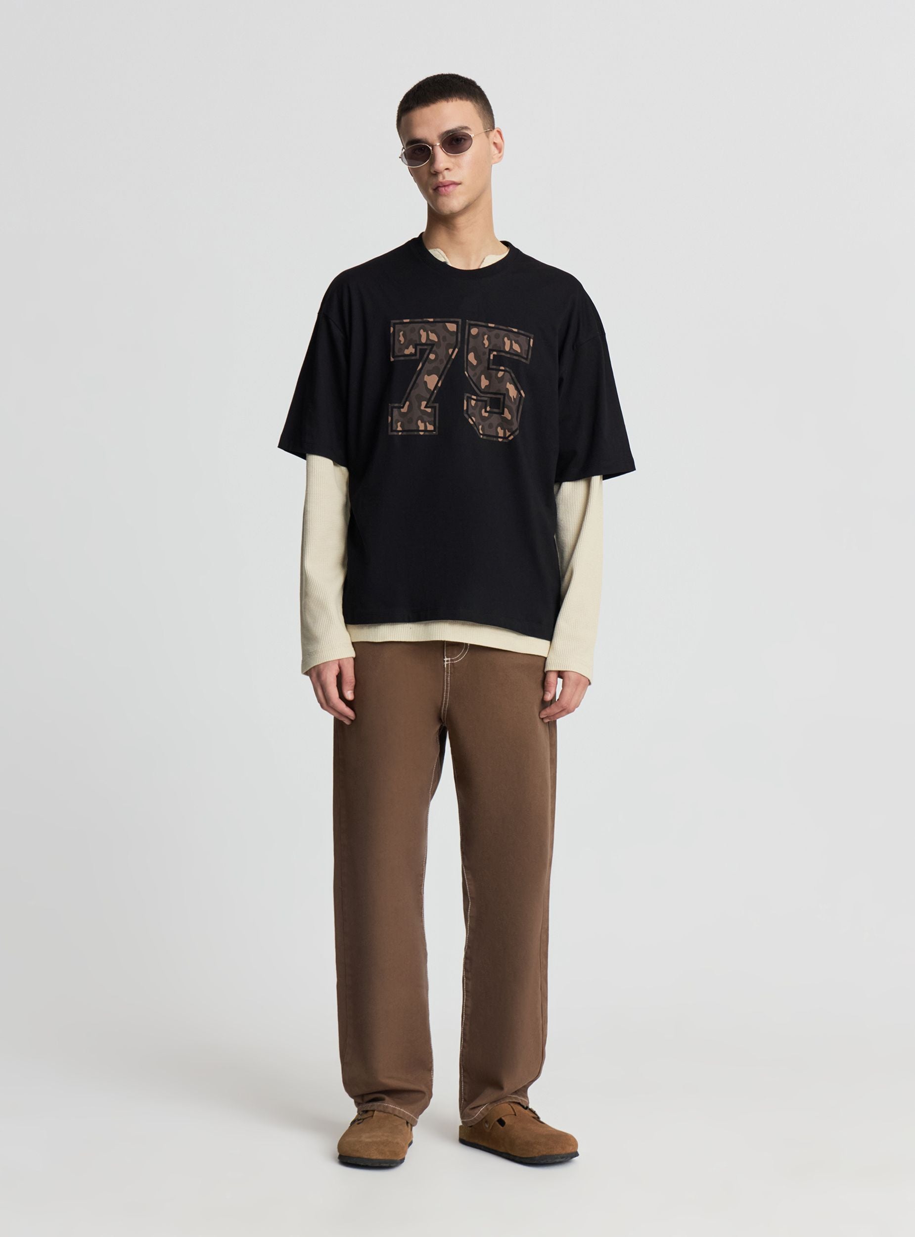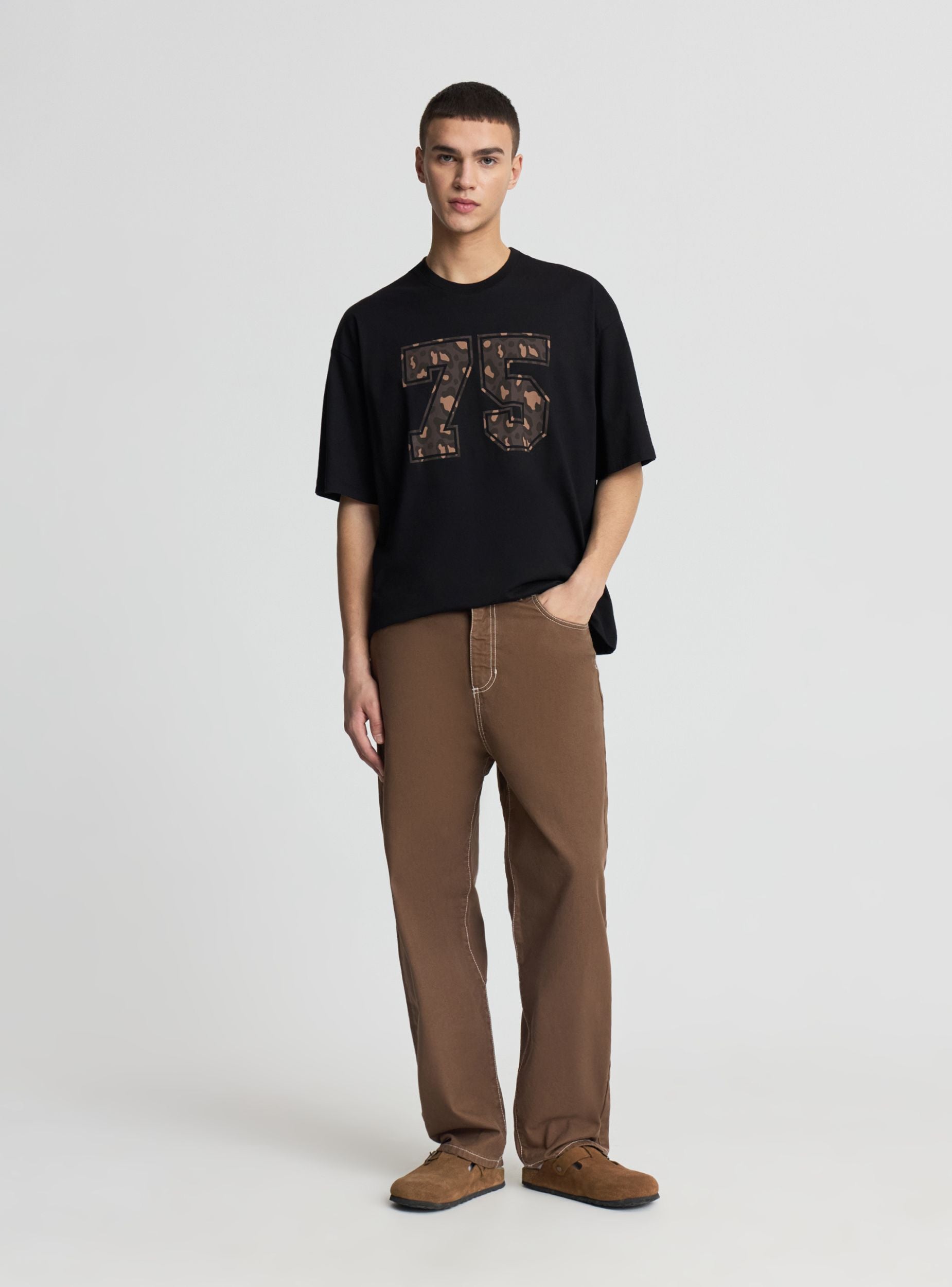 Muška majica sa oversize krojem i kratkim rukavima, idealna za urbane i opuštene kombinacije. Okrugli izrez i grafika sprijeda sa brojem u štampi, savršena uz farmerke ili šortseve za slobodno vreme. Jednobojni dizajn sa numeričkim natpisom, lako se kombinuje ispod lagane jakne ili duksa. Mekani materijal zahvaljujući pamučnoj tkanju, dizajniran za svakodnevnu udobnost.Detalji