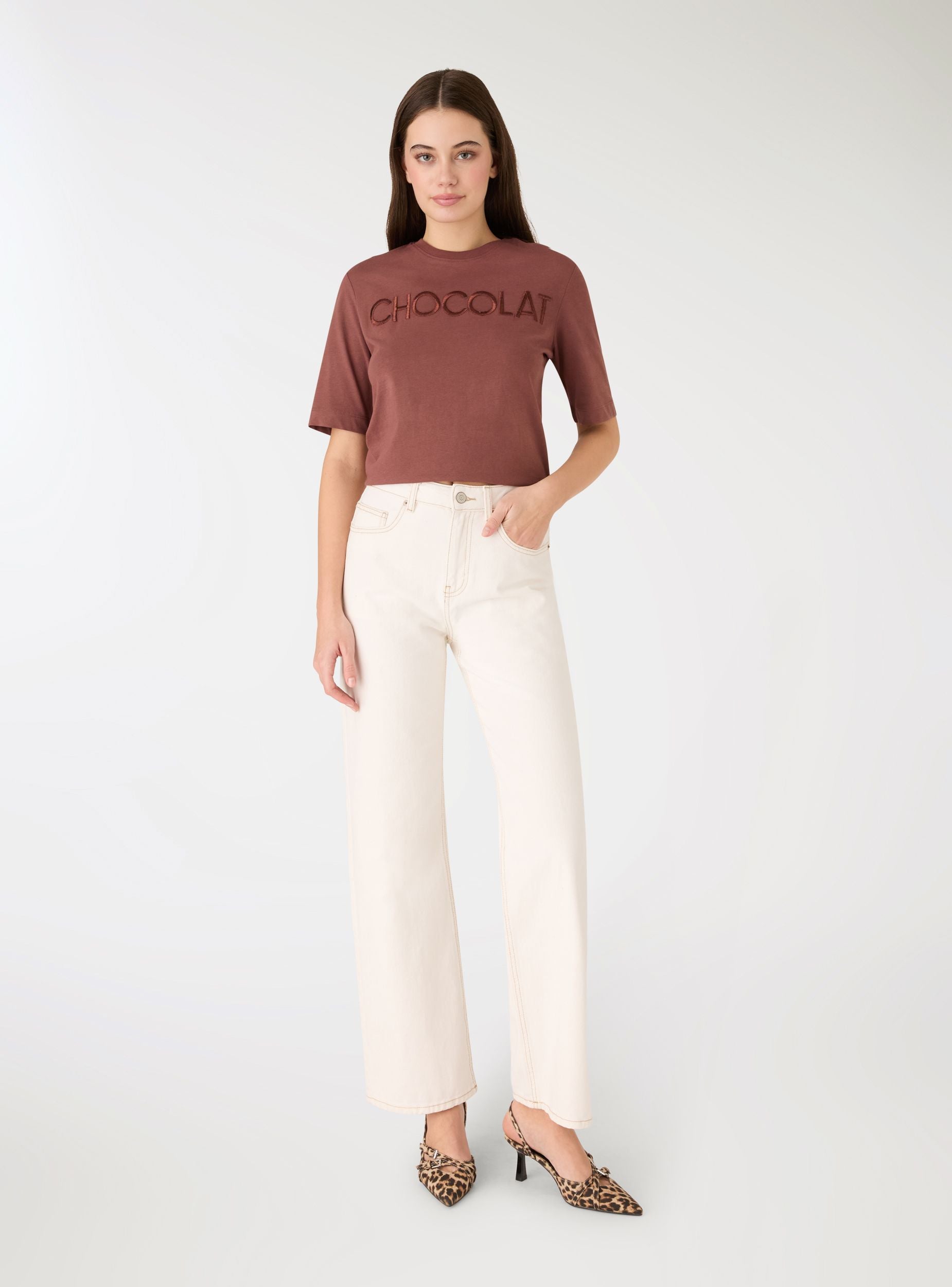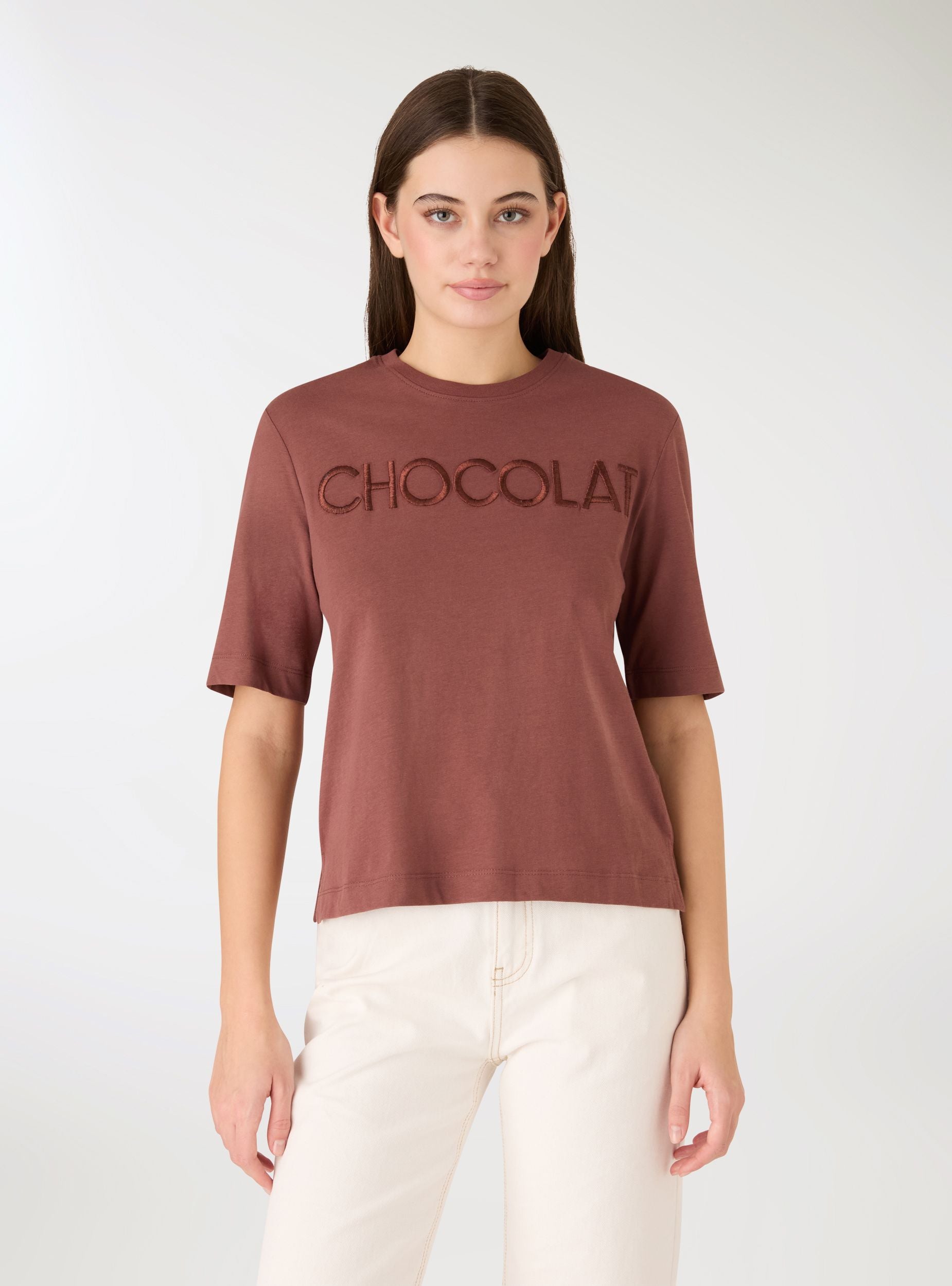 Ženska jednobojna majica sa izvezenim natpisom na prednjoj strani. Model sa okruglim izrezom i kratkim rukavima, regularnog kroja koji pruža svakodnevnu udobnost. Savršena uz farmerke, midi suknje ili šortseve za ležerni izgled. Izvez daje poseban detalj. Lako se kombinuje sa otvorenom košuljom ili laganom jaknom.Detalji