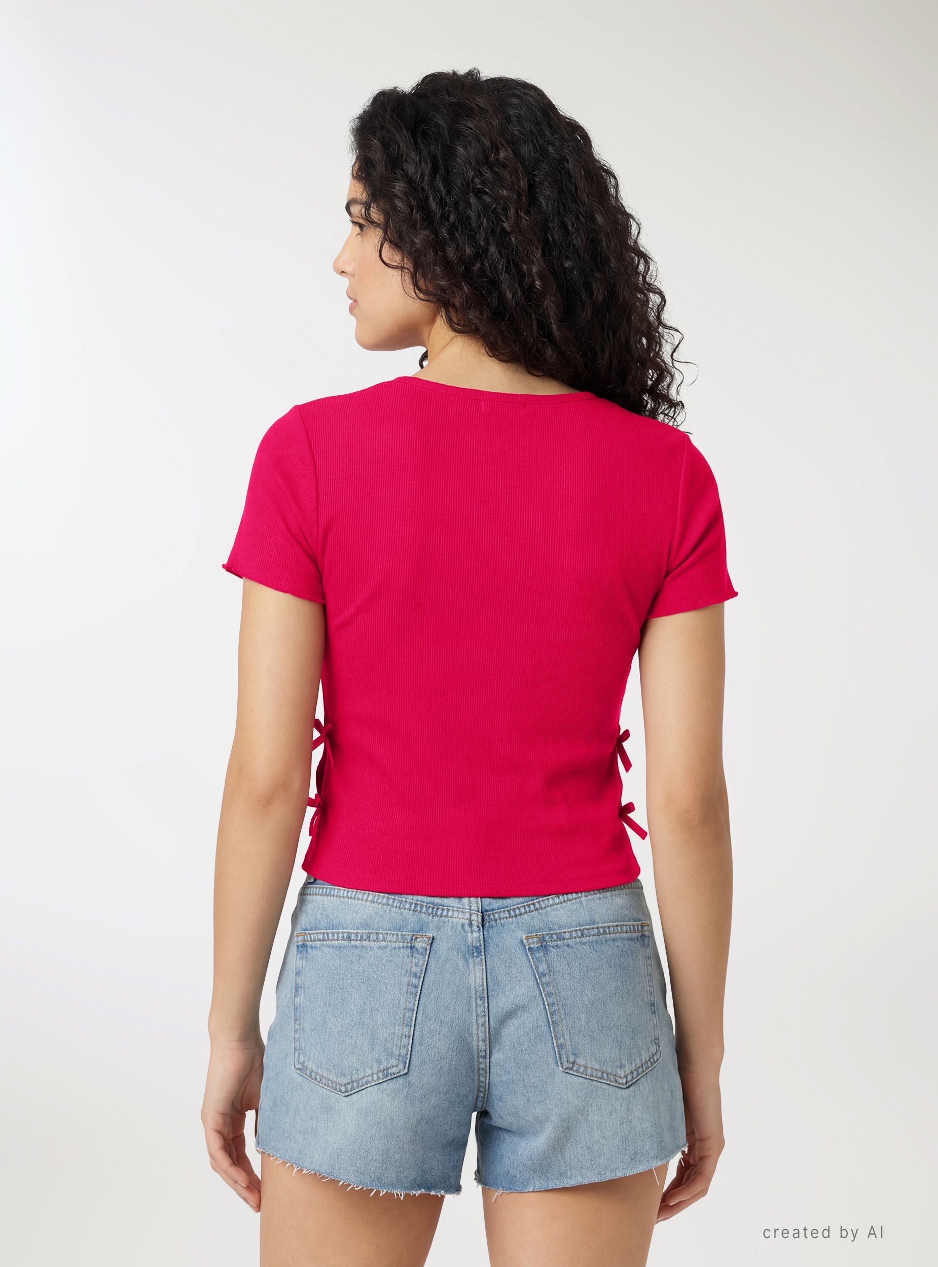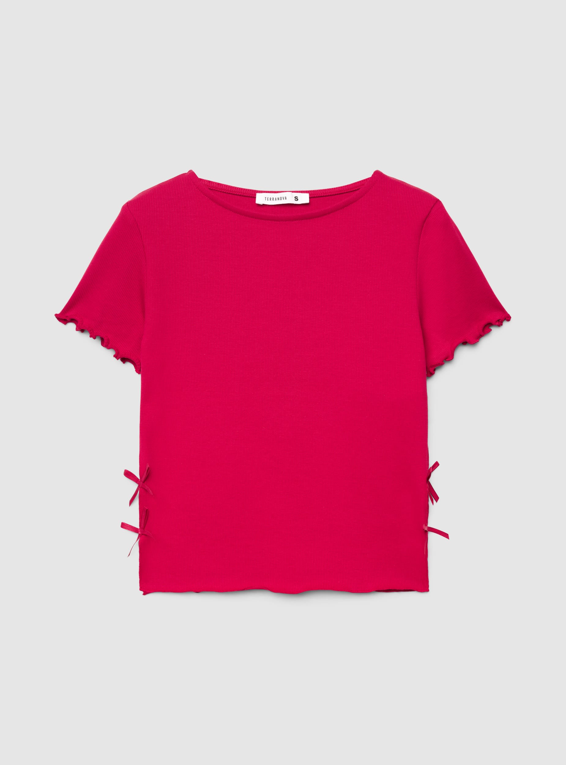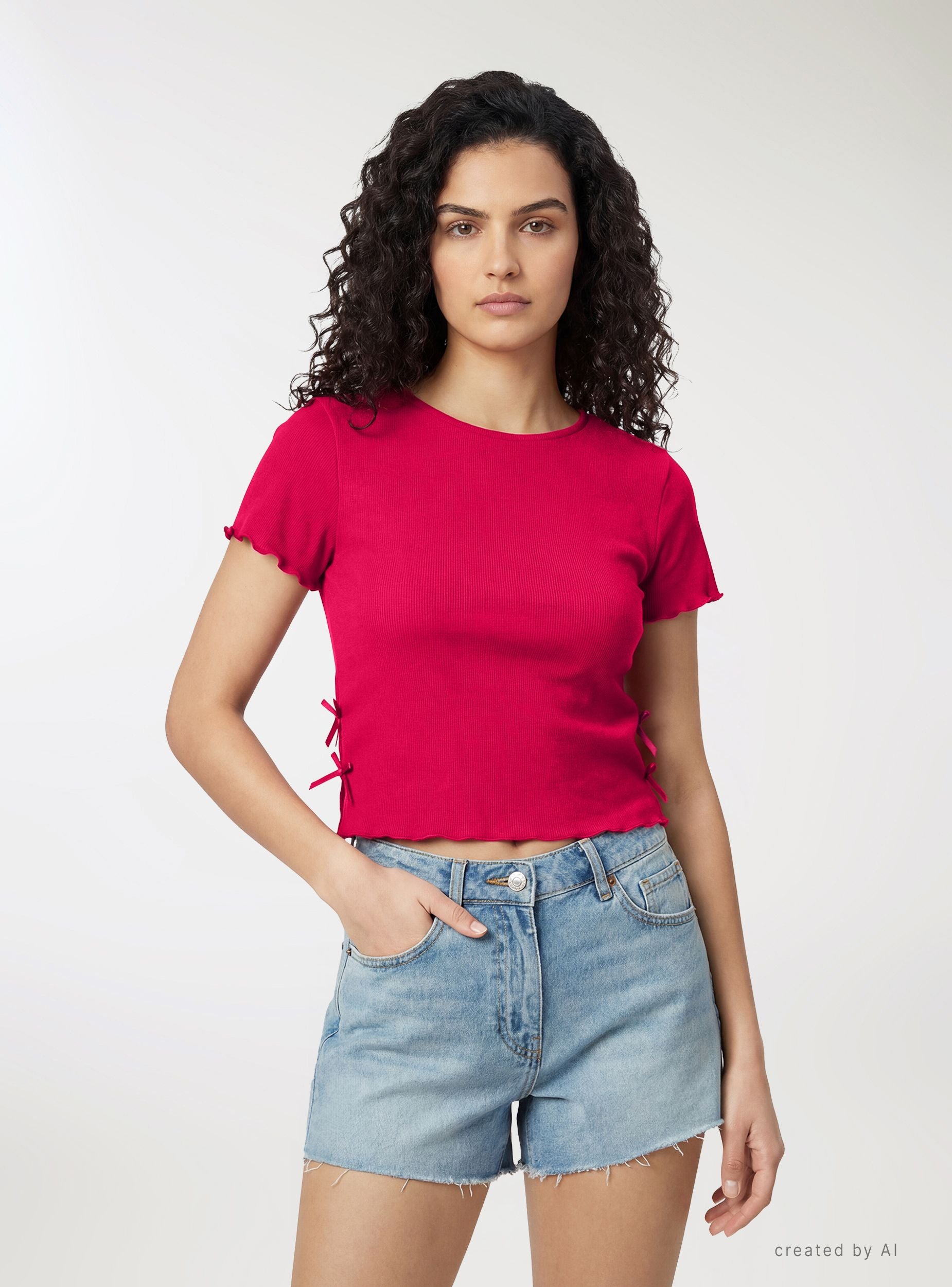 Ženska jednobojna majica sa okruglim izrezom i kratkim rukavima. Naborani detalji na ivicama rukava dodaju ženstven dodir, dok mali mašnice na bokovima ističu siluetu. Regularan kroj, idealan za slobodno vreme i u kombinaciji sa farmerkama, suknjama ili šortsevima. Jednostavan i svestran dizajn za svakodnevne odevne kombinacije.Detalji