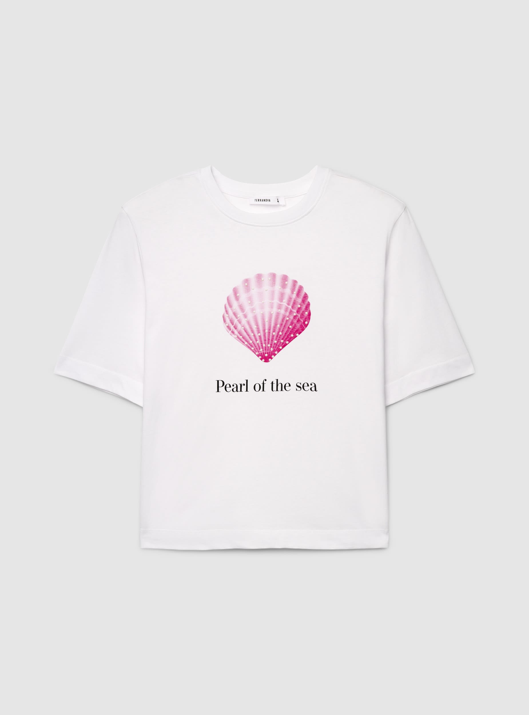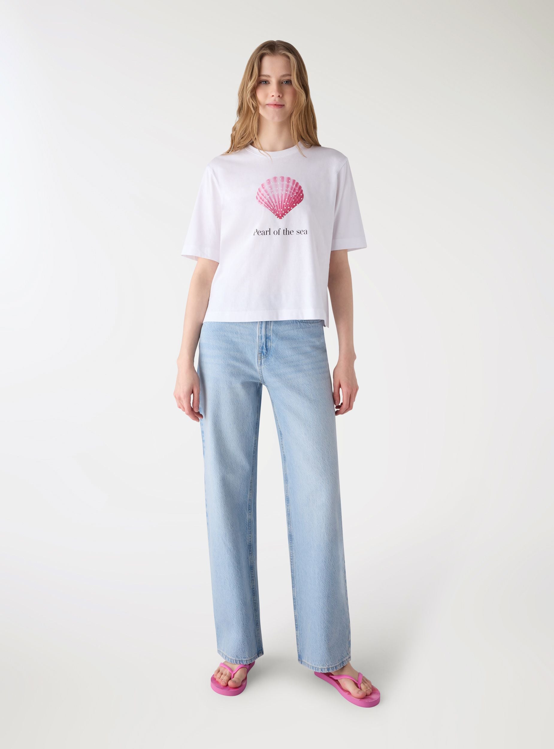 Ženska majica kratkih rukava sa okruglim izrezom i opuštenim krojem, dizajnirana za letnje izglede i slobodno vreme. Prednja štampa sa morskom temom, natpisom i detaljima od štrasa dodaje svetlucavi pečat. Lako se kombinuje sa farmerkama, šortsevima ili suknjama za ležerne kombinacije, bilo na odmoru ili za šetnju pored mora.Detalji