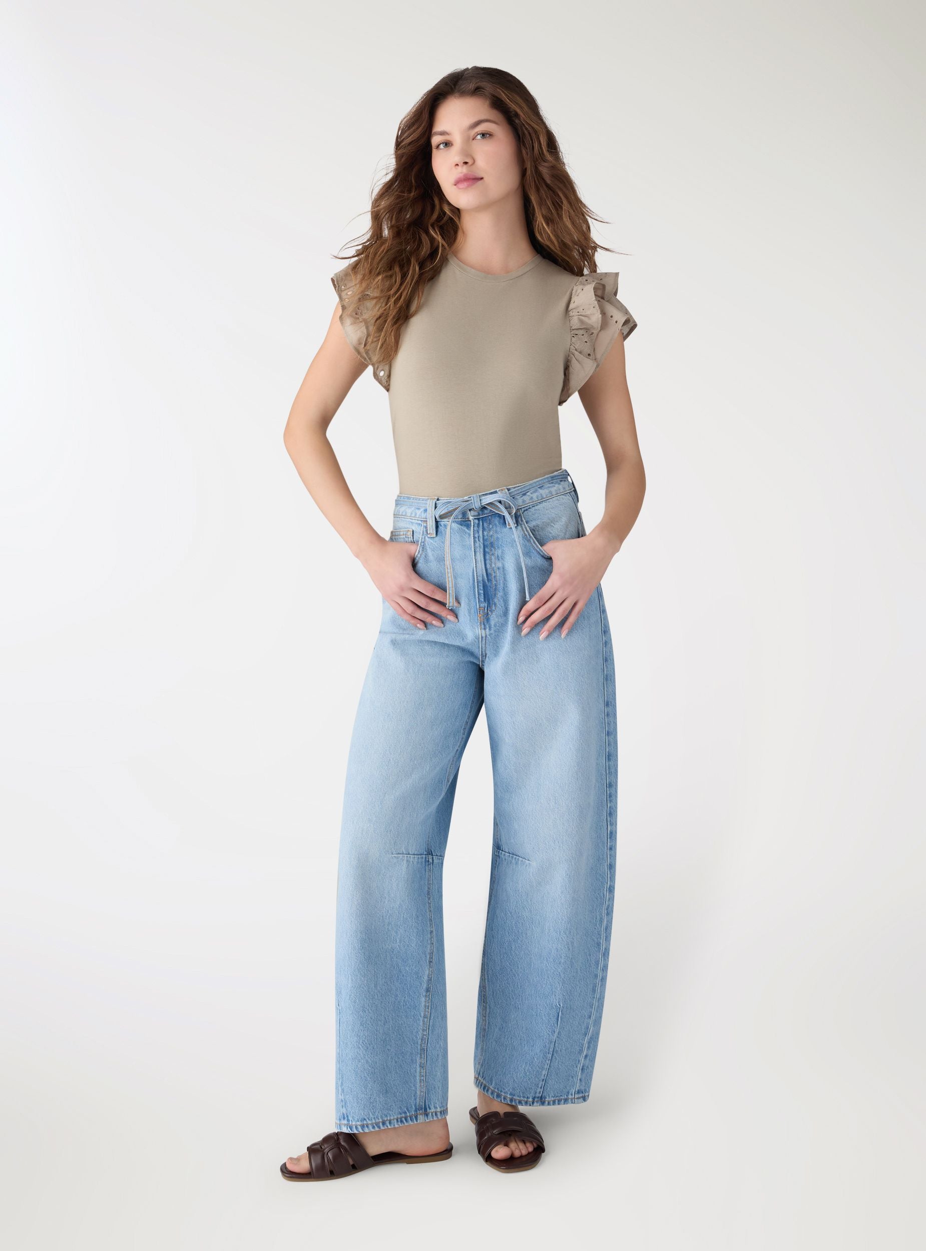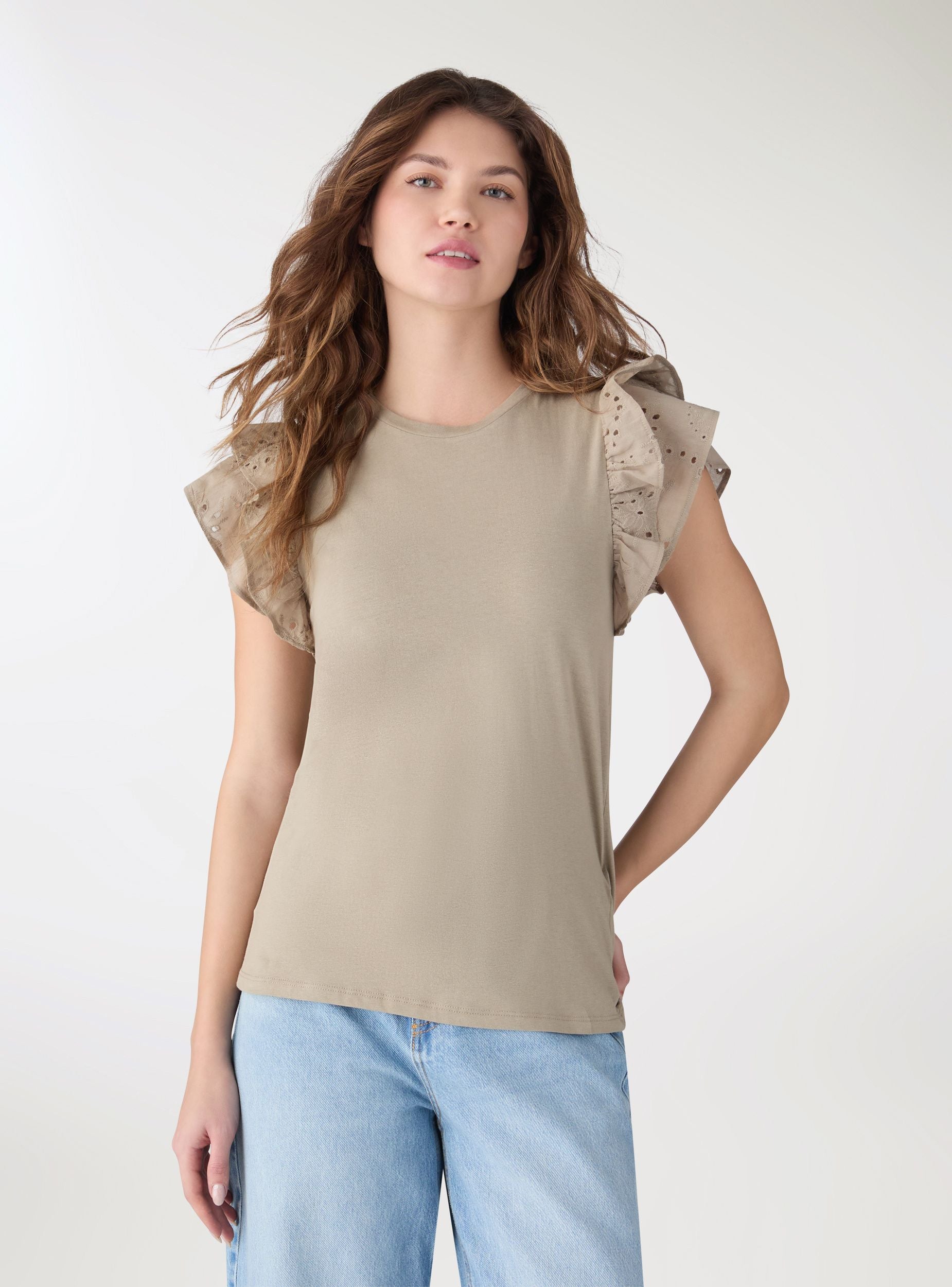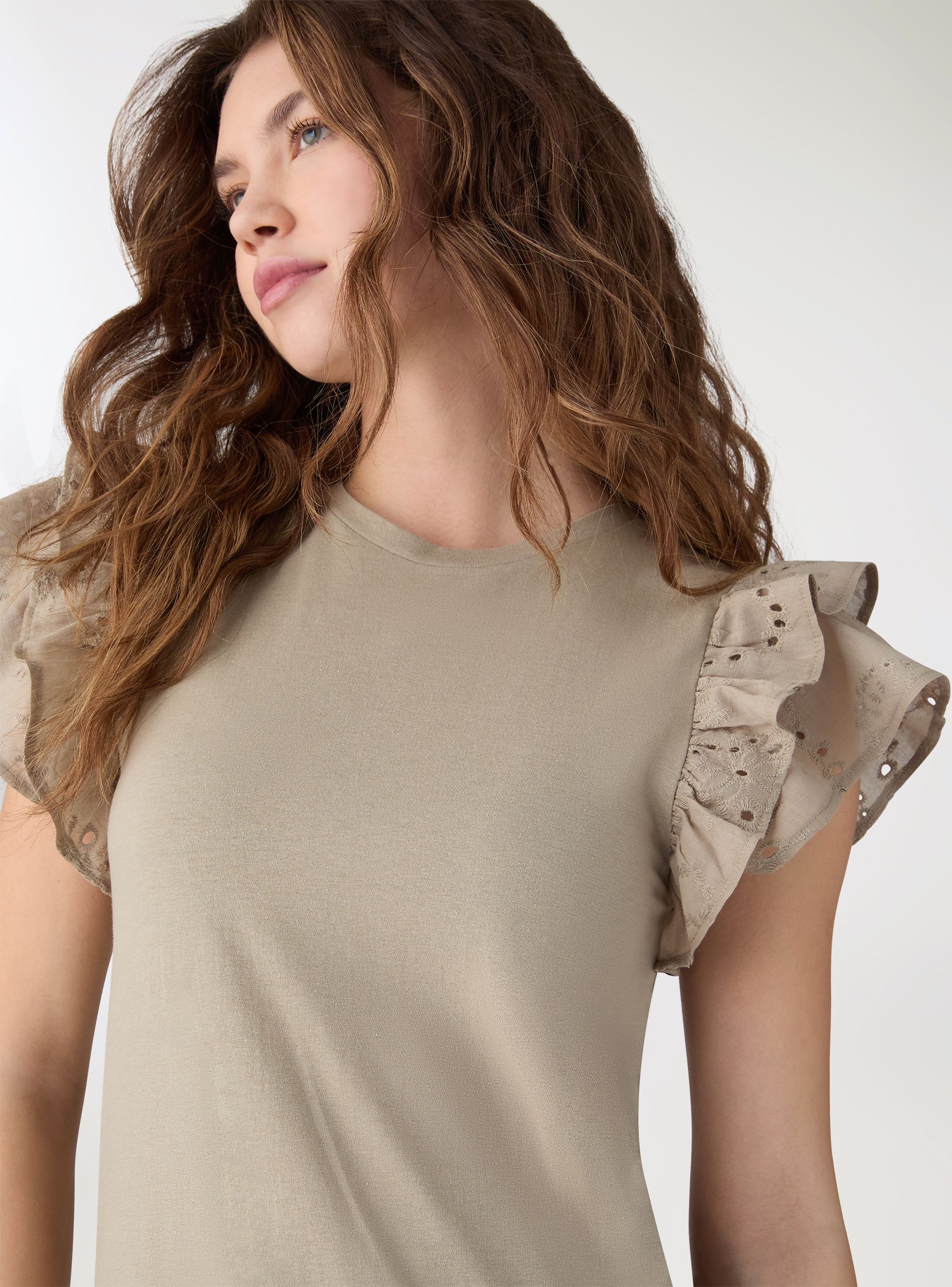 Ženska jednobojna majica sa okruglim izrezom i ravnim krojem, idealna za svakodnevne kombinacije sa farmerkama, pantalonama ili suknjama. Kratki rukavi su ukrašeni karnerima sa sangalo vezom koji dodaju volumen i romantičan dodir. Udoban regularni kroj, savršen i za uvući u pantalone i za nošenje opušteno preko njih.Detalji