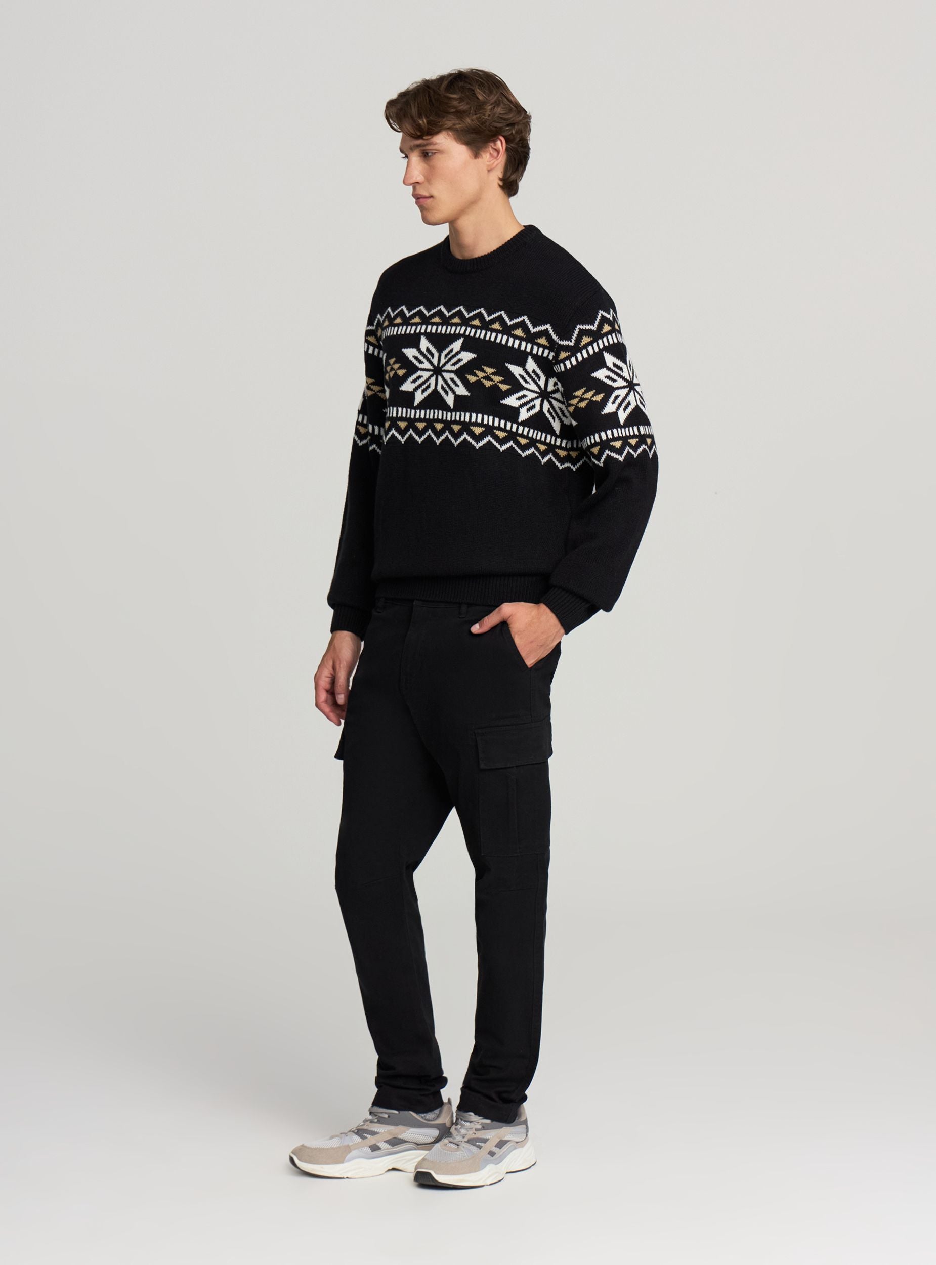 Muška majica sa dugim rukavima, okruglim izrezom i džakard radom. Idealna za slobodno vreme i dane u gradu, lako se kombinuje sa džinsom ili činom i čizmom. Donji deo i manžetne su rebrasti za udobno i uredno pristajanje. Džakard dezen koji se proteže preko grudi i rukava, savršen za ležerne kombinacije u hladnim sezonama.Detalji