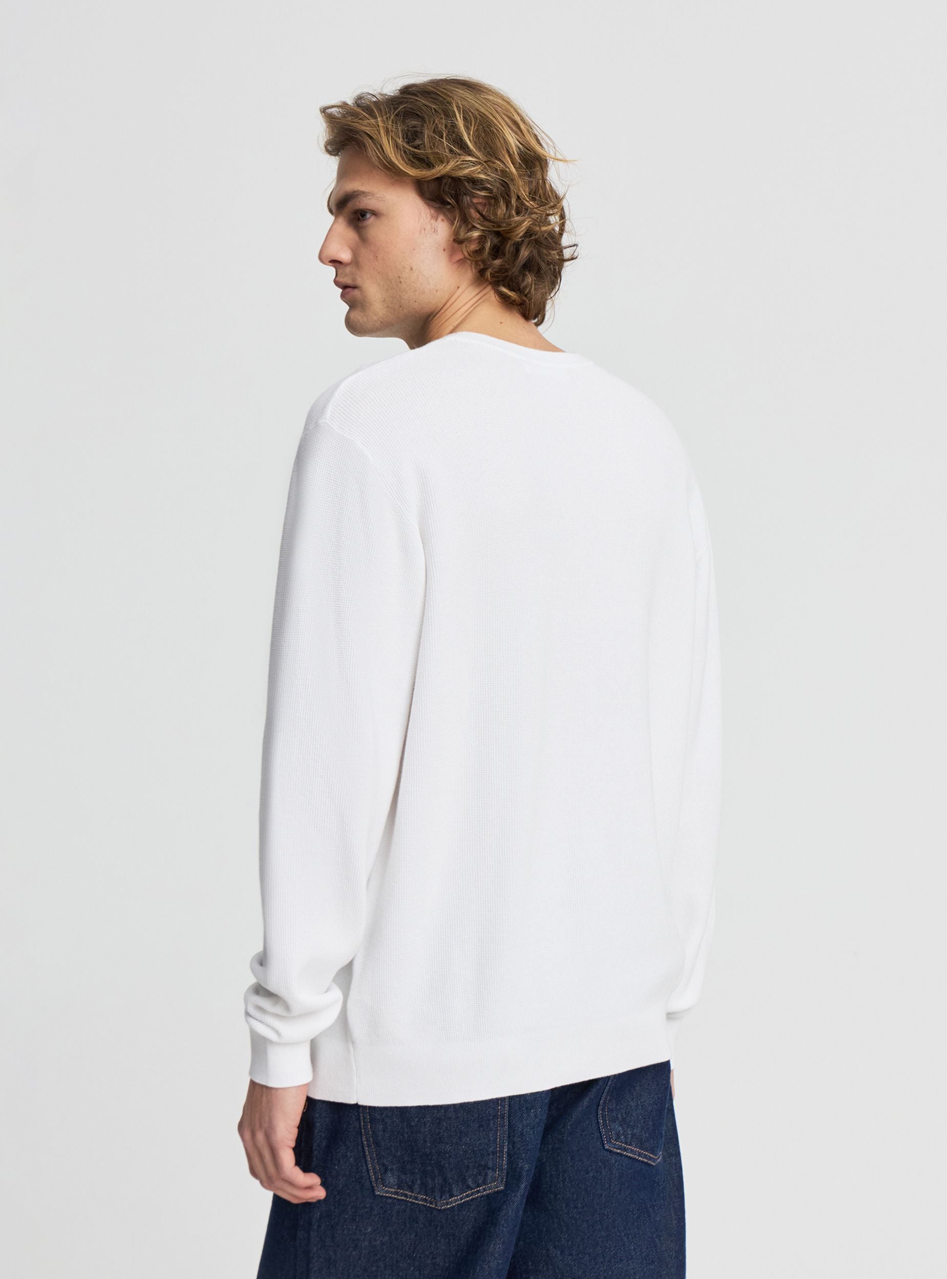 Muška majica sa okruglim izrezom u jednobojnoj varijanti, idealna za slobodno vreme i neformalni kancelarijski stil. Regular kroj sa dugim rukavima, rebrasti rubovi na izrezu, manžetnama i donjem delu za udobno pristajanje. Pletenje u "rižinom" uzorku dodaje teksturu koja se lako kombinuje sa farmerkama ili chino pantalonama i košuljom ispod. Višenamenski komad, savršen za slojevito oblačenje tokom prelaznih godišnjih doba ili hladnijih dana.Detalji