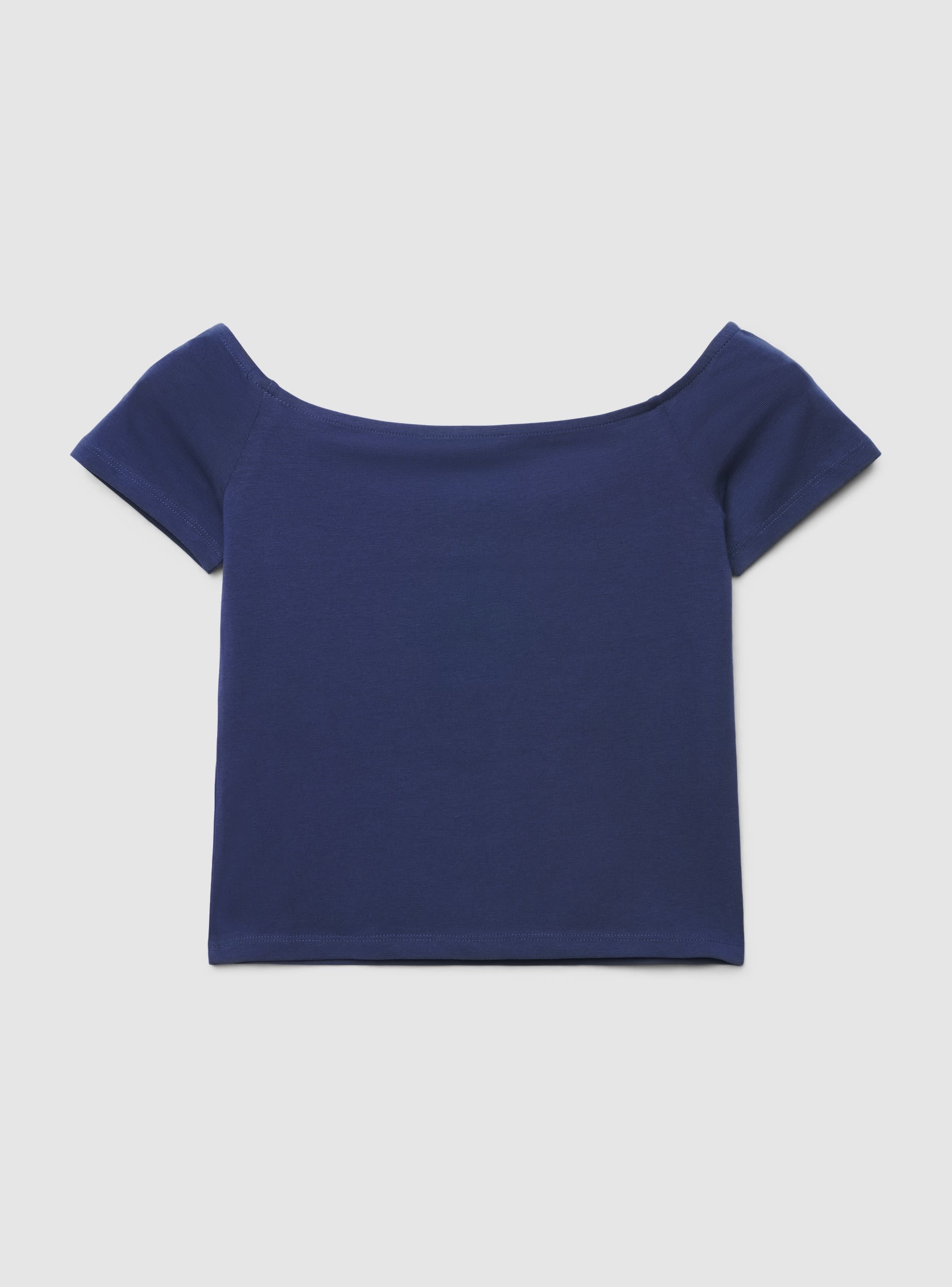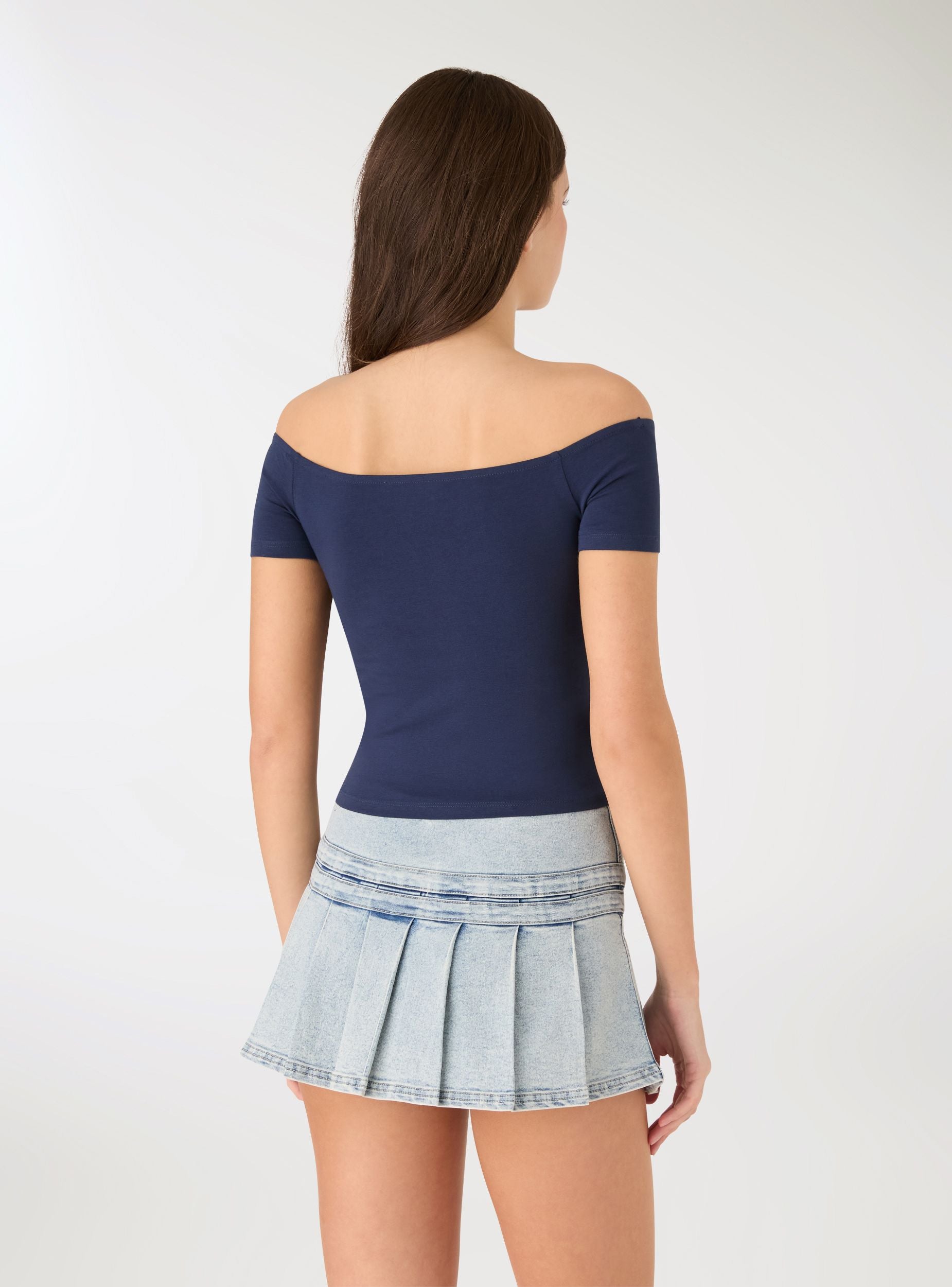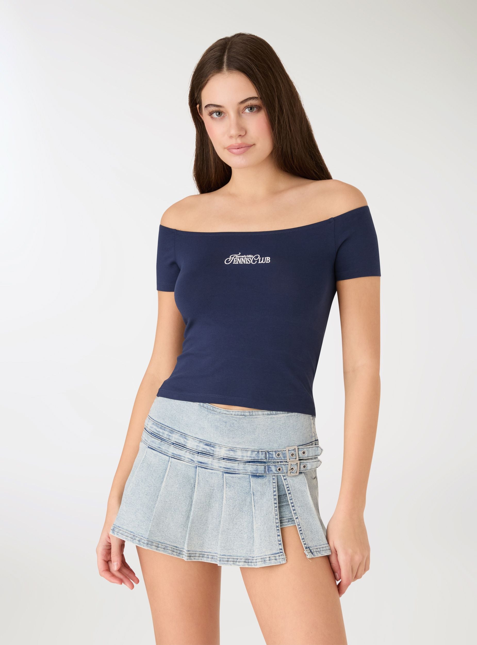 Ženska majica sa otvorenim ramenima i kratkim rukavima, savršena za urbane i ležerne kombinacije. Ima širok izrez u obliku čamca koji ističe dekolte i prednju vezenu dekoraciju u koledž stilu. Prilagođeni kroj prati linije tela, idealna uz farmerke sa visokim strukom ili midi suknje. Višenamenski model za nošenje u slobodno vreme ili za večernje izlaske sa otvorenom košuljom preko.Detalji