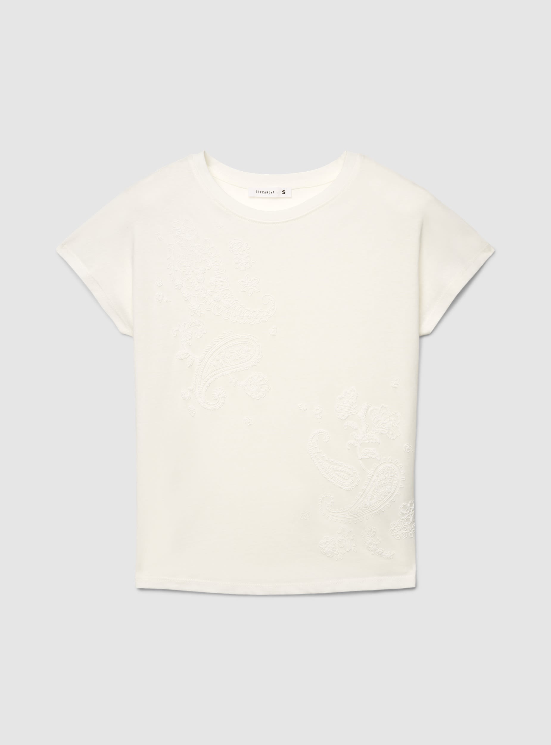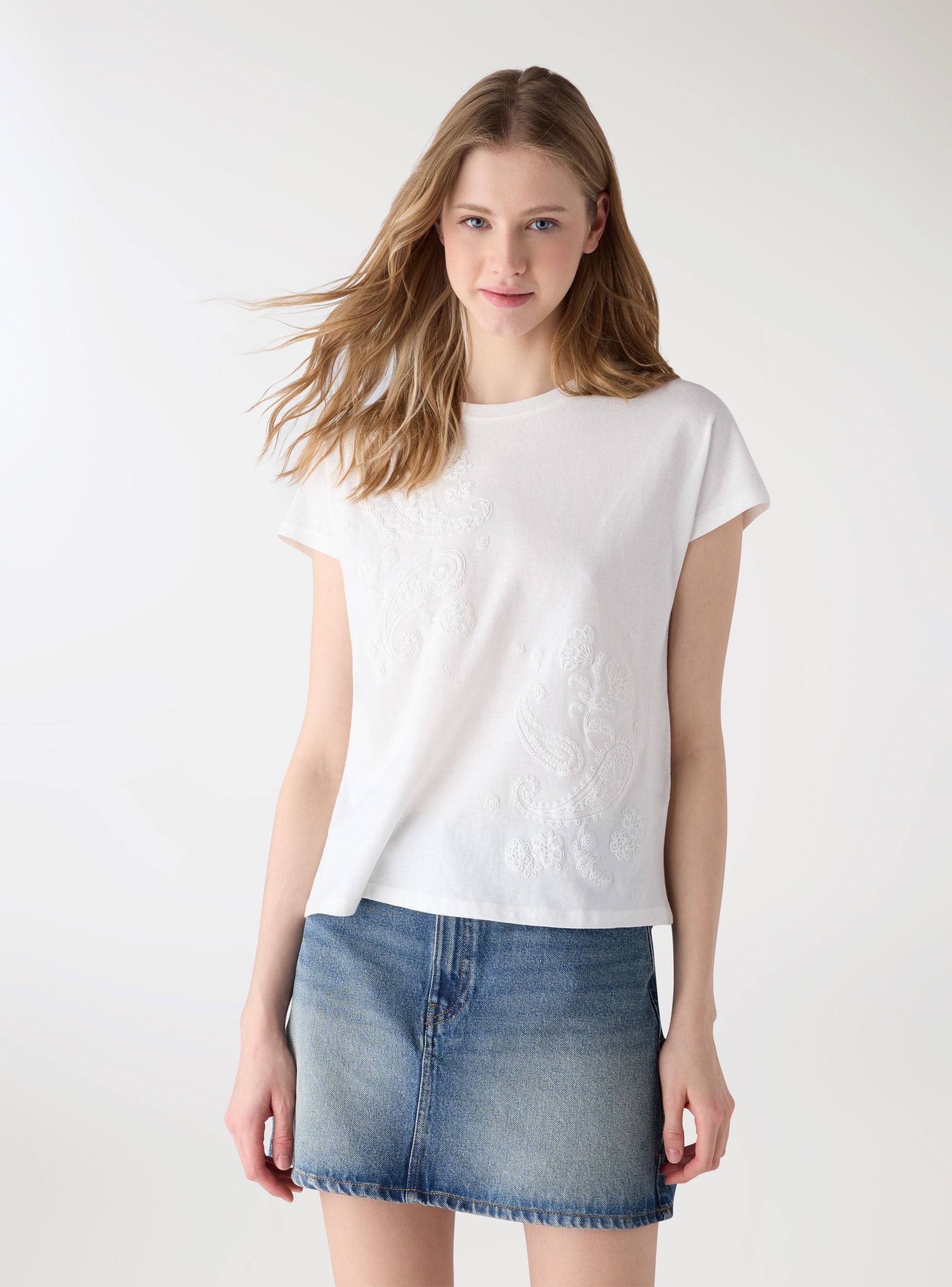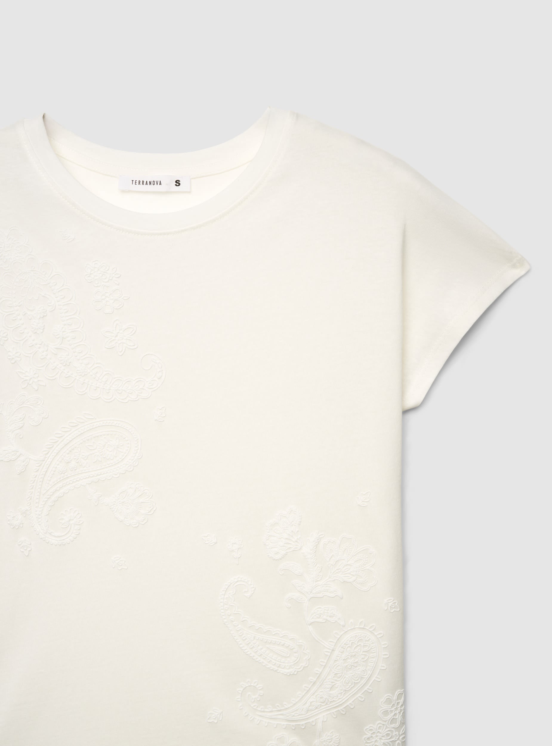 Ženska majica sa kratkim rukavima u kimono stilu i okruglim izrezom, dizajnirana za ležerne i casual prilike. Paisley dezen u ton-u-ton boji daje sofisticiran detalj, a pritom ne umanjuje svestranost. Lako se kombinuje sa farmerkama ili širokim pantalonama, udobna je za nošenje i ističe outfit čak i ispod laganih jakni.Detalji
