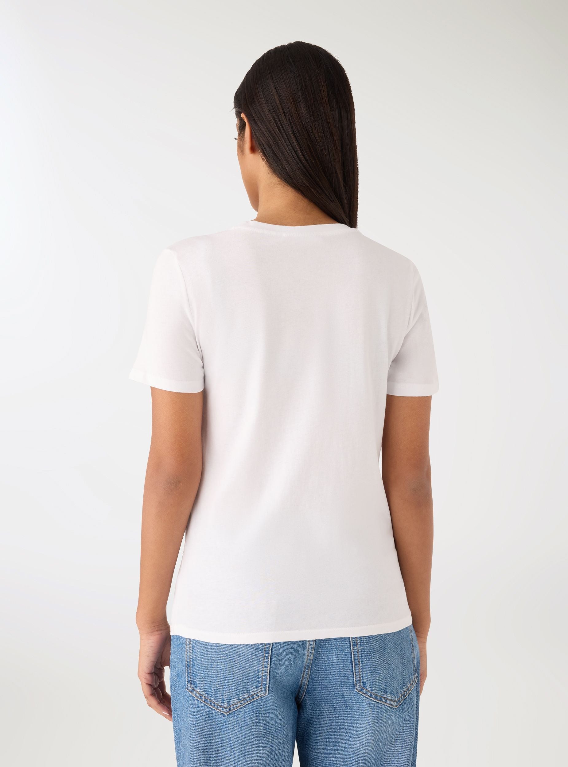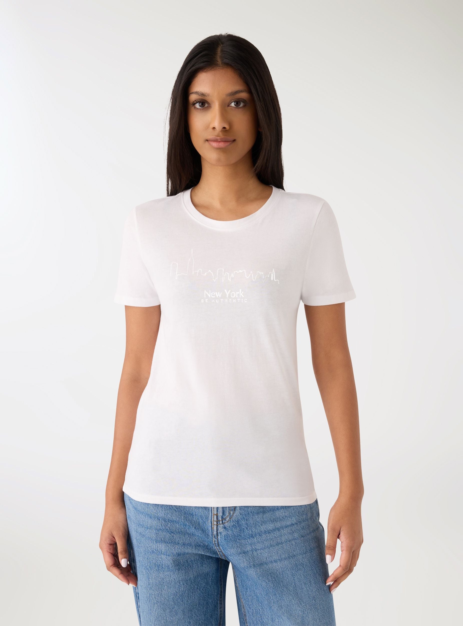 Ženska majica sa okruglim izrezom i kratkim rukavima, ukrašena printom panorame Njujorka sa sjajnim efektom i natpisom „Be Authentic“. Regular kroj za ležeran dnevni izgled, lako se kombinuje sa farmerkama, šortsevima ili bermudama i patikama. Idealna za kompletiranje urbanih i opuštenih odevnih kombinacija, sa jednobojnim završetkom na leđima i čistim dizajnom sprijeda.Detalji