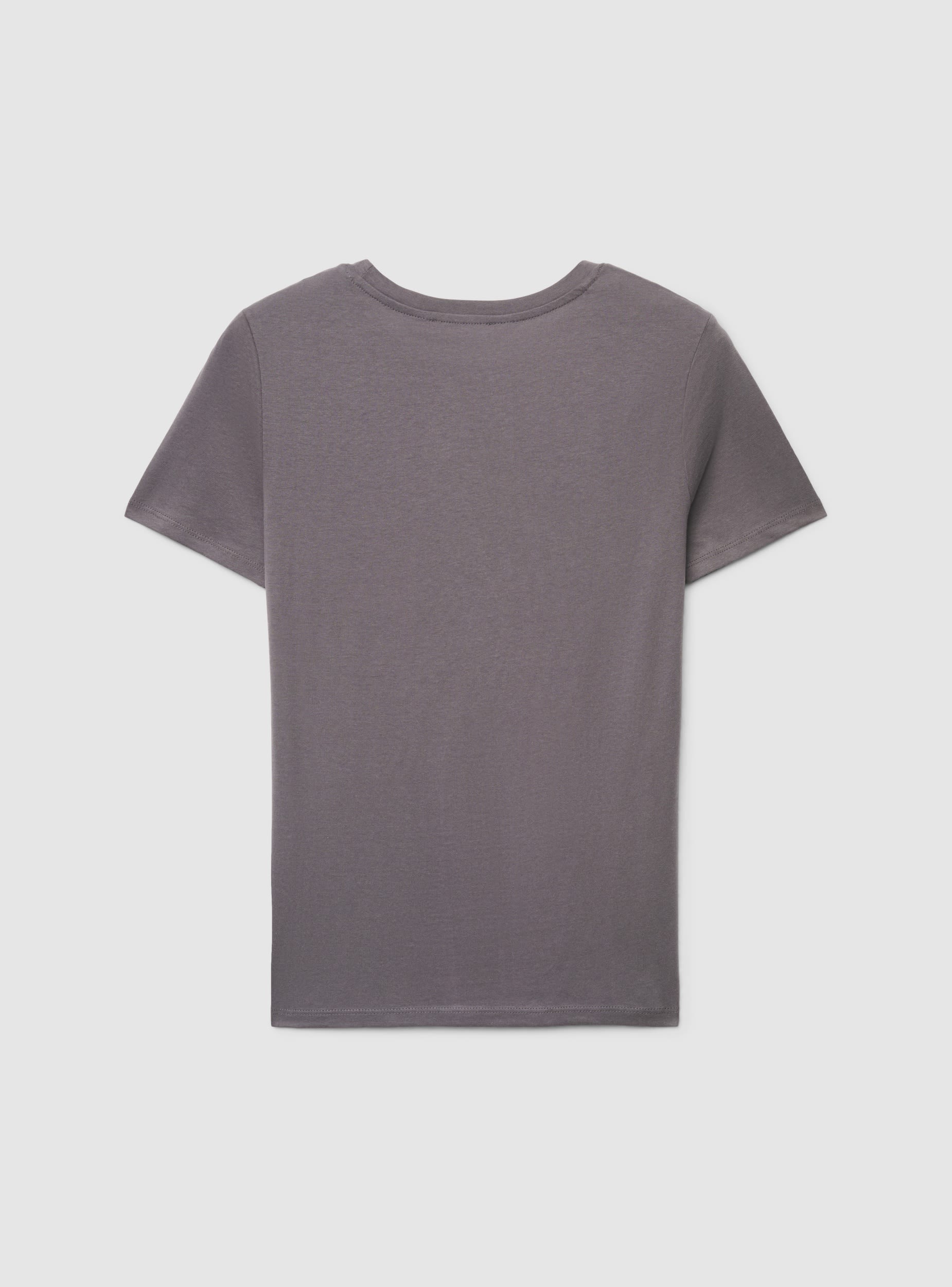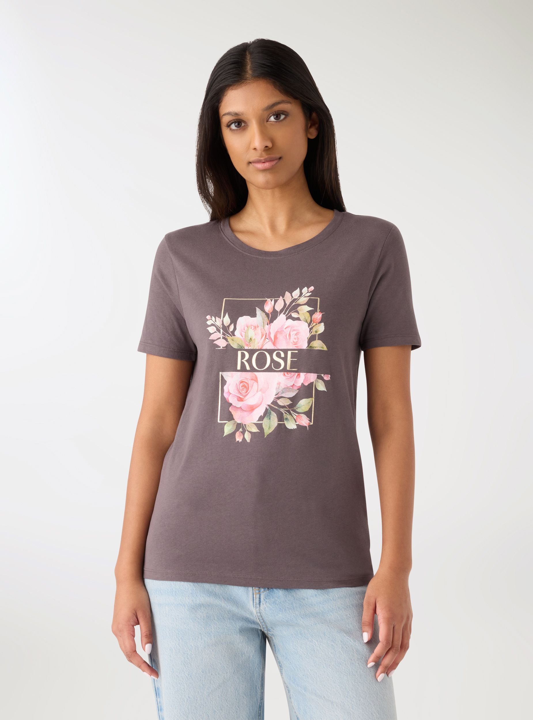 Ženska majica sa okruglim izrezom i kratkim rukavima, ukrašena na prednjoj strani cvetnim printom sa natpisom u svetlucavom efektu. Regularnog je kroja, idealna za ležerne kombinacije sa farmerkama ili suknjama, i savršena ispod kardigana ili laganih jakni. Pogodna za svakodnevnu upotrebu. Dizajn sa cvetnim printom koji dodaje romantičan detalj tvojim odevnim kombinacijama.Detalji