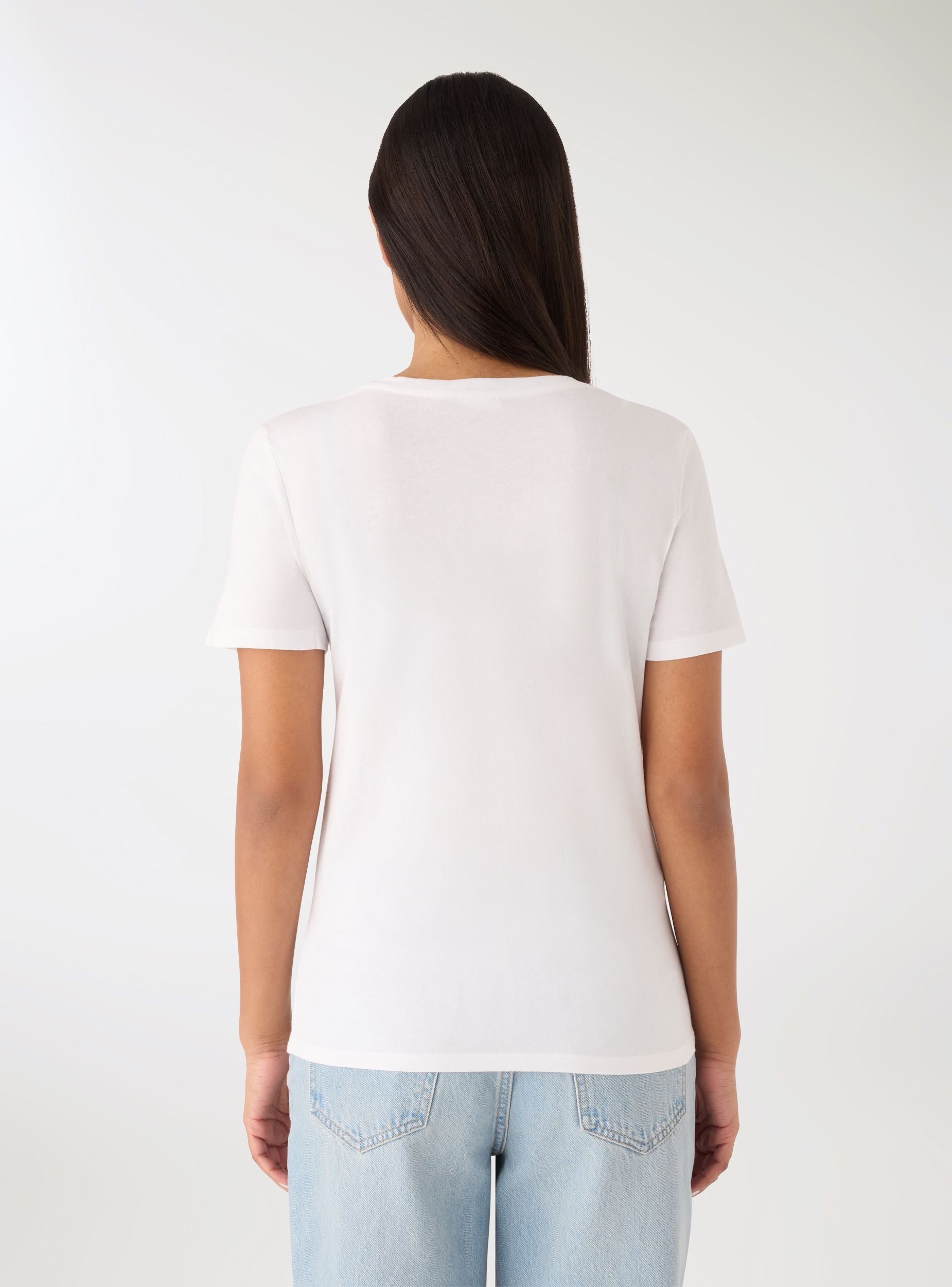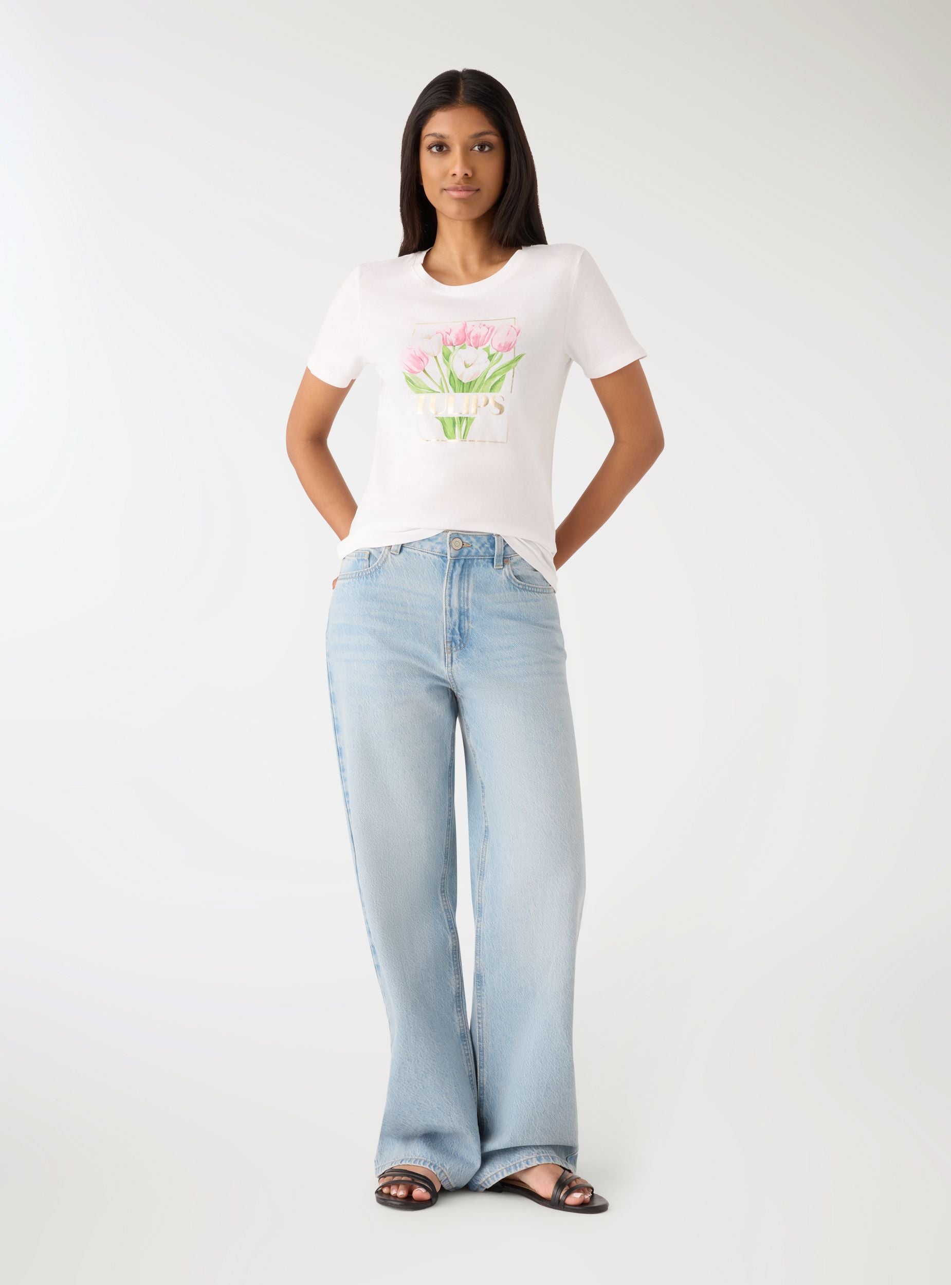 Ženska majica sa okruglim izrezom i kratkim rukavima, ukrašena cvetnim printom na prednjoj strani sa natpisom u sjajnom efektu. Regularan kroj, idealna za ležerne kombinacije sa farmerkama ili suknjama, i savršena ispod kardigana ili laganih jakni. Pogodna za svakodnevnu upotrebu. Dizajn sa cvetnim printom koji dodaje romantični dodir tvojim outfitima.Detalji