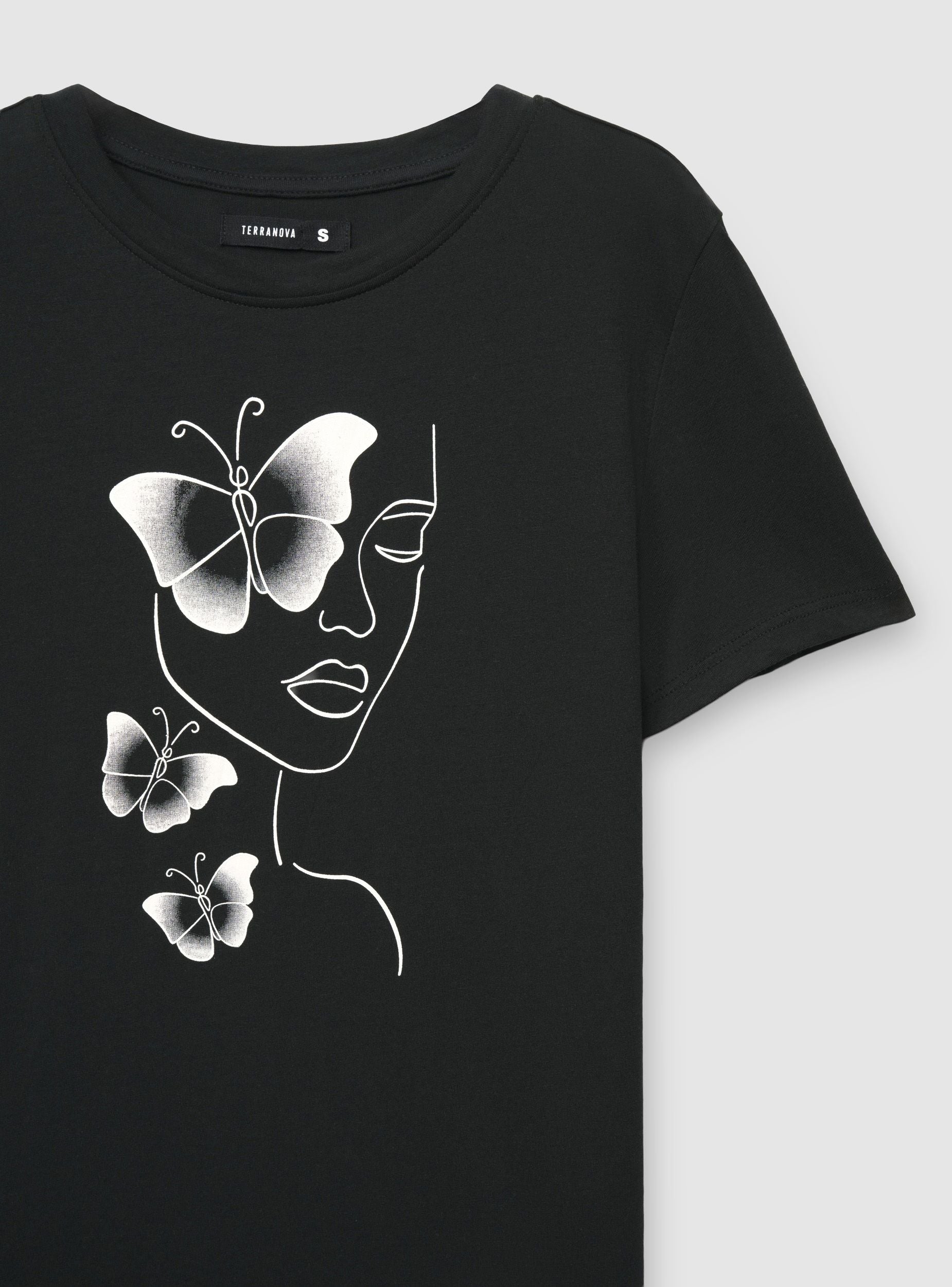 Ženska majica sa printom lica na prednjoj strani, ukrašenog romantičnim detaljima u stilu line art. Model sa kratkim rukavima, okruglim izrezom i regularnim krojem, lako se kombinuje sa farmerkama, suknjama ili šortsevima za ležeran i moderan izgled. Savršena za slobodno vreme i svakodnevne izlaske, dodaje romantični šarm tvom outfitu.Detalji