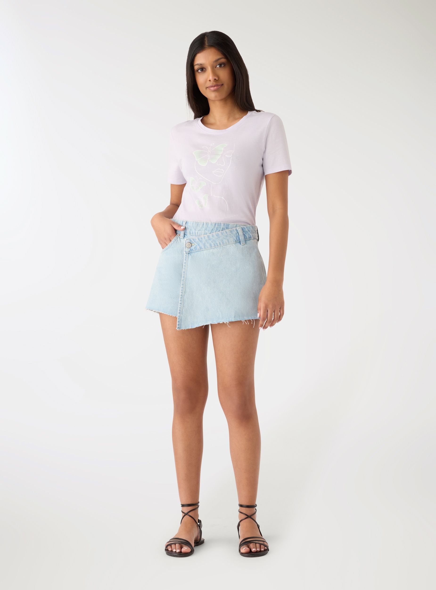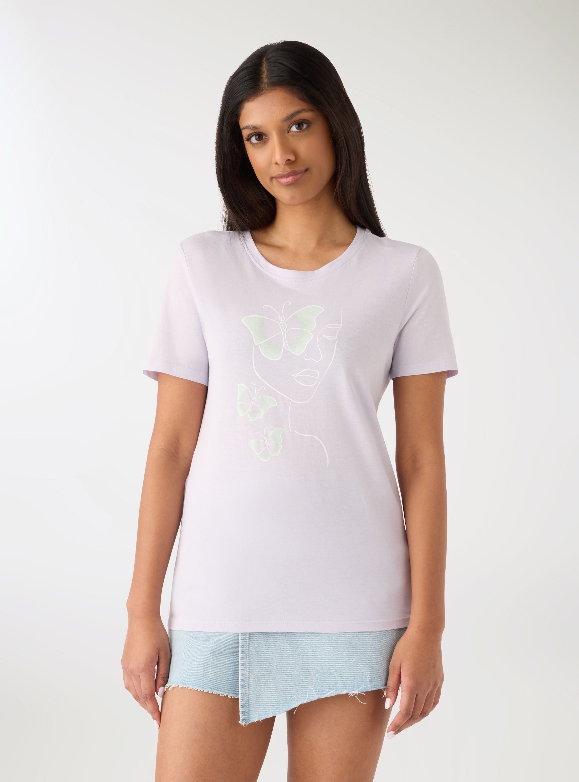 Ženska majica sa printom lica na prednjoj strani, ukrašenog romantičnim detaljima u stilu line art. Model sa kratkim rukavima, okruglim izrezom i regularnim krojem, lako se kombinuje sa farmerkama, suknjama ili šortsevima za ležeran i moderan izgled. Savršena za slobodno vreme i svakodnevne izlaske, dodaje romantičan dodir tvom outfitu.Detalji