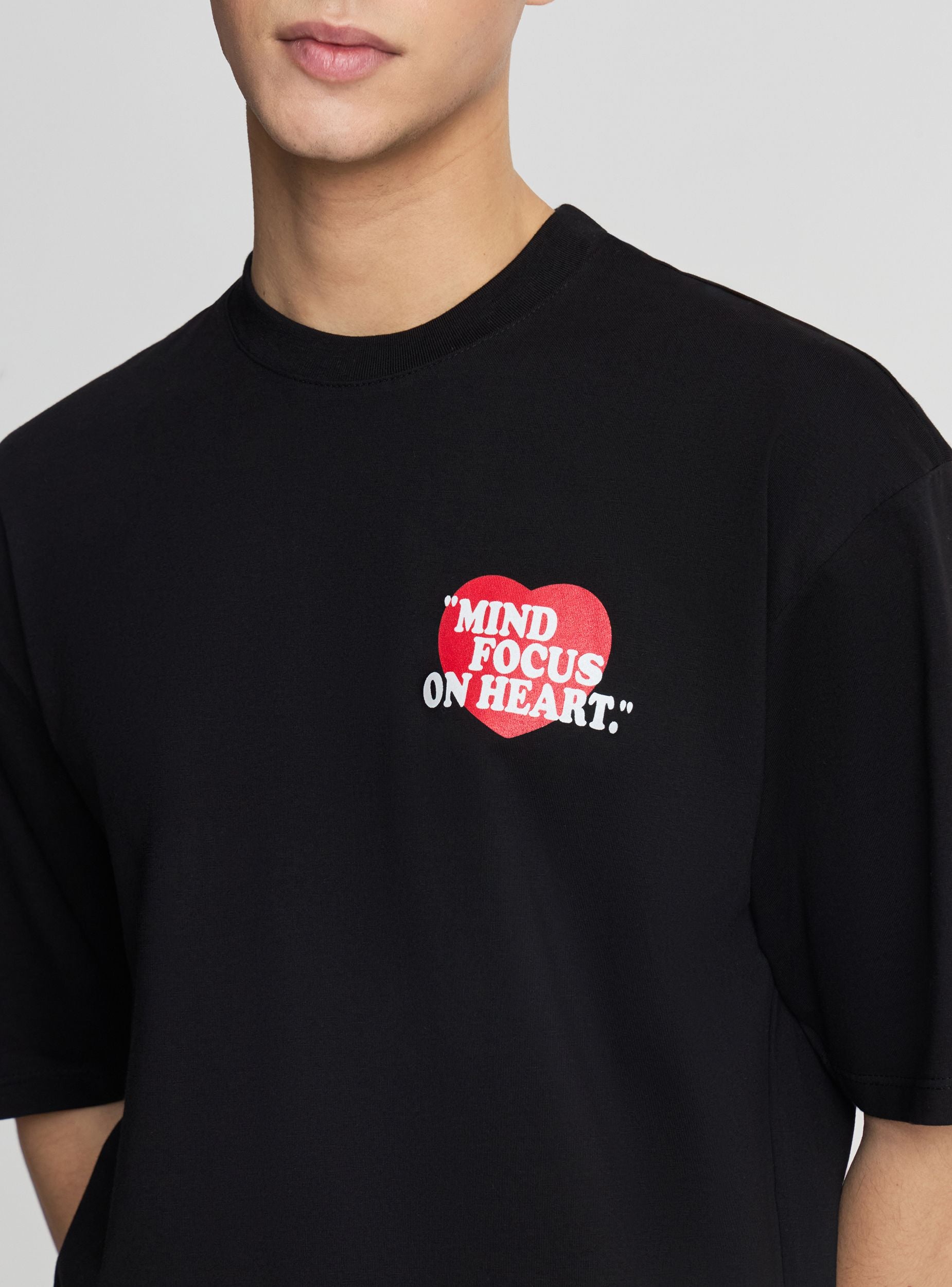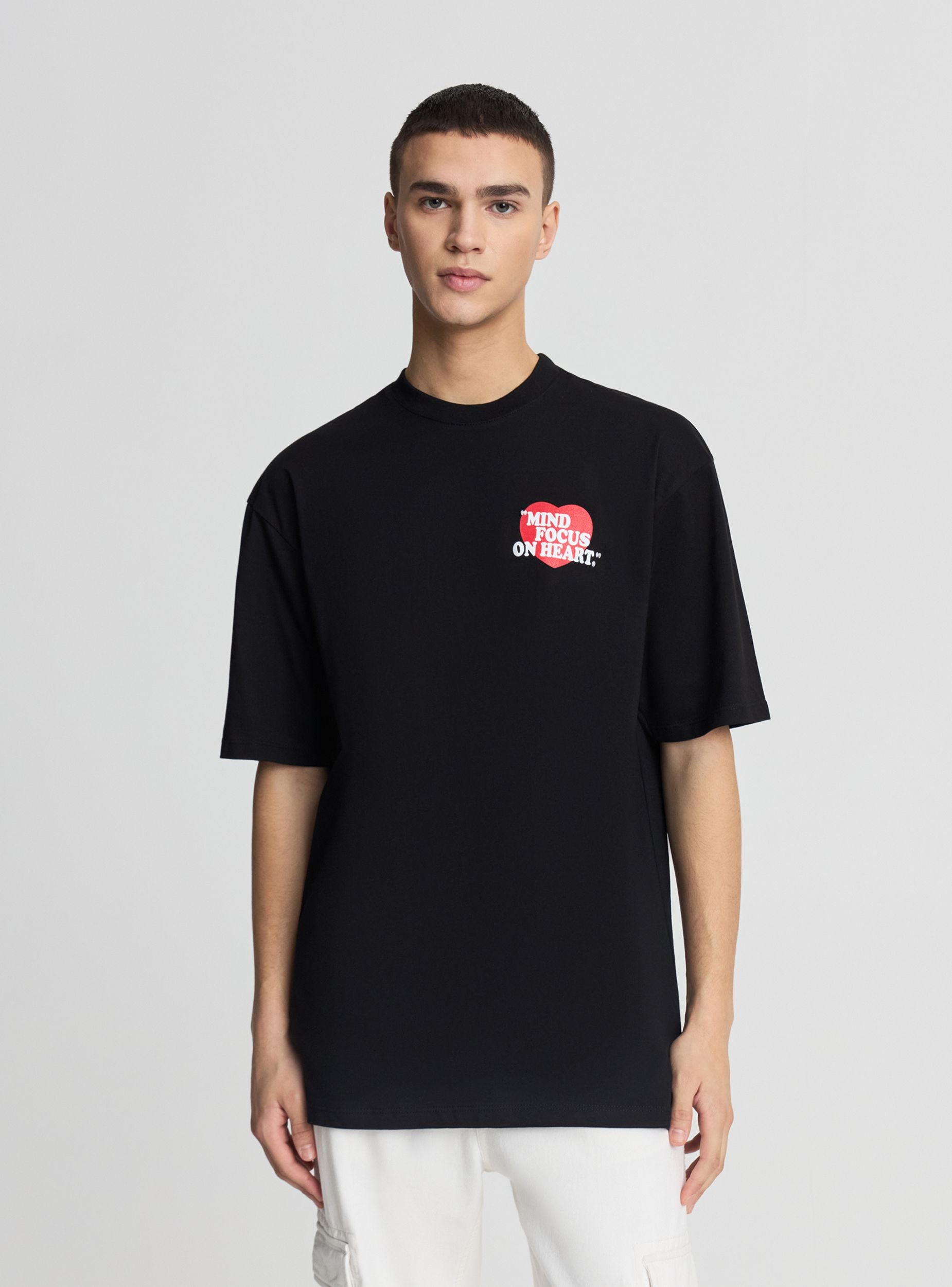 Muška jednobojna majica sa štampom srca i natpisom na grudima i leđima, idealna za ležeran izgled. Model sa kratkim rukavima, okruglim izrezom i regularnim krojem, lako se kombinuje sa farmerkama ili cargo pantalonama. Diskretna grafika sprijeda i velika na leđima dodaju karakter svakodnevnom izgledu, savršena za slobodno vreme i za kompletiranje urbanih outfita sa patikama i laganom duksericom.Detalji