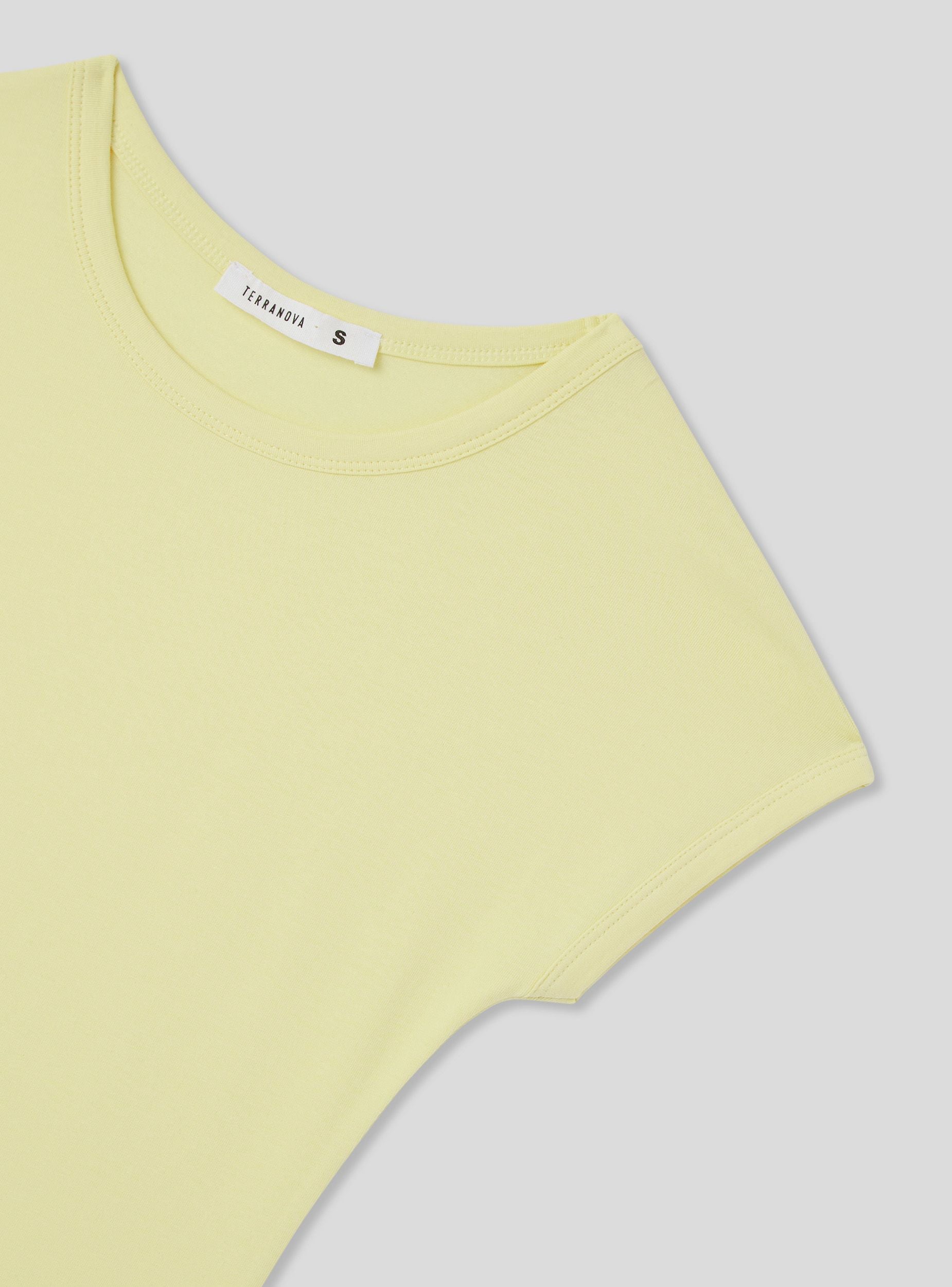 Maglietta da donna dal design semplice e versatile, caratterizzata da una tinta unita che la rende facilmente abbinabile con diversi capi e accessori. Le maniche ad aletta aggiungono un tocco di femminilità e leggerezza al capo, offrendo un comfort ideale per la stagione estiva. Il taglio dritto e minimalista rende questa maglietta perfetta sia per un look casual che per essere indossata sotto un blazer o una giacca, mantenendo uno stile essenziale ma curato.Detalji