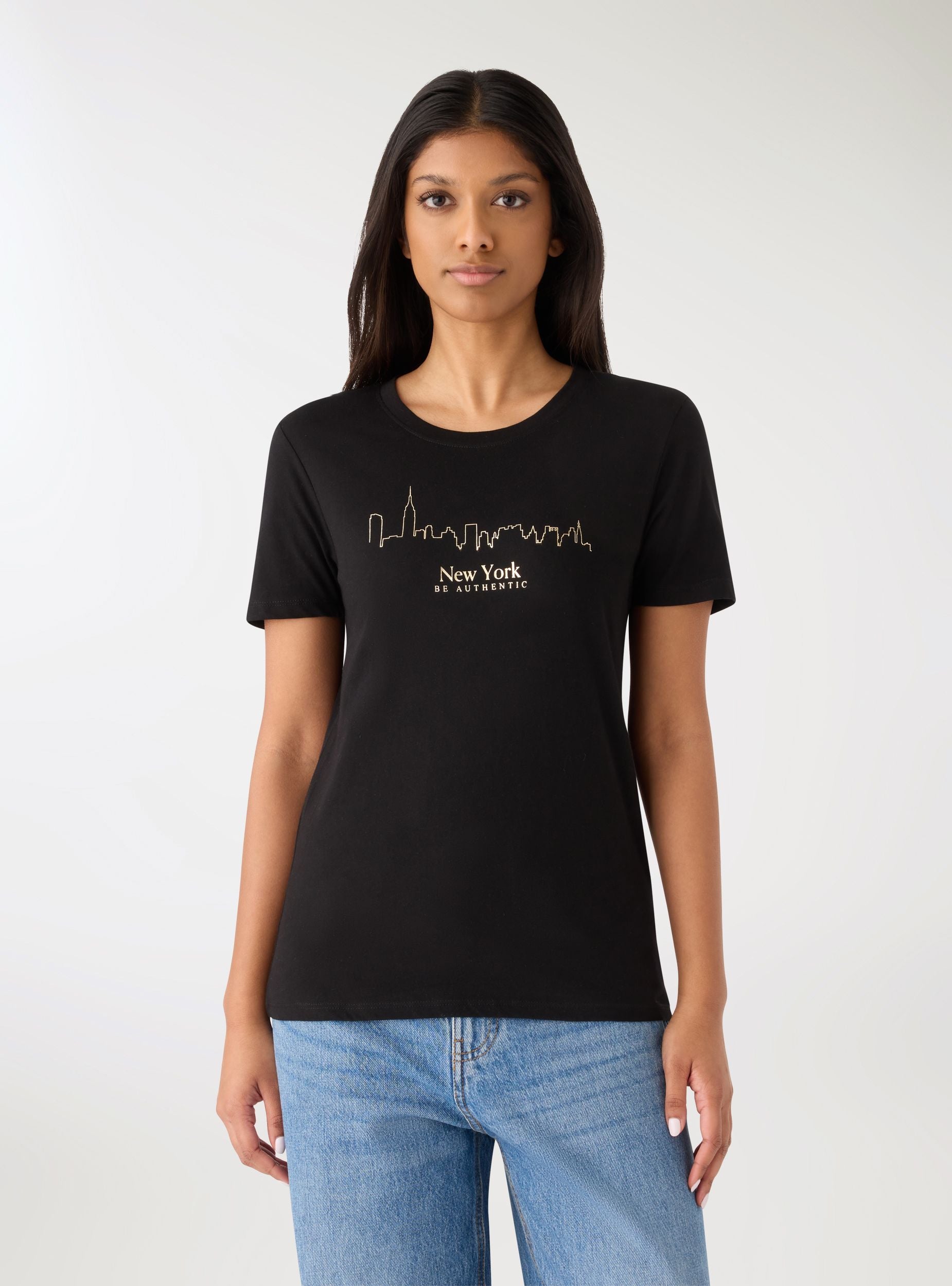 Ženska majica sa okruglim izrezom i kratkim rukavima, ukrašena printom siluete Njujorka sa sjajnim efektom i natpisom „Be Authentic“. Regular kroj za ležeran dnevni izgled, lako se kombinuje sa farmerkama, kratkim farmerkama ili šortsevima i patikama. Idealna za kompletiranje urbanih i opuštenih odevnih kombinacija, sa jednobojnim završetkom na leđima i čistim dizajnom sprijeda.Detalji