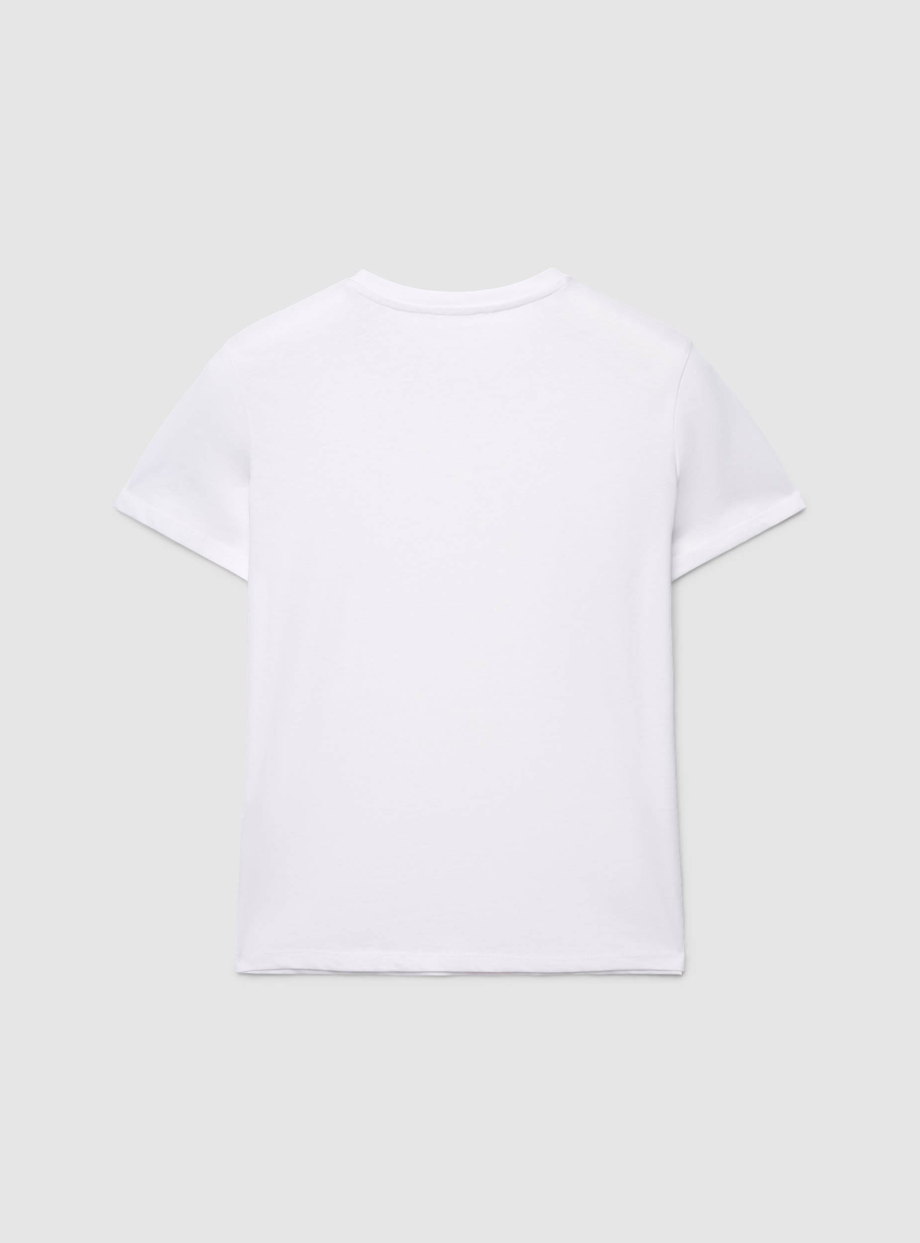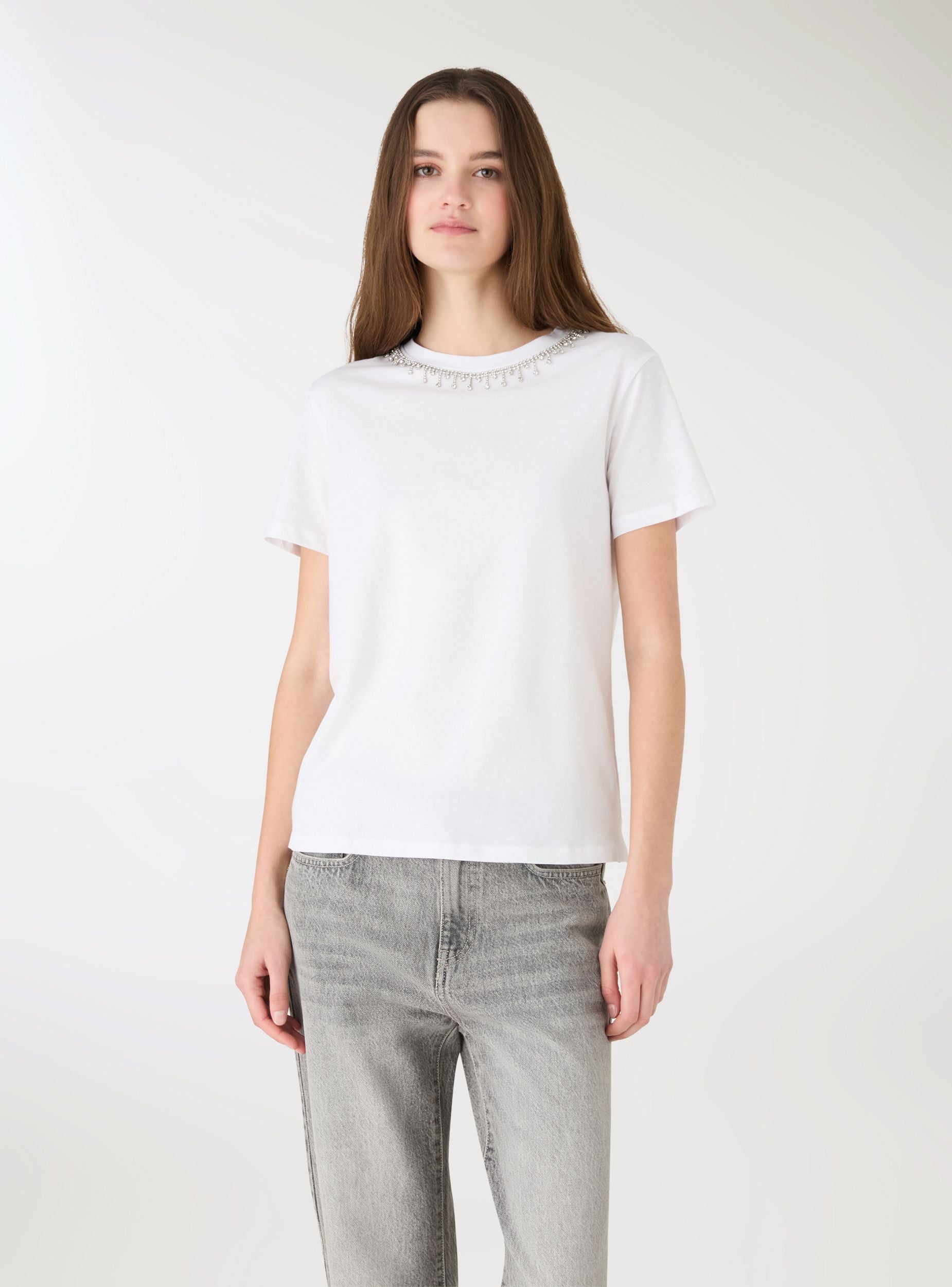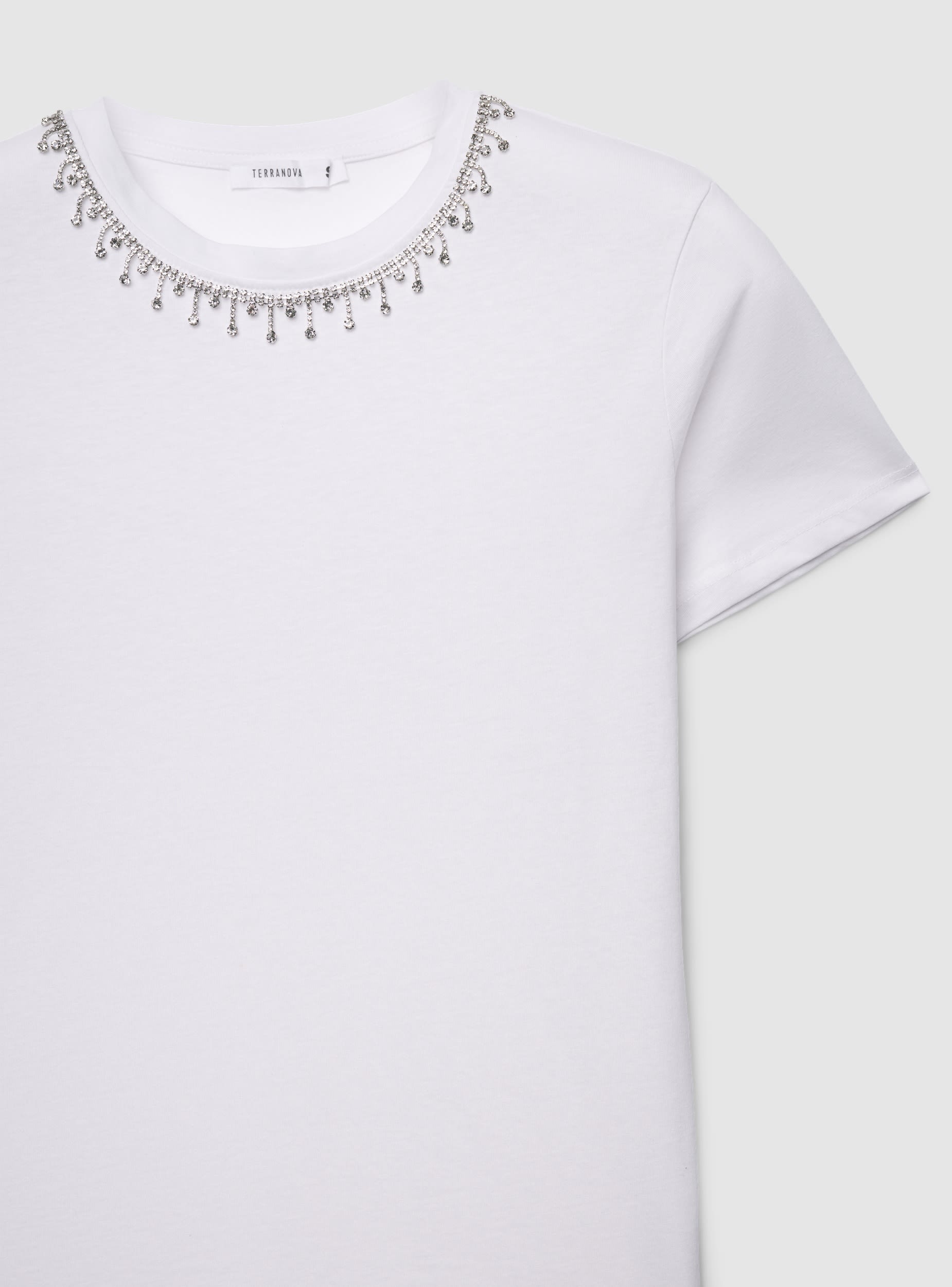 Ženska majica sa okruglim izrezom i kratkim rukavima, ukrašena aplikacijama u obliku nakita oko vrata koje daju sjajni efekat. Savršena za podizanje svakodnevnih kombinacija sa farmerkama ili suknjama, lako se nosi zahvaljujući regularnom kroju i čistoj liniji. Jednobojni dizajn čini je svestranom, dok svetlucavi detalj dodaje karakter i odevnim kombinacijama za večernje izlaske ili posebne prilike.Detalji