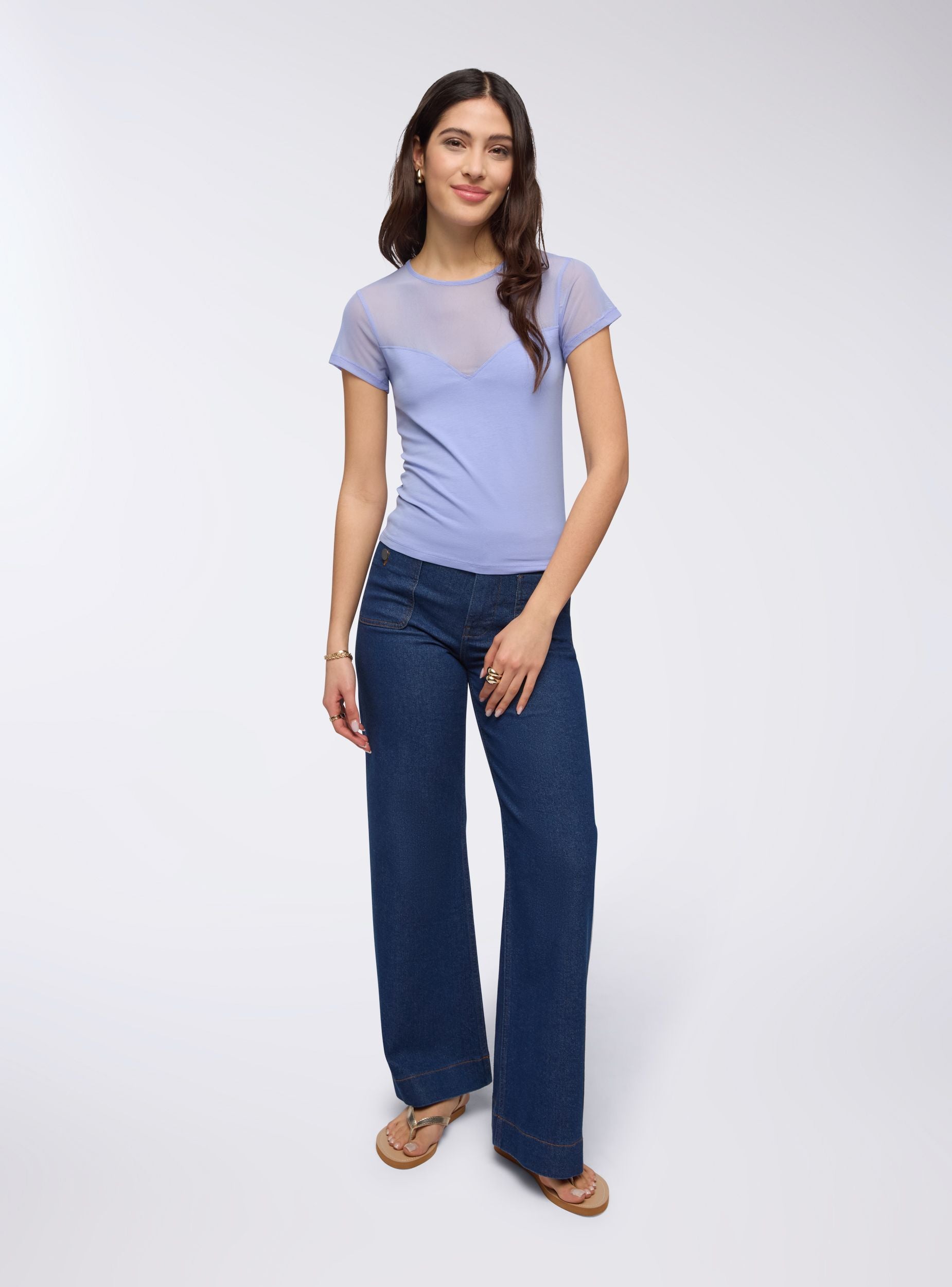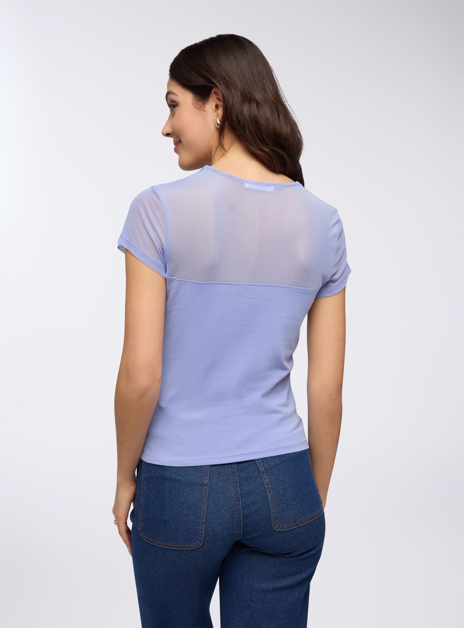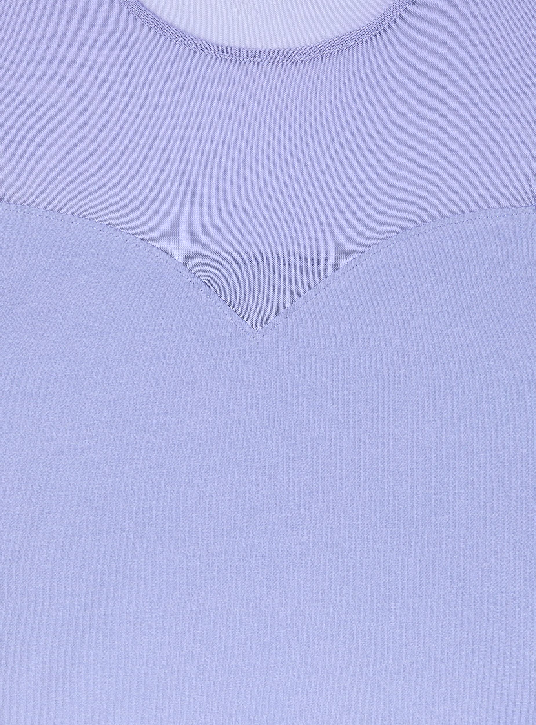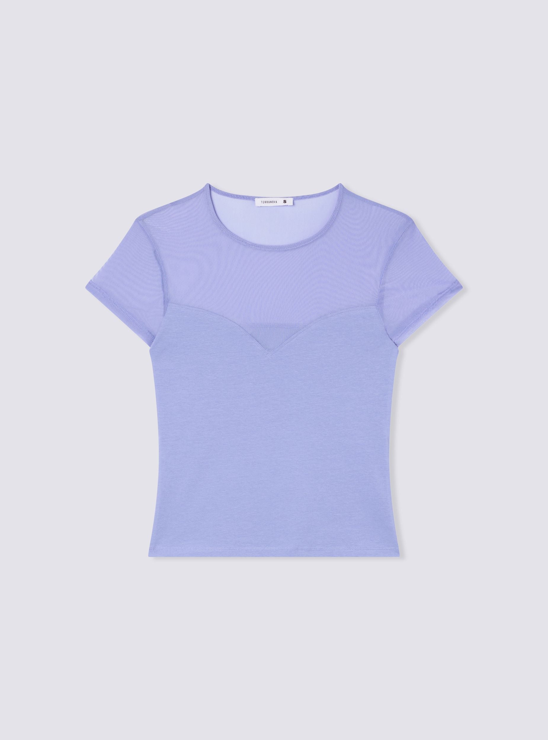 Maglietta da donna a tinta unita con girocollo e maniche corte. La parte superiore della maglietta, inclusa l'area delle spalle e delle maniche, presenta un elegante inserto in tulle trasparente che dona un tocco raffinato e moderno al capo. La parte inferiore è aderente e sagomata, creando un contrasto con l'inserto in tulle, che aggiunge femminilità e leggerezza al design.Detalji