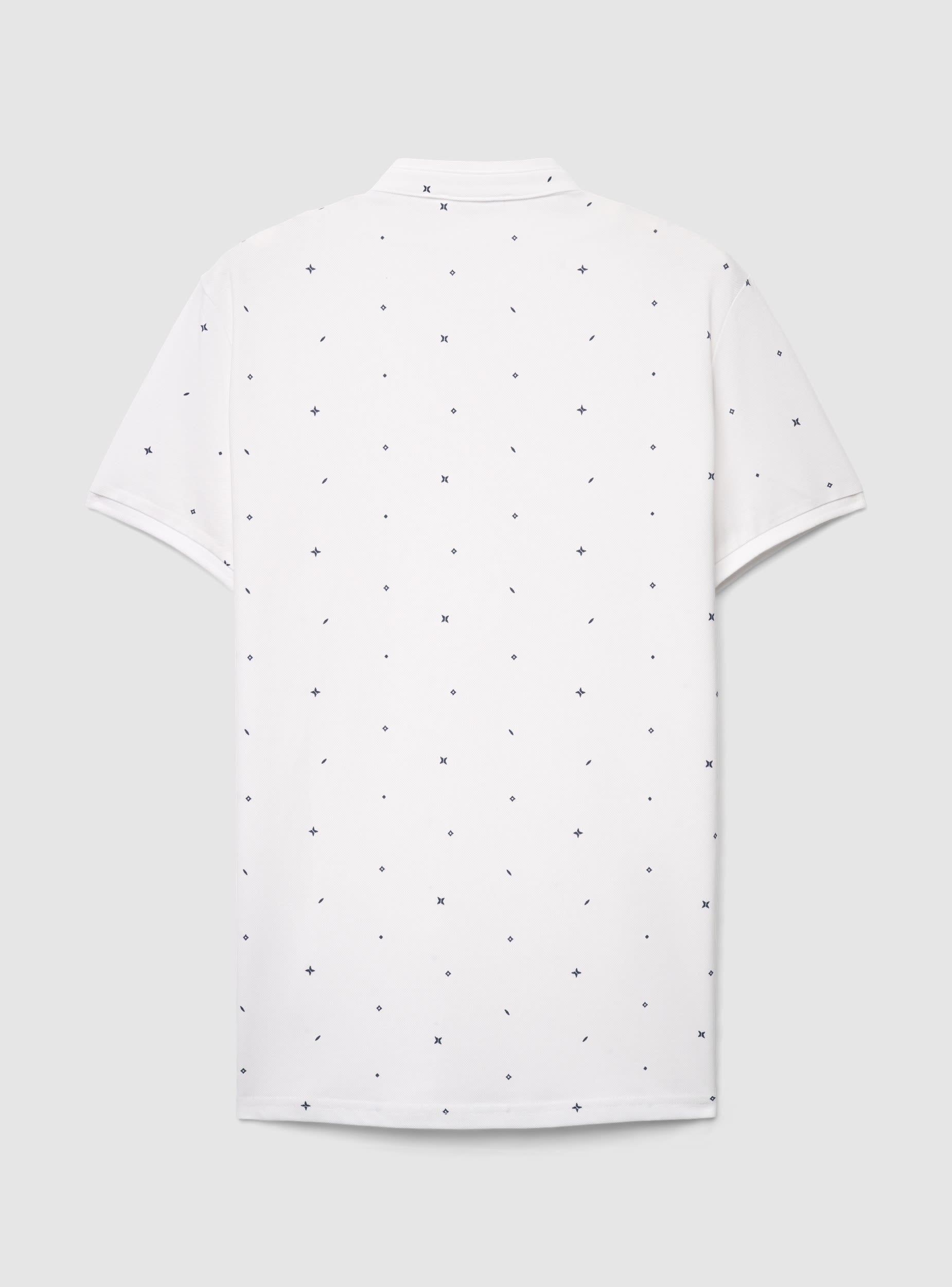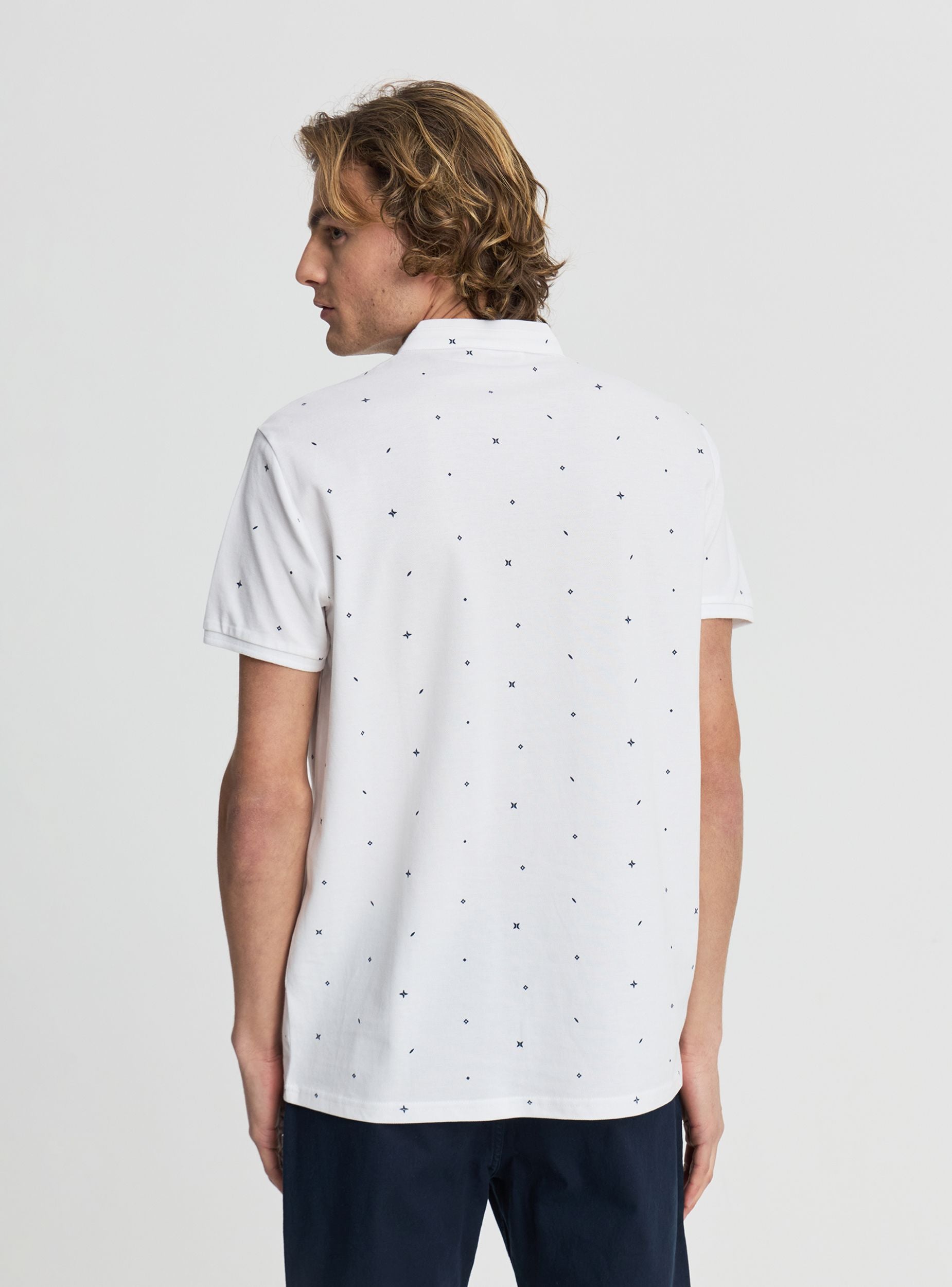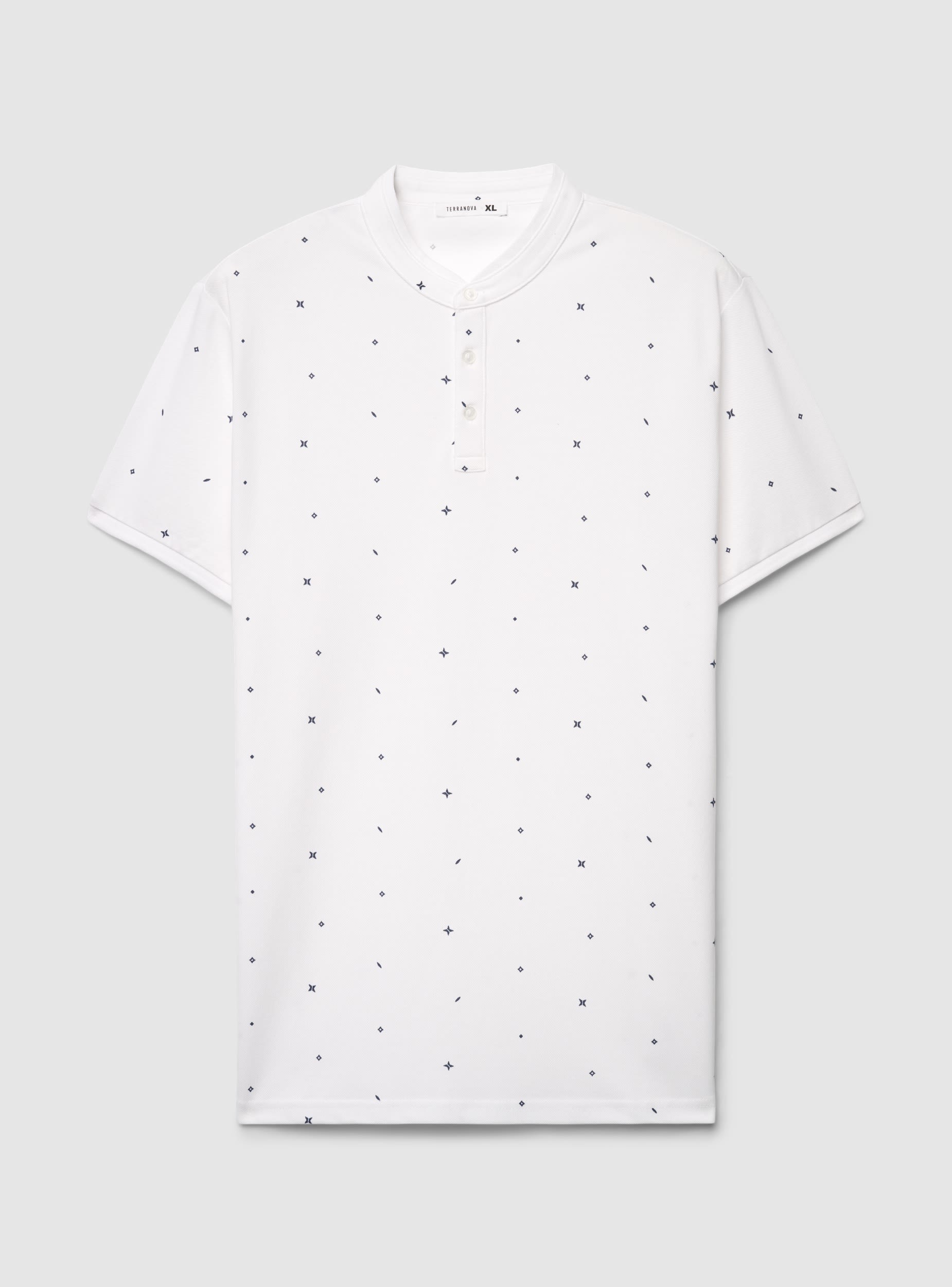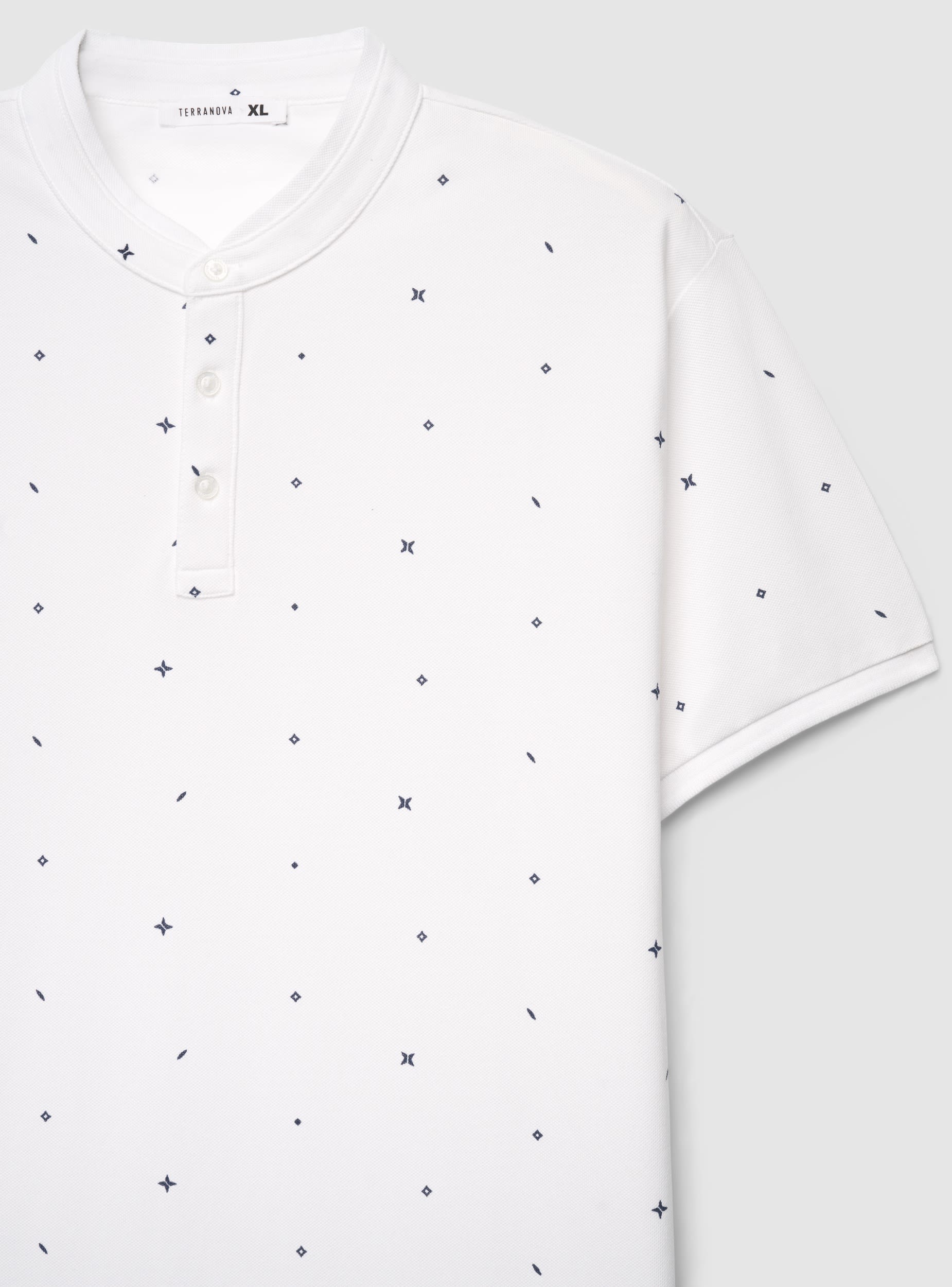 Muška majica kratkih rukava sa serafim okovratnikom i tri dugmeta. Dizajn sa sitnim dezenom po celoj površini koji dodaje grafički detalj i lako se kombinuje sa farmerkama ili bermudama za slobodno vreme. Čiste linije i regularan kroj, ravni rub i obrađeni rukavi. Idealna za casual urban izgled, savršena ispod lagane jakne ili uz patike za svakodnevne izlaske.Detalji