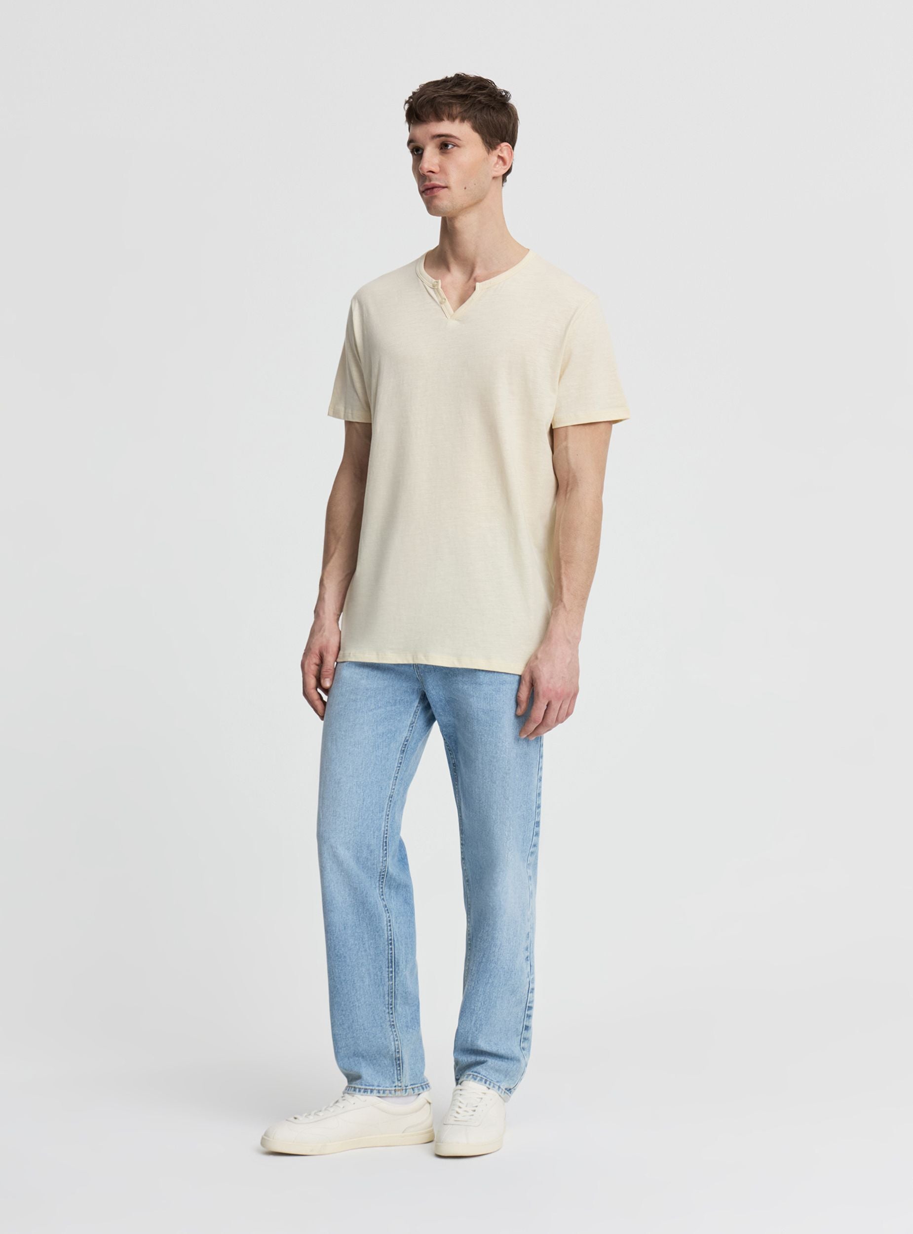 Muška majica sa kratkim rukavima, serafim izrezom sa dva dugmeta i efektnom teksturom u jednobojnoj varijanti. Idealna za slobodno vreme i ležeran izgled, lako se kombinuje sa farmerkama ili chino pantalonama i patikama. Regular kroj sa ravnim donjim delom, otvoreni serafim kragnom sa kratkom patkom i malim dugmadima. Svestran komad za svaki dan, savršen i ispod lagane košulje ili duksa.Detalji