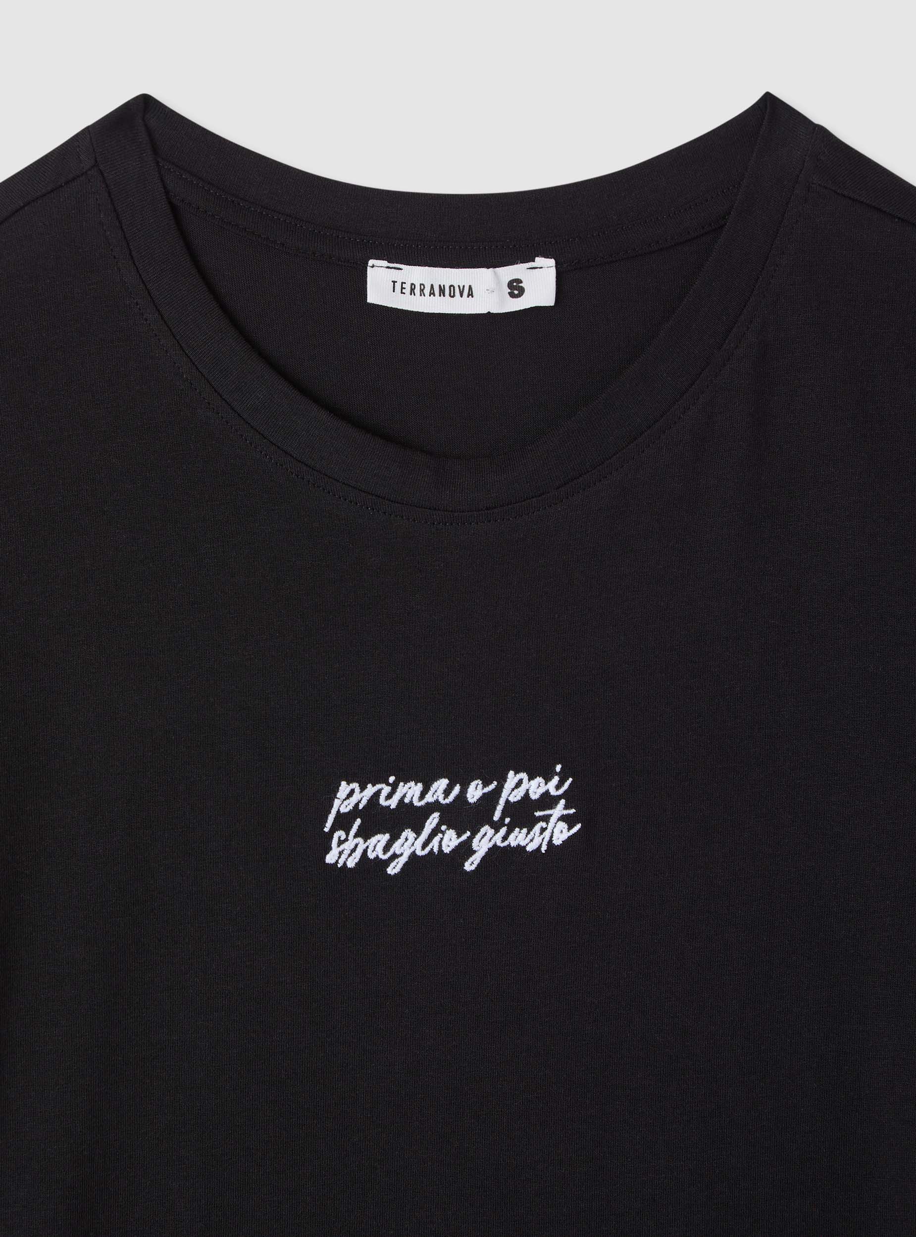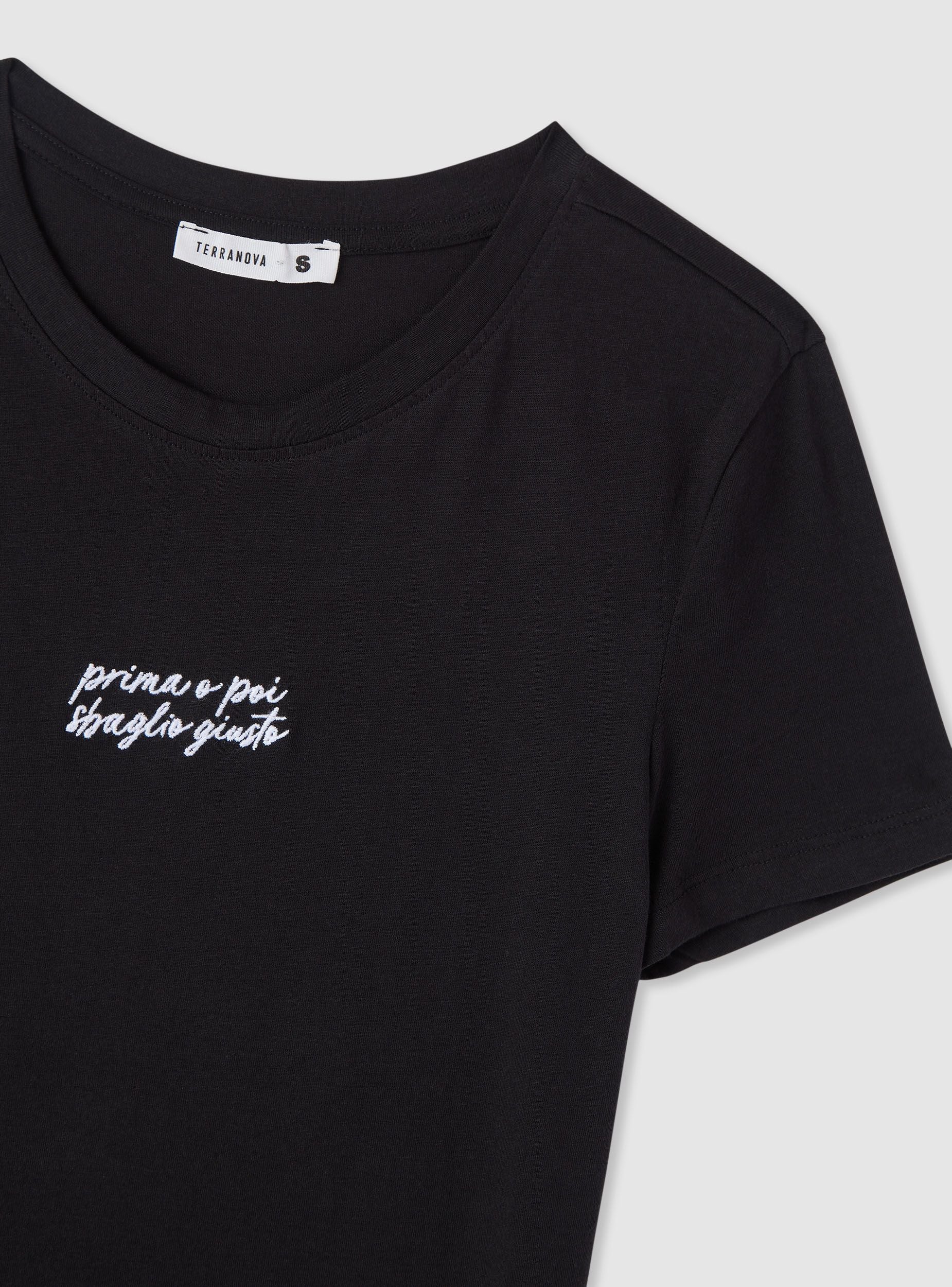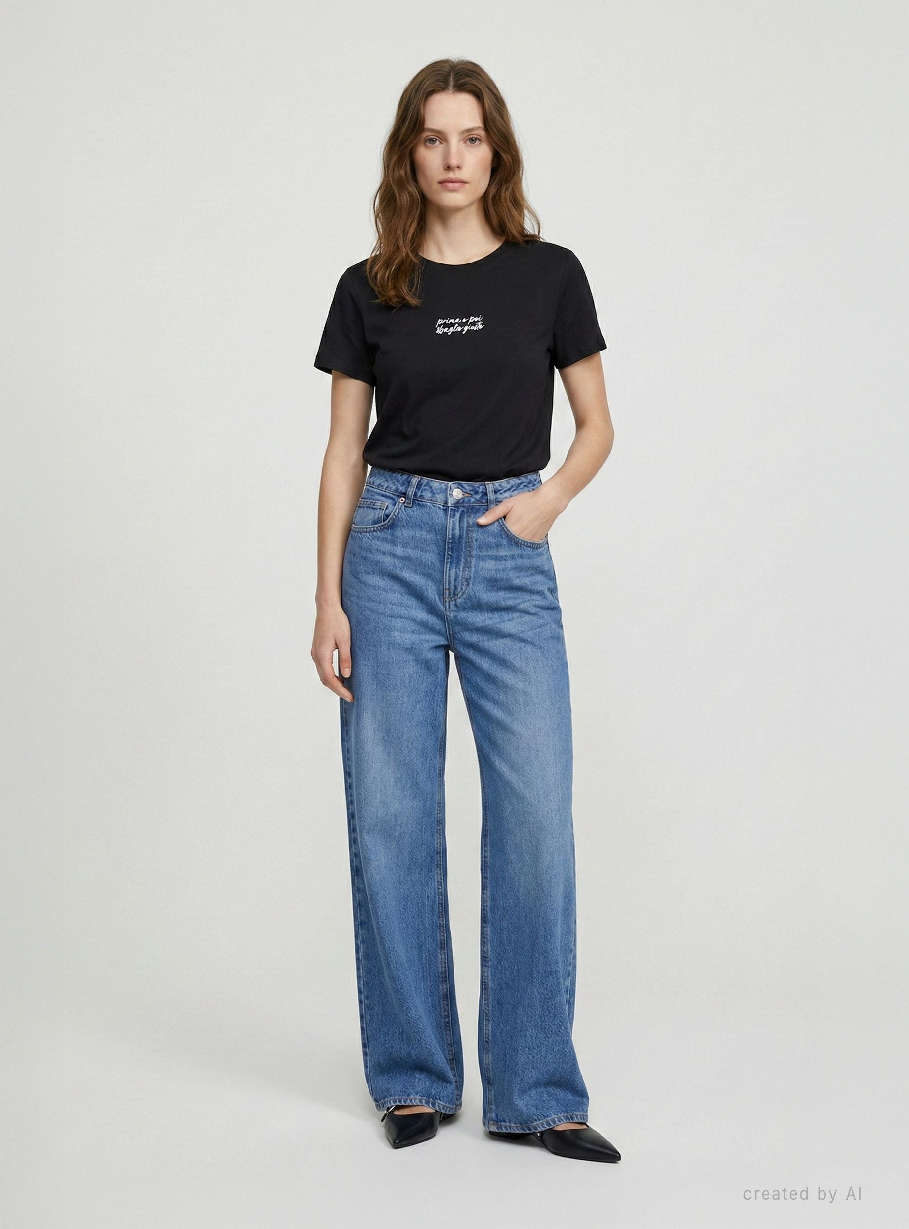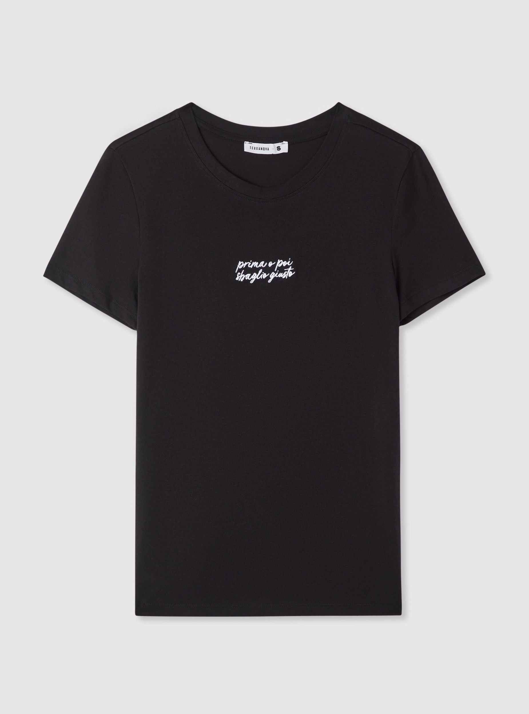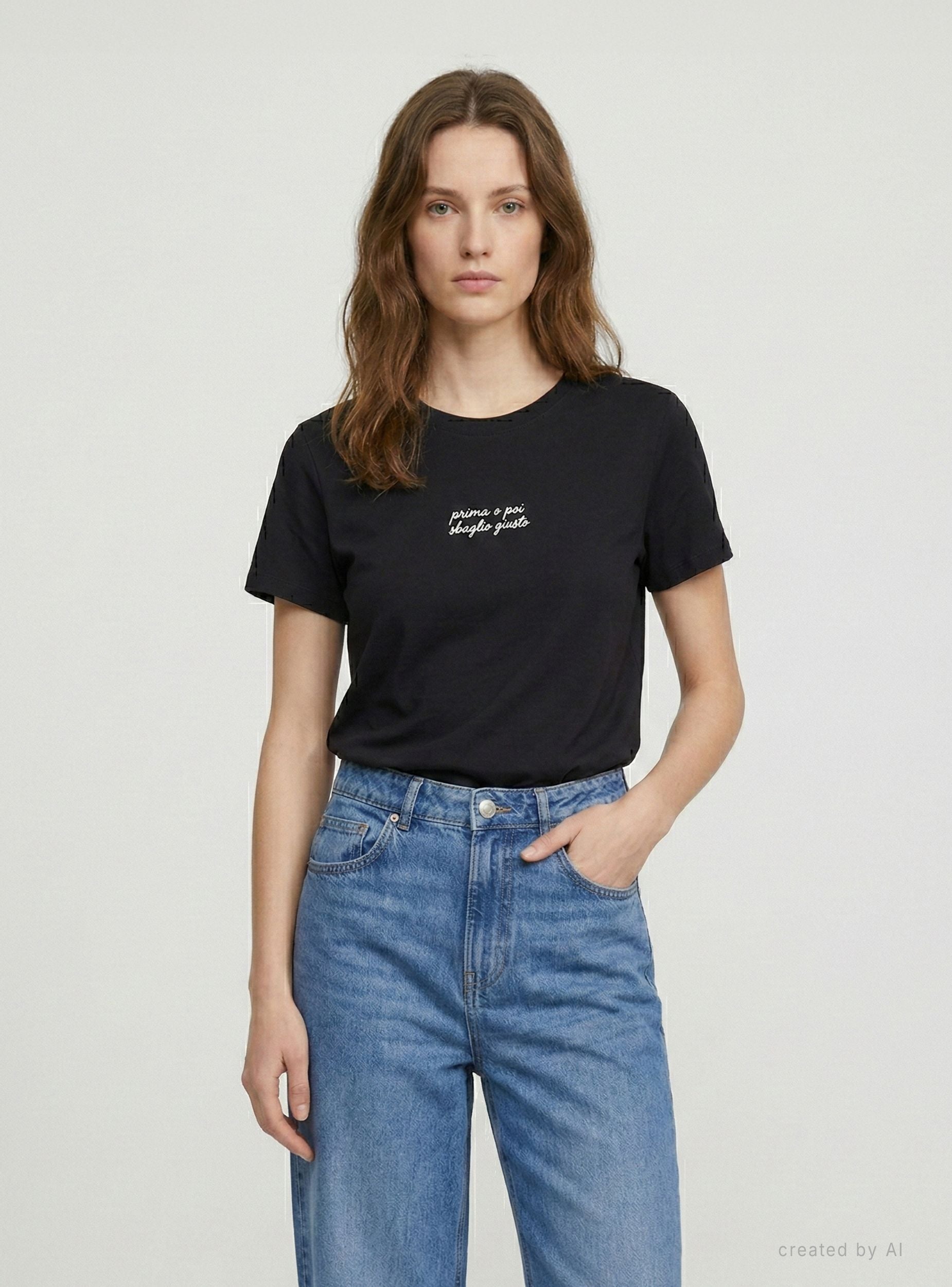 Ženska jednobojna majica sa kratkim rukavima i okruglim izrezom. Mali vez sa natpisom na grudima za ironičan i prepoznatljiv detalj. Regular kroj, idealna za ležeran izgled sa farmerkama, trenerkom ili midi suknjom. Savršena ispod lagane jakne ili duksa, nosi se svakodnevno zahvaljujući udobnosti mekanog materijala i jednostavnom kroju.