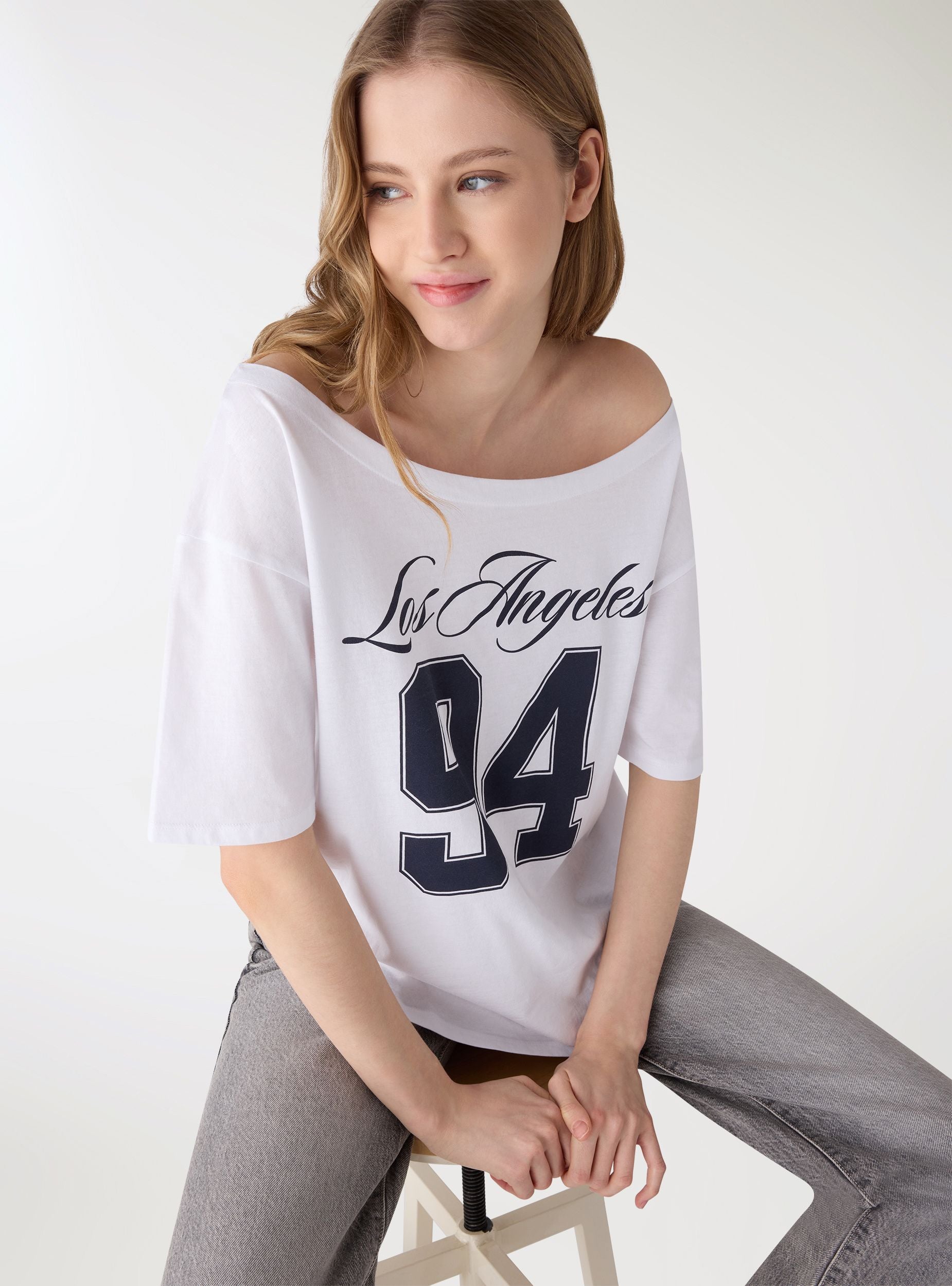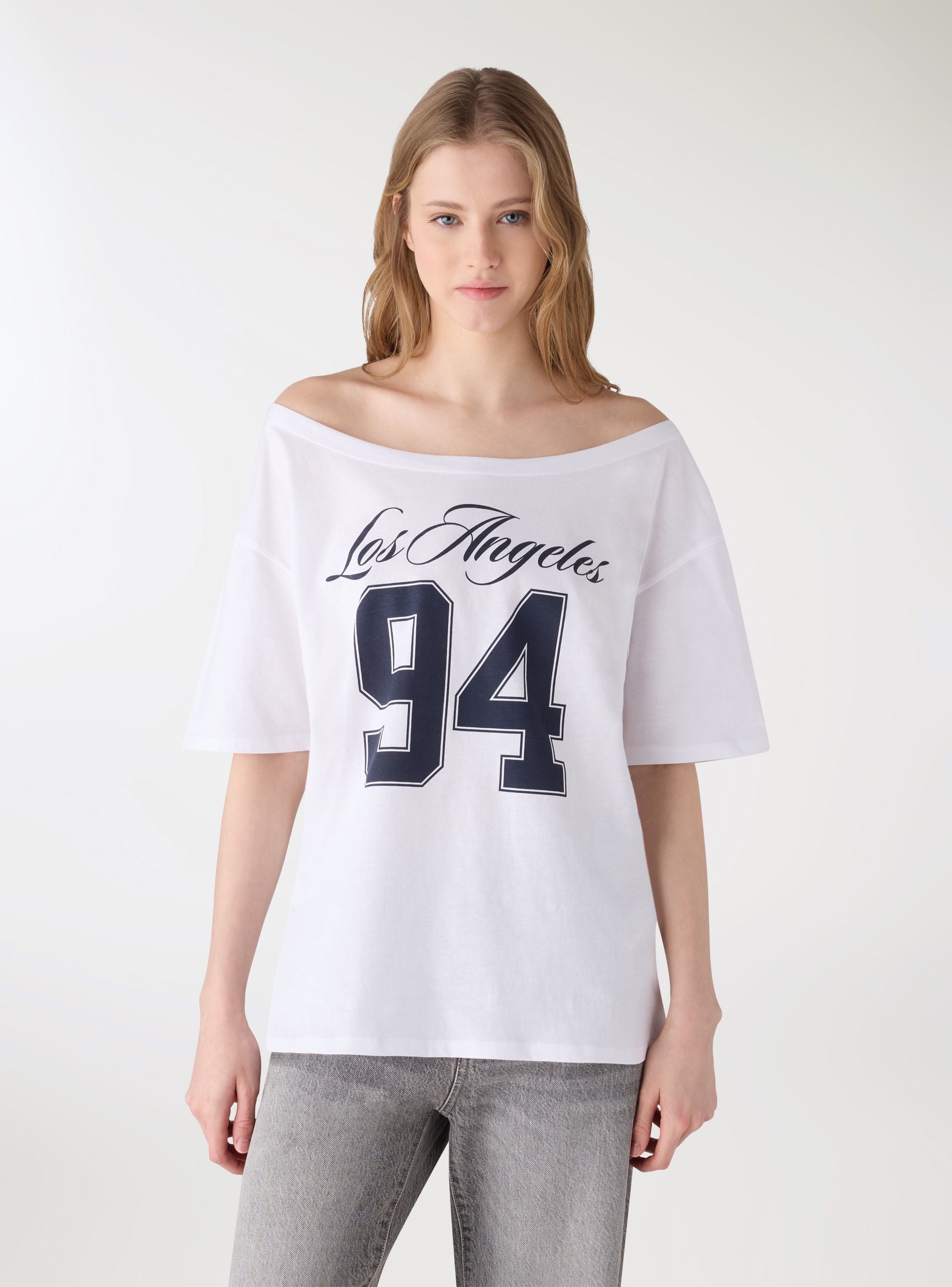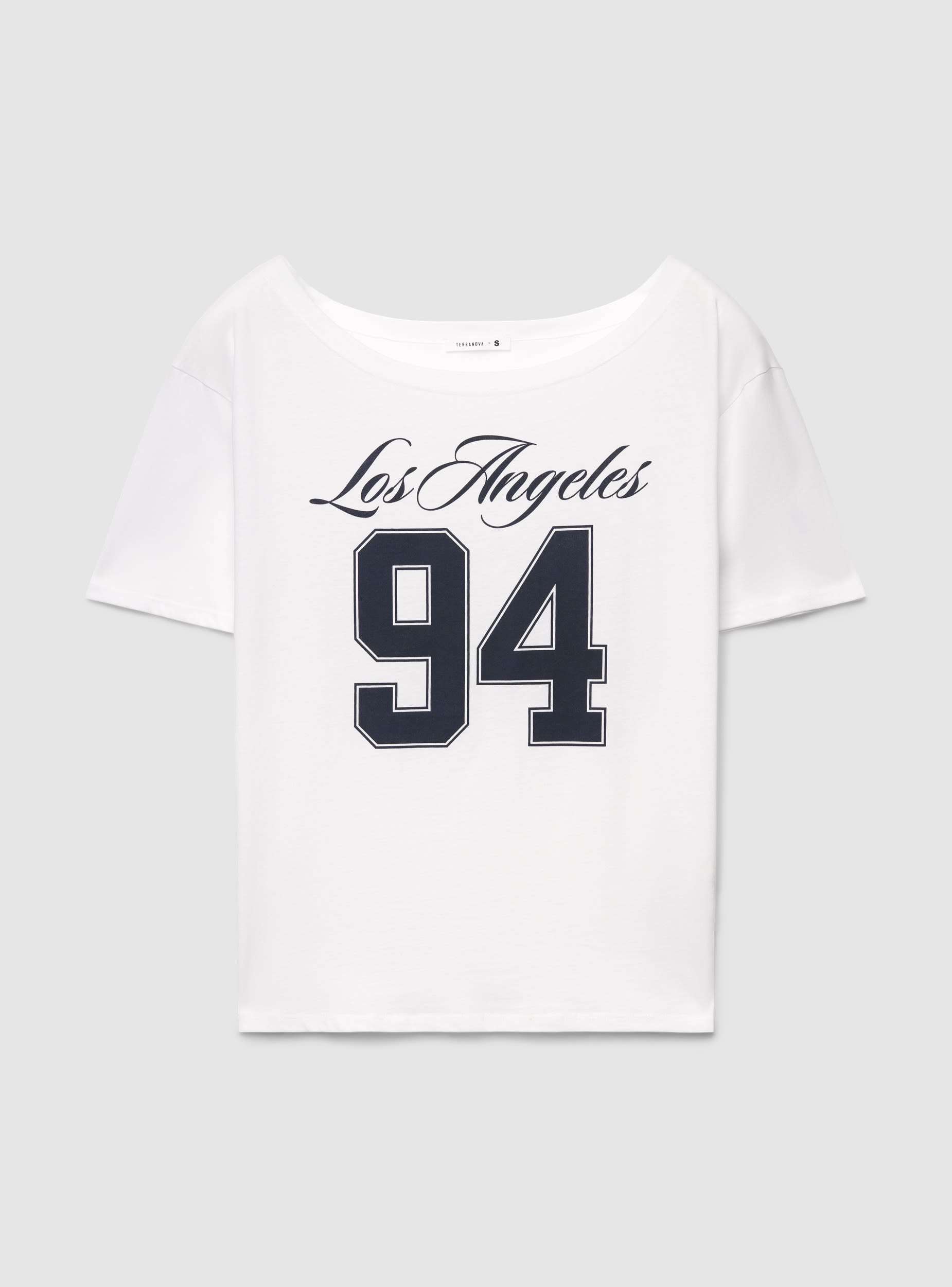 Ženska majica sa štampom u stilu koledža i natpisom sprijeda, dizajnirana za urbani izgled. Širok izrez ističe ramena, dok kratki rukavi i oversize kroj pružaju udobnost i slobodu pokreta. Lako se kombinuje sa farmerkama, šortsevima ili suknjama za slobodno vreme i neformalne izlaske, a može se upotpuniti patikama ili sandalama.Detalji