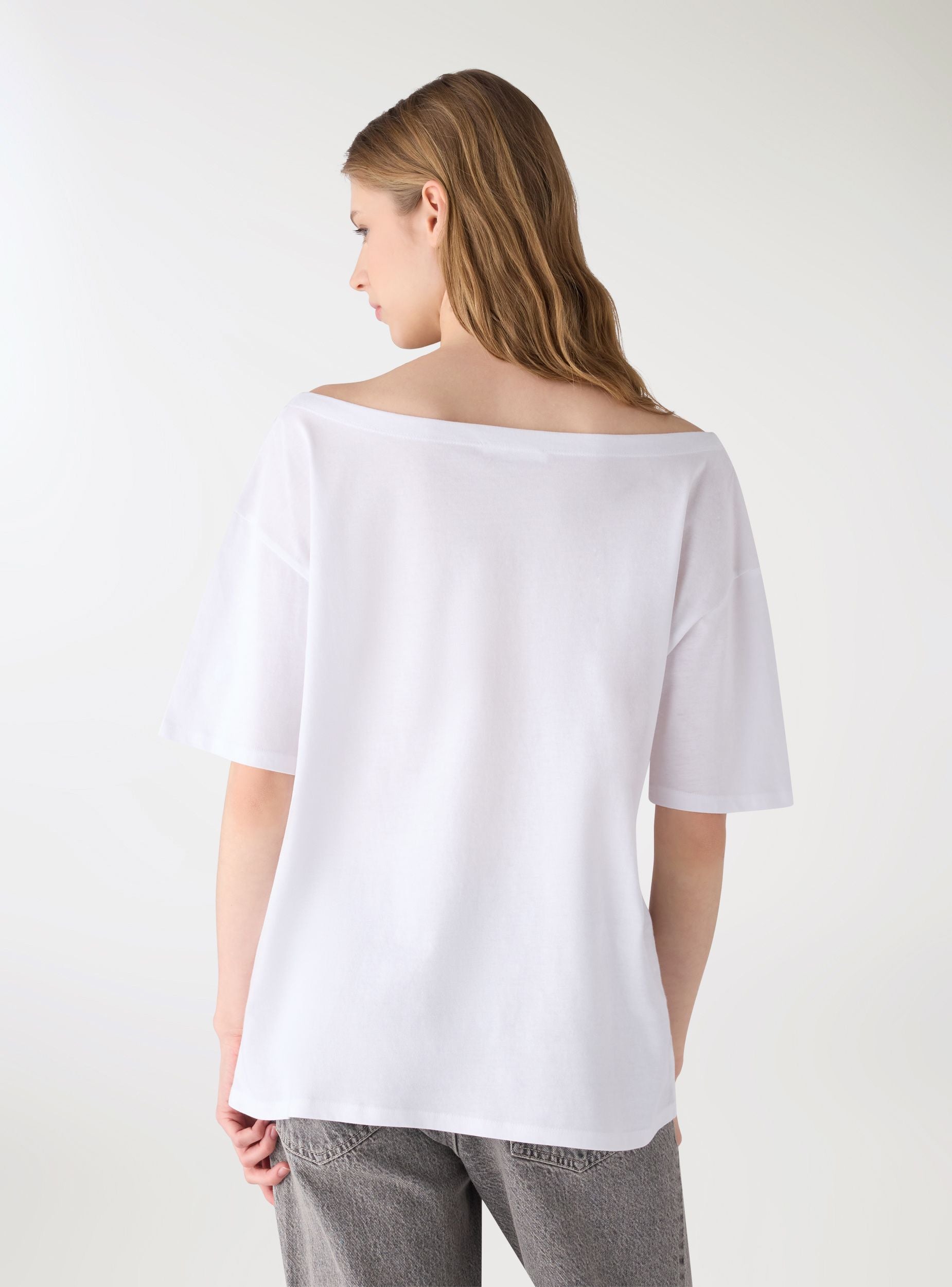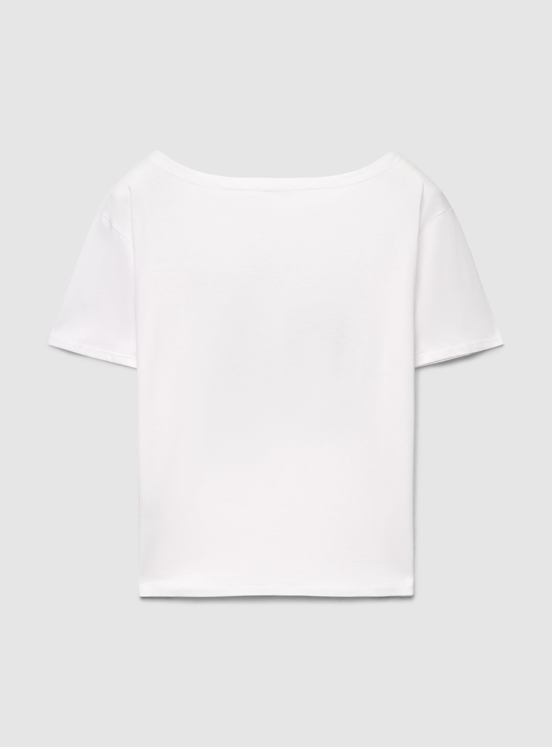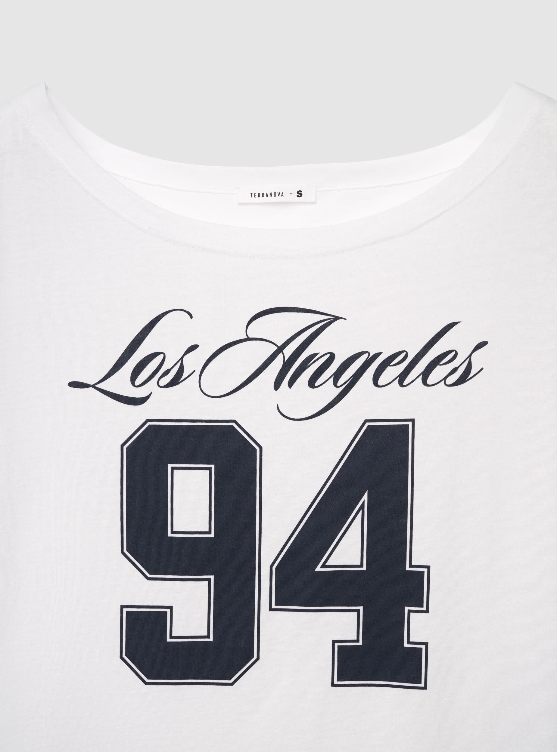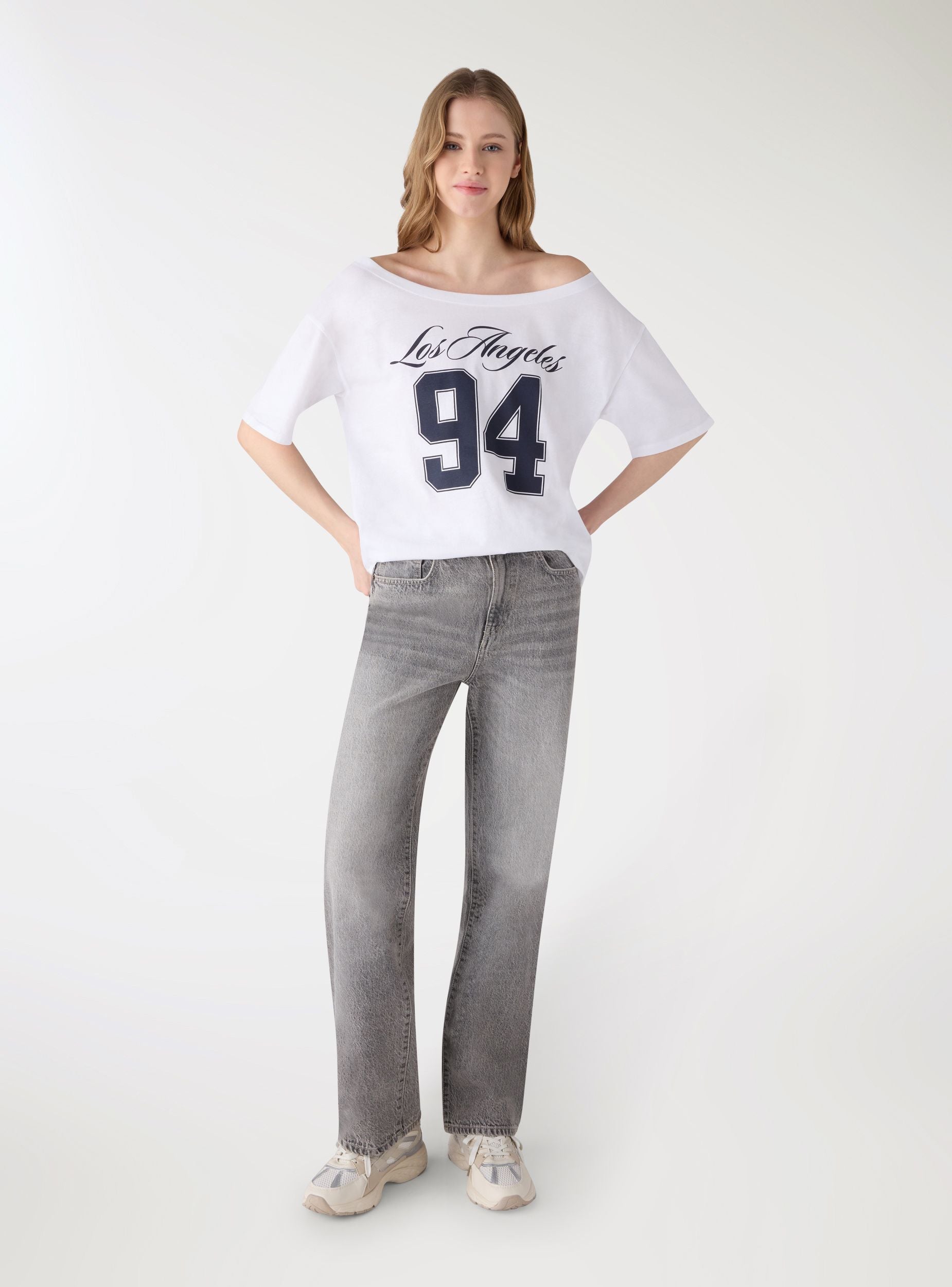 Ženska majica sa štampom u stilu koledža i natpisom sprijeda, dizajnirana za urbani izgled. Širok izrez ističe ramena, dok kratki rukavi i oversize kroj pružaju udobnost i slobodu pokreta. Lako se kombinuje sa farmerkama, šortsevima ili suknjama za slobodno vreme i neformalne izlaske, a može se upotpuniti patikama ili sandalama.Detalji
