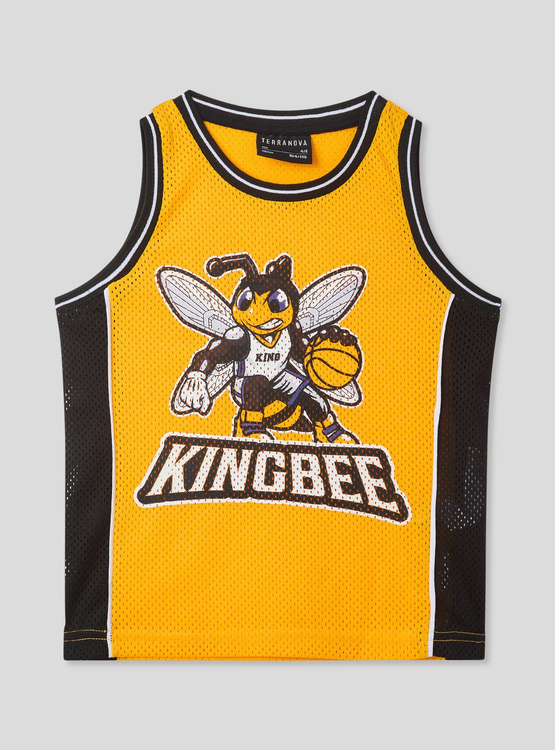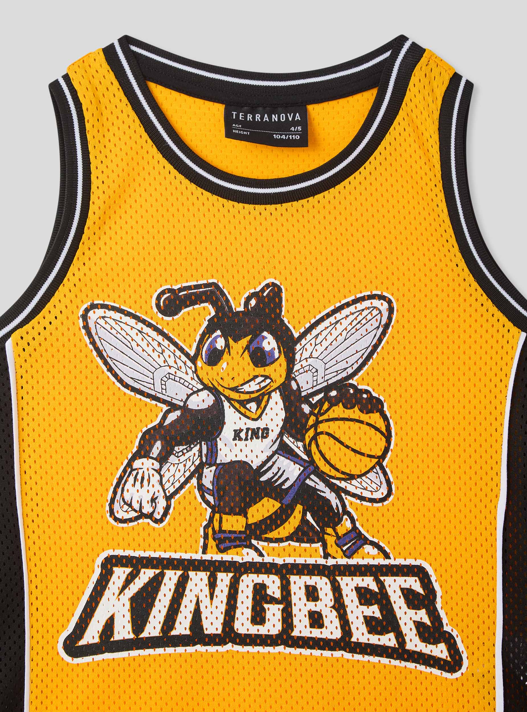 Majica za dečake savršena za ljubitelje košarke i za one koji vole sportski i energičan stil. Mrežasti dizajn garantuje laganost i prozračnost, idealno za igru i slobodno vreme. Štampa sa pčelom i loptom dodaje energičan i zabavan dodir. Idealno se kombinuje sa šortsevima i patikama za dinamičan i udoban izgled, savršeno za aktivne dane.Detalji